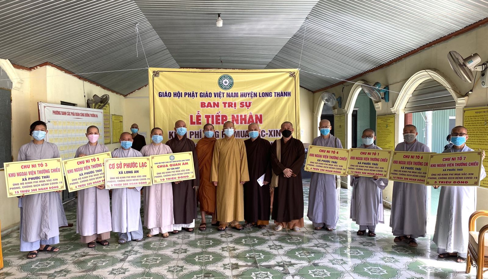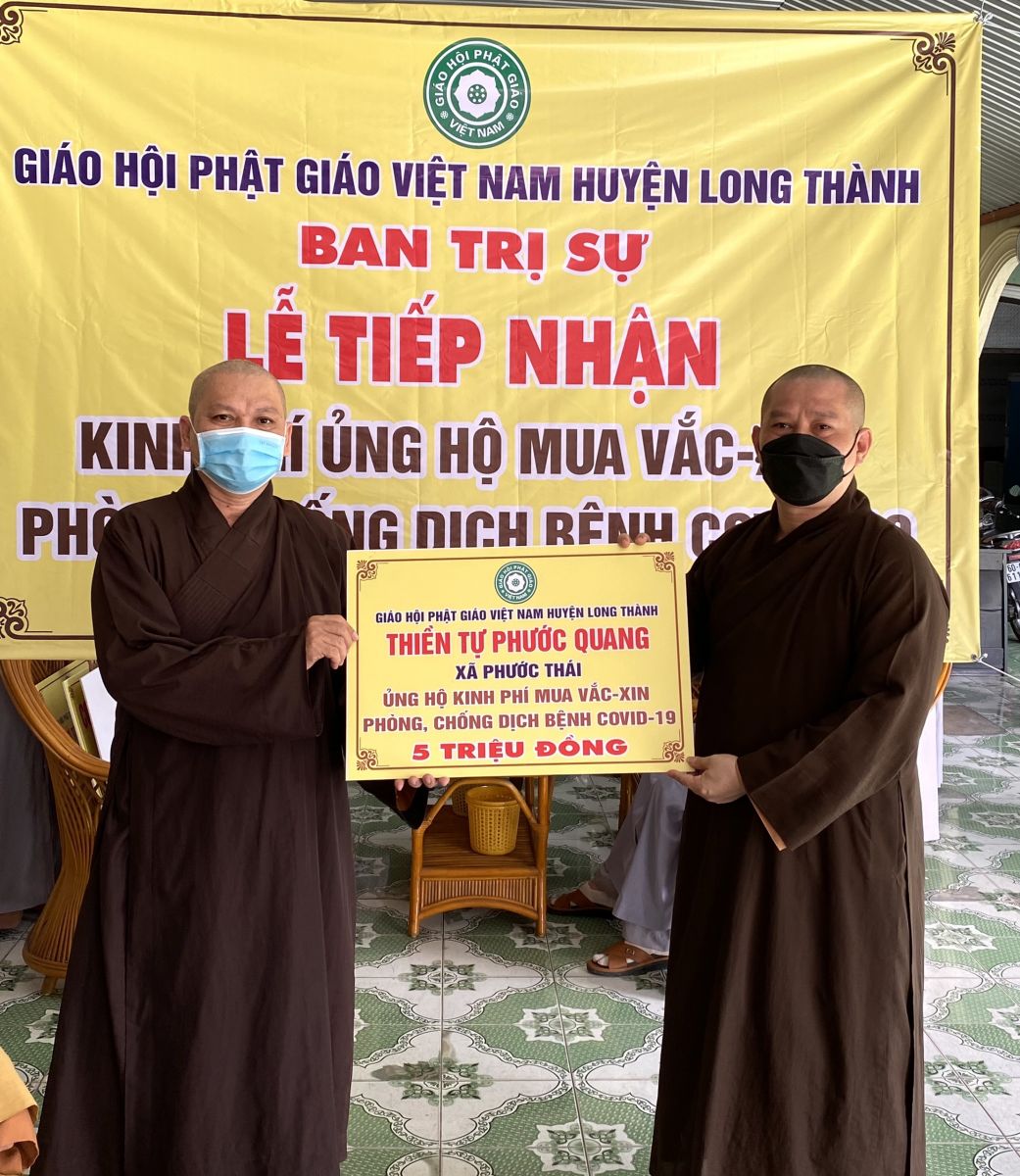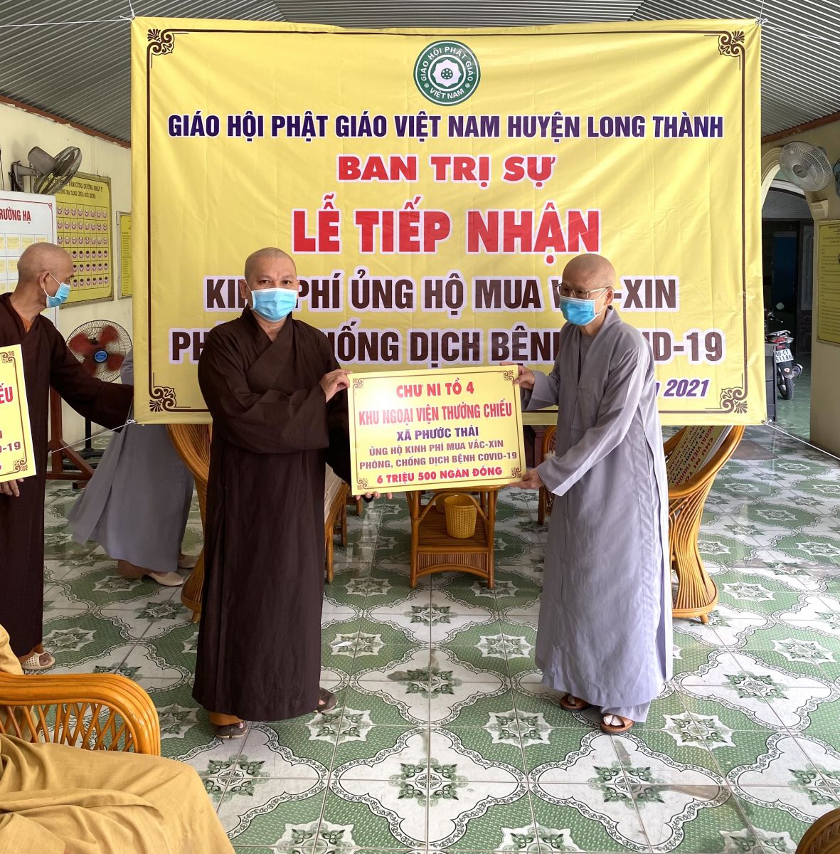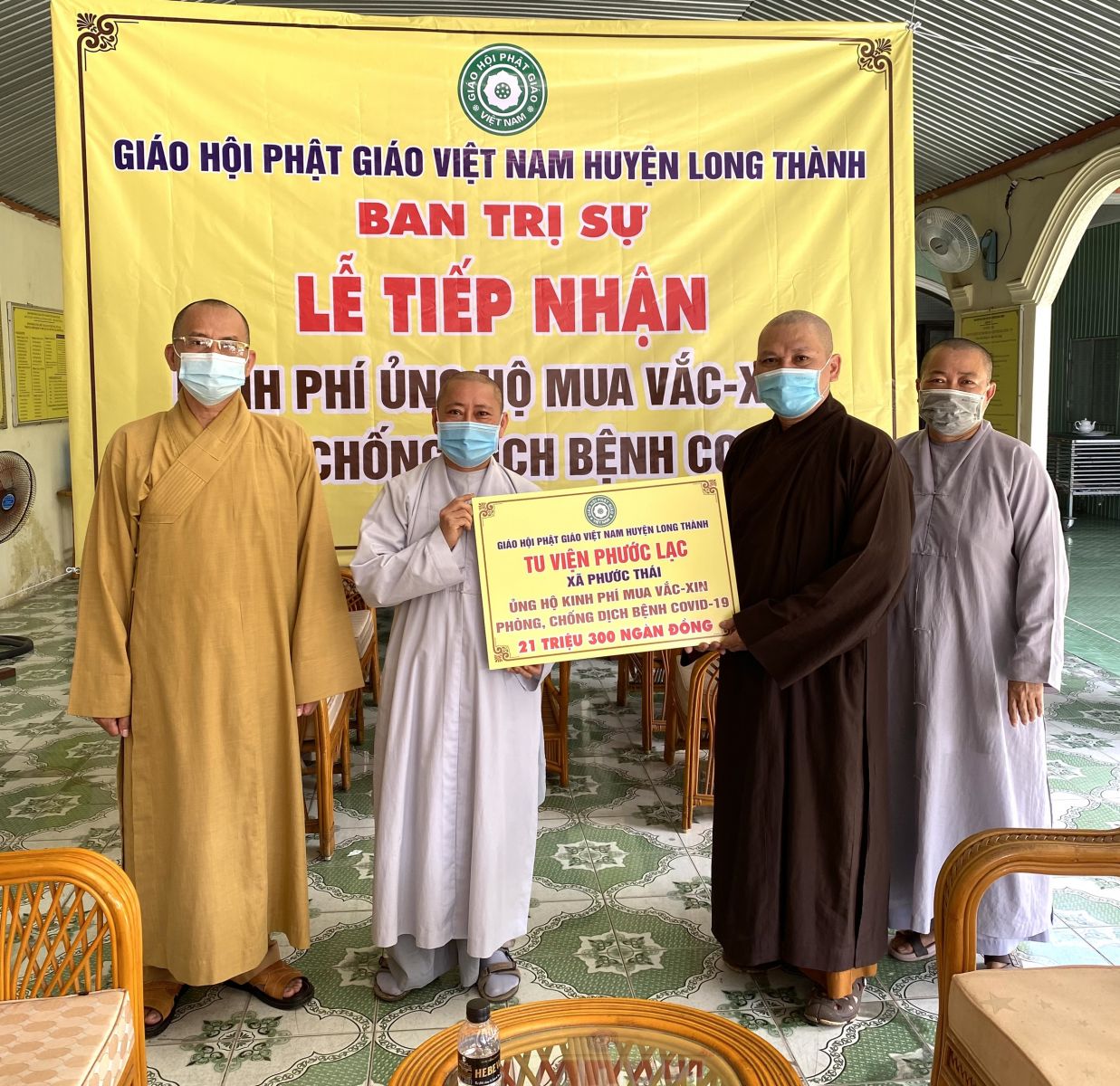 Tại buổi lễ, số tiền đóng góp nhận được các đơn vị, cơ sở Phật giáo trong huyện 350.000.000 đồng. Trước đó, viện chuyên tu xã Lộc An (Long Thành) đã ủng hộ 150.000.000 đồng; chùa Long Phước Thọ (xã Long Phước) ủng hộ 50.000.000 đồng (đã chuyển cho Ủy ban Mặt trận Tổ quốc Việt Nam tỉnh Đồng Nai); Thiền tự Phước Quang (xã Phước Thái) ủng hộ 30.000.000 đồng; Tu viện Hạnh Chiếu ủng hộ 30.000.000 đồng cho Ủy ban Mặt trận Tổ quốc Việt Nam huyện Long Thành.