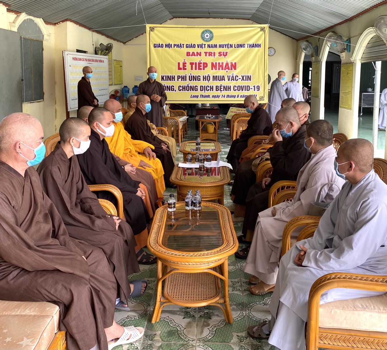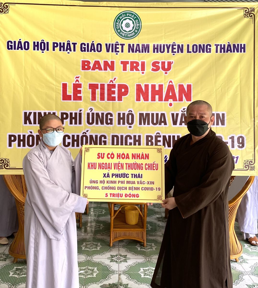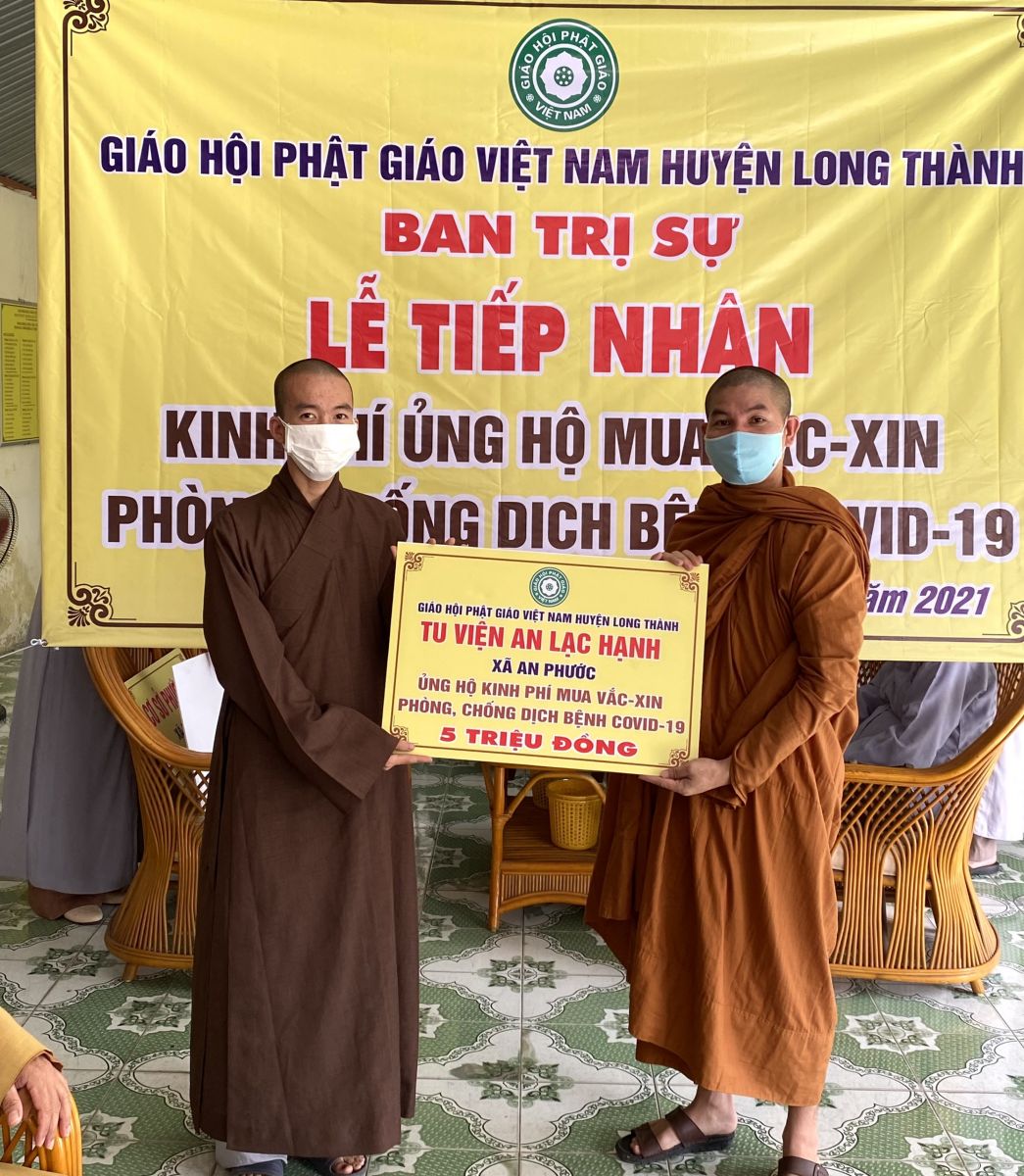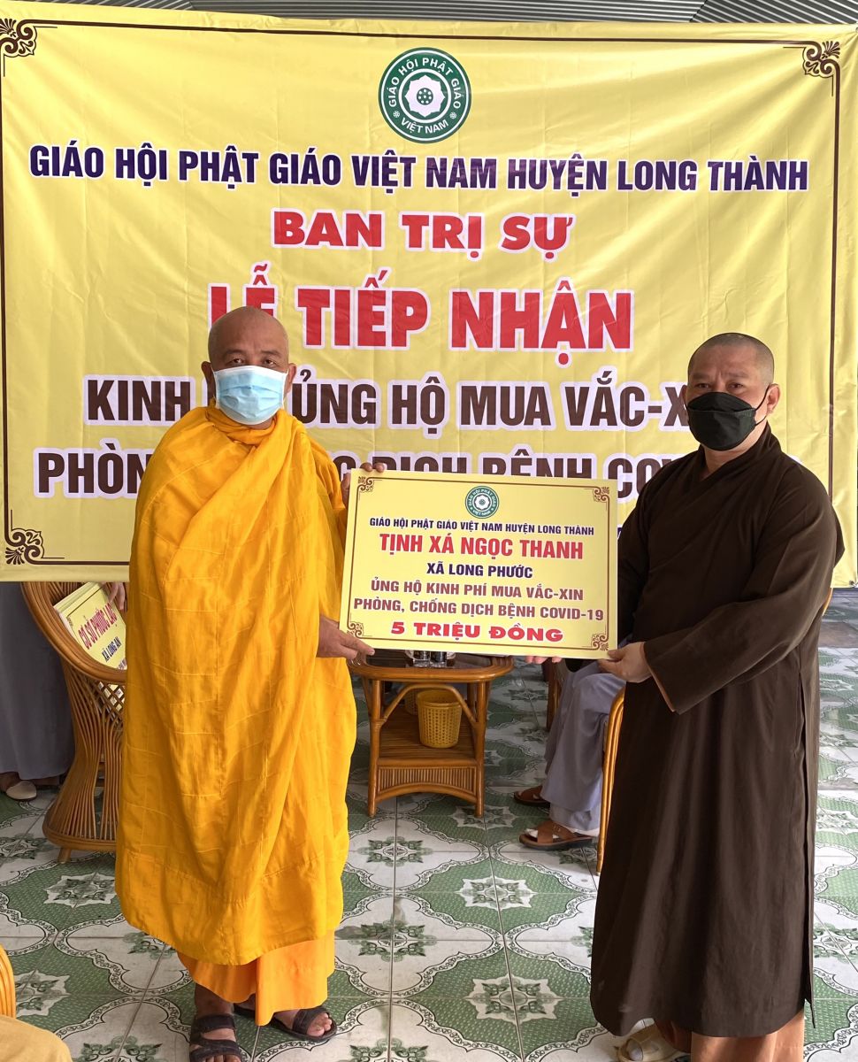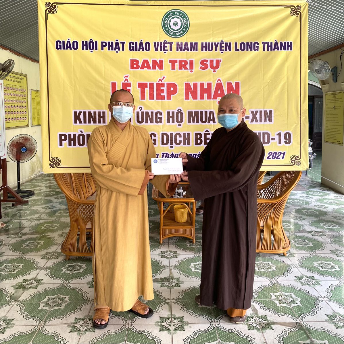 Tại buổi lễ, số tiền đóng góp nhận được các đơn vị, cơ sở Phật giáo trong huyện 350.000.000 đồng. Trước đó, viện chuyên tu xã Lộc An (Long Thành) đã ủng hộ 150.000.000 đồng; chùa Long Phước Thọ (xã Long Phước) ủng hộ 50.000.000 đồng (đã chuyển cho Ủy ban Mặt trận Tổ quốc Việt Nam tỉnh Đồng Nai); Thiền tự Phước Quang (xã Phước Thái) ủng hộ 30.000.000 đồng; Tu viện Hạnh Chiếu ủng hộ 30.000.000 đồng cho Ủy ban Mặt trận Tổ quốc Việt Nam huyện Long Thành.