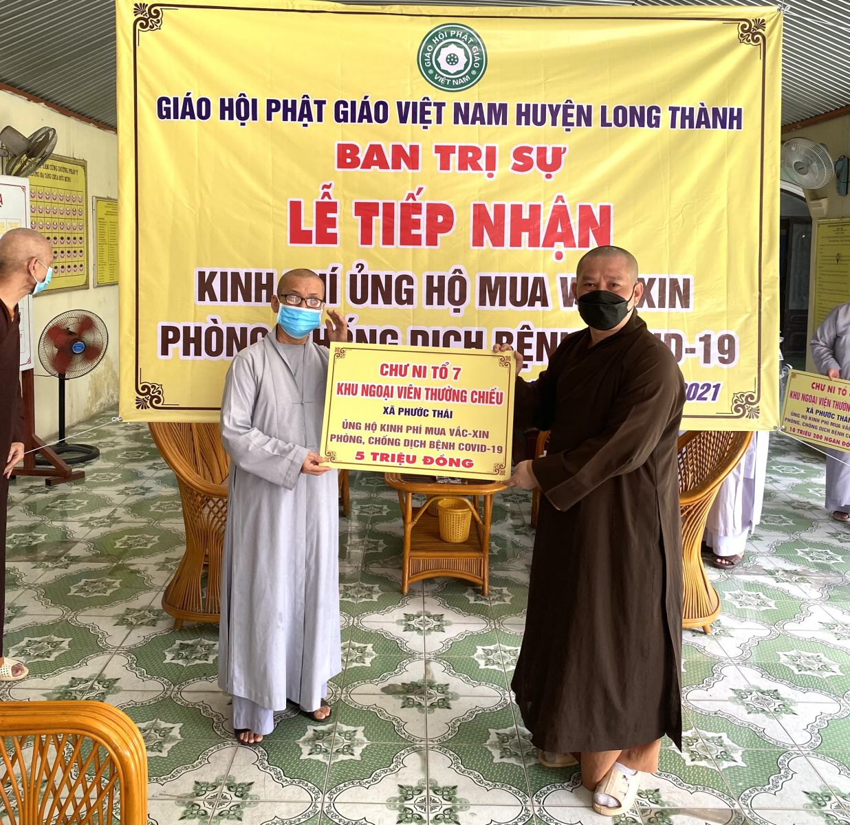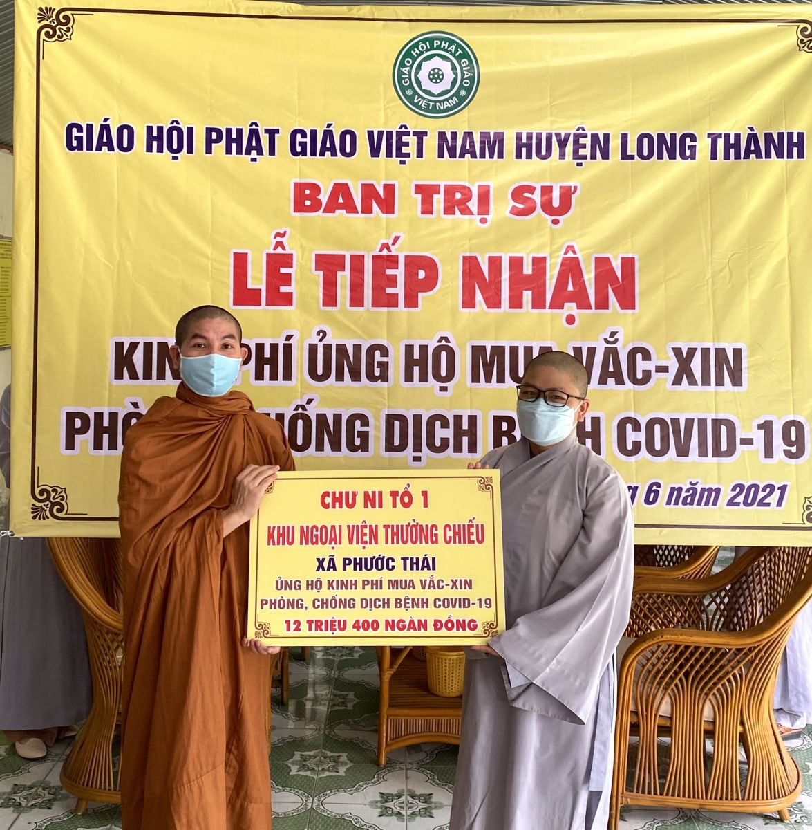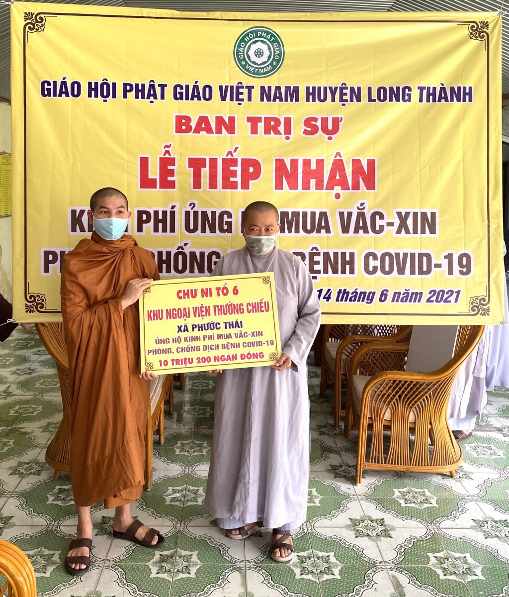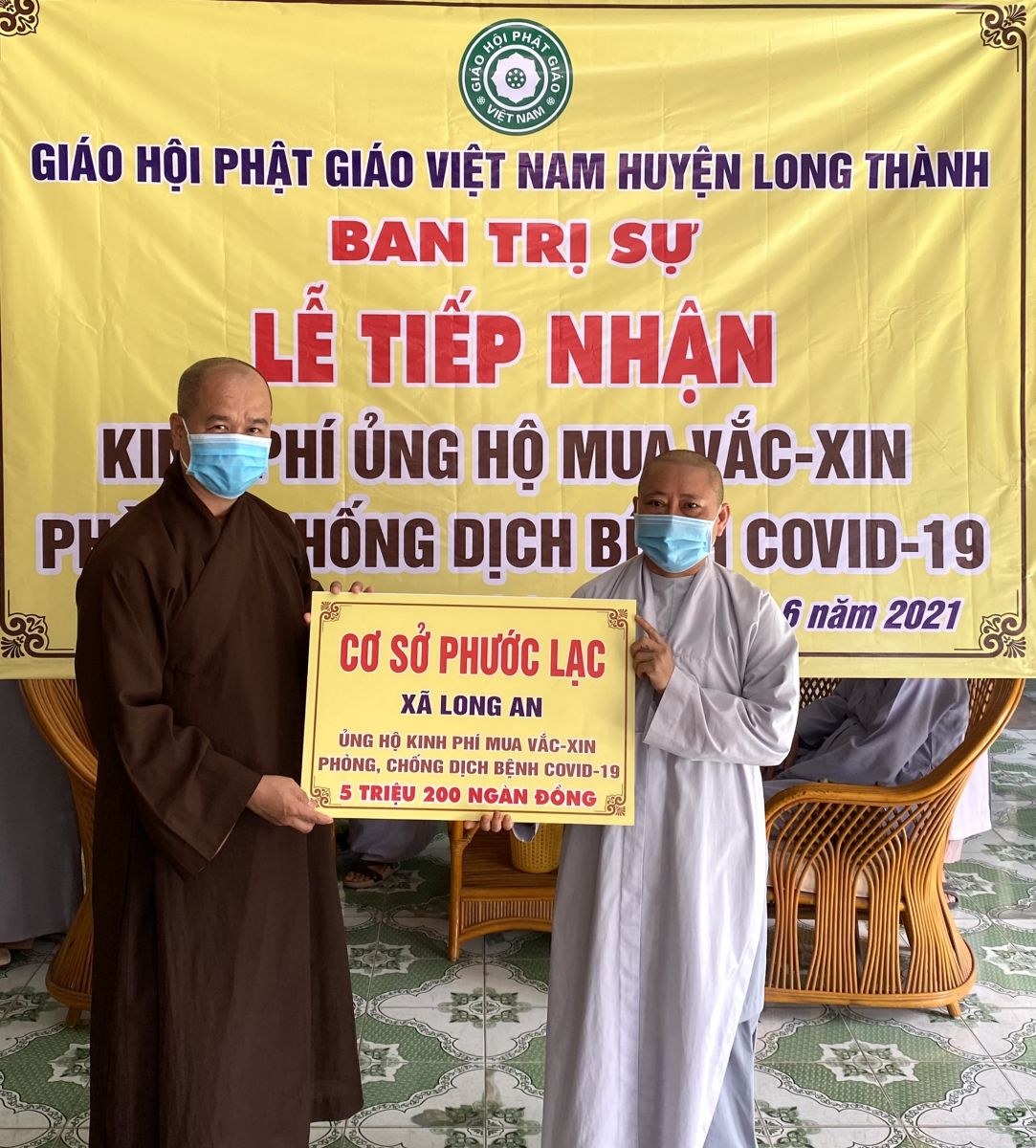 Tại buổi lễ, số tiền đóng góp nhận được các đơn vị, cơ sở Phật giáo trong huyện 350.000.000 đồng. Trước đó, viện chuyên tu xã Lộc An (Long Thành) đã ủng hộ 150.000.000 đồng; chùa Long Phước Thọ (xã Long Phước) ủng hộ 50.000.000 đồng (đã chuyển cho Ủy ban Mặt trận Tổ quốc Việt Nam tỉnh Đồng Nai); Thiền tự Phước Quang (xã Phước Thái) ủng hộ 30.000.000 đồng; Tu viện Hạnh Chiếu ủng hộ 30.000.000 đồng cho Ủy ban Mặt trận Tổ quốc Việt Nam huyện Long Thành.