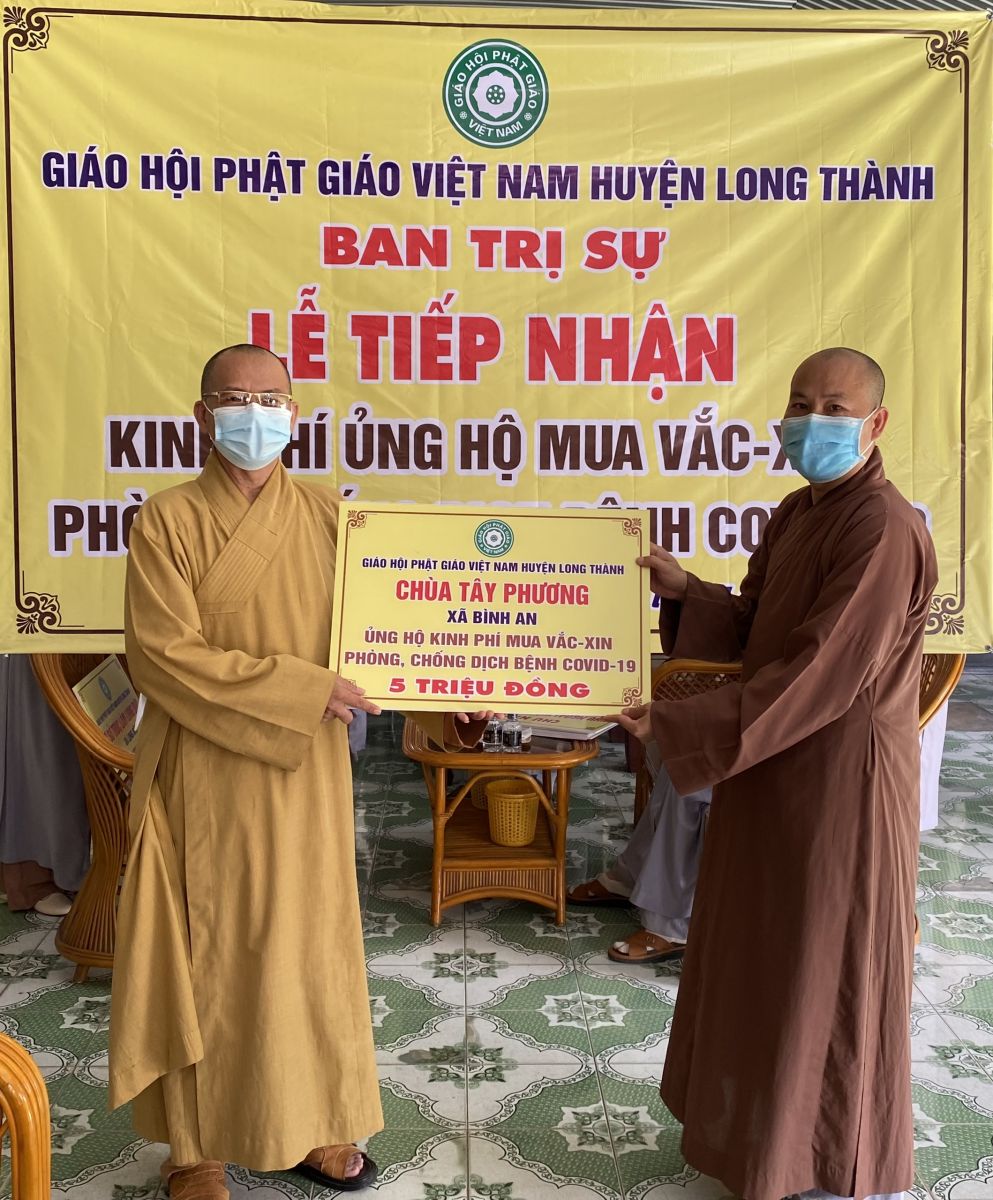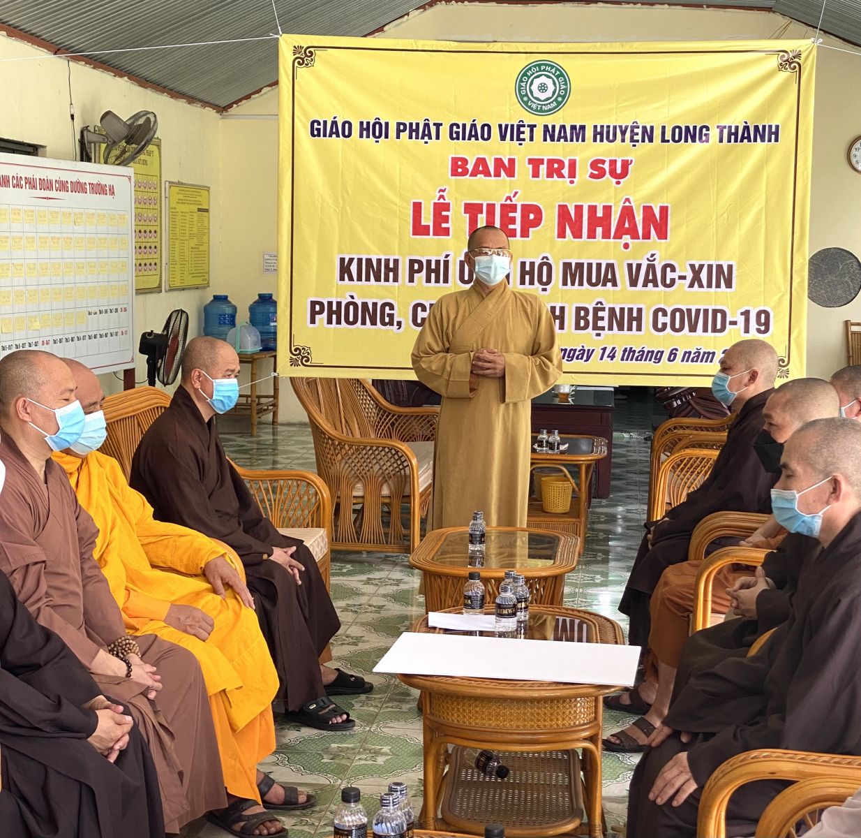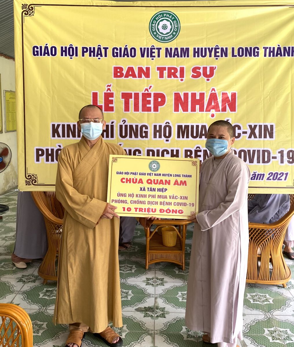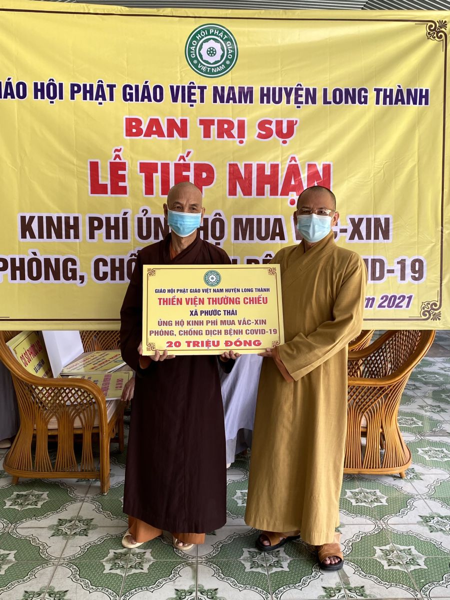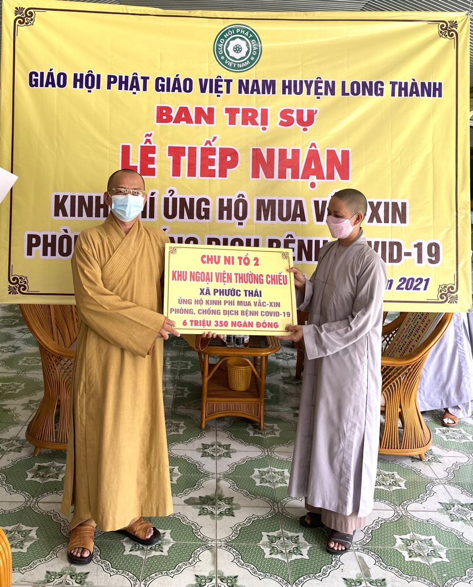 Tại buổi lễ, số tiền đóng góp nhận được các đơn vị, cơ sở Phật giáo trong huyện 350.000.000 đồng. Trước đó, viện chuyên tu xã Lộc An (Long Thành) đã ủng hộ 150.000.000 đồng; chùa Long Phước Thọ (xã Long Phước) ủng hộ 50.000.000 đồng (đã chuyển cho Ủy ban Mặt trận Tổ quốc Việt Nam tỉnh Đồng Nai); Thiền tự Phước Quang (xã Phước Thái) ủng hộ 30.000.000 đồng; Tu viện Hạnh Chiếu ủng hộ 30.000.000 đồng cho Ủy ban Mặt trận Tổ quốc Việt Nam huyện Long Thành.