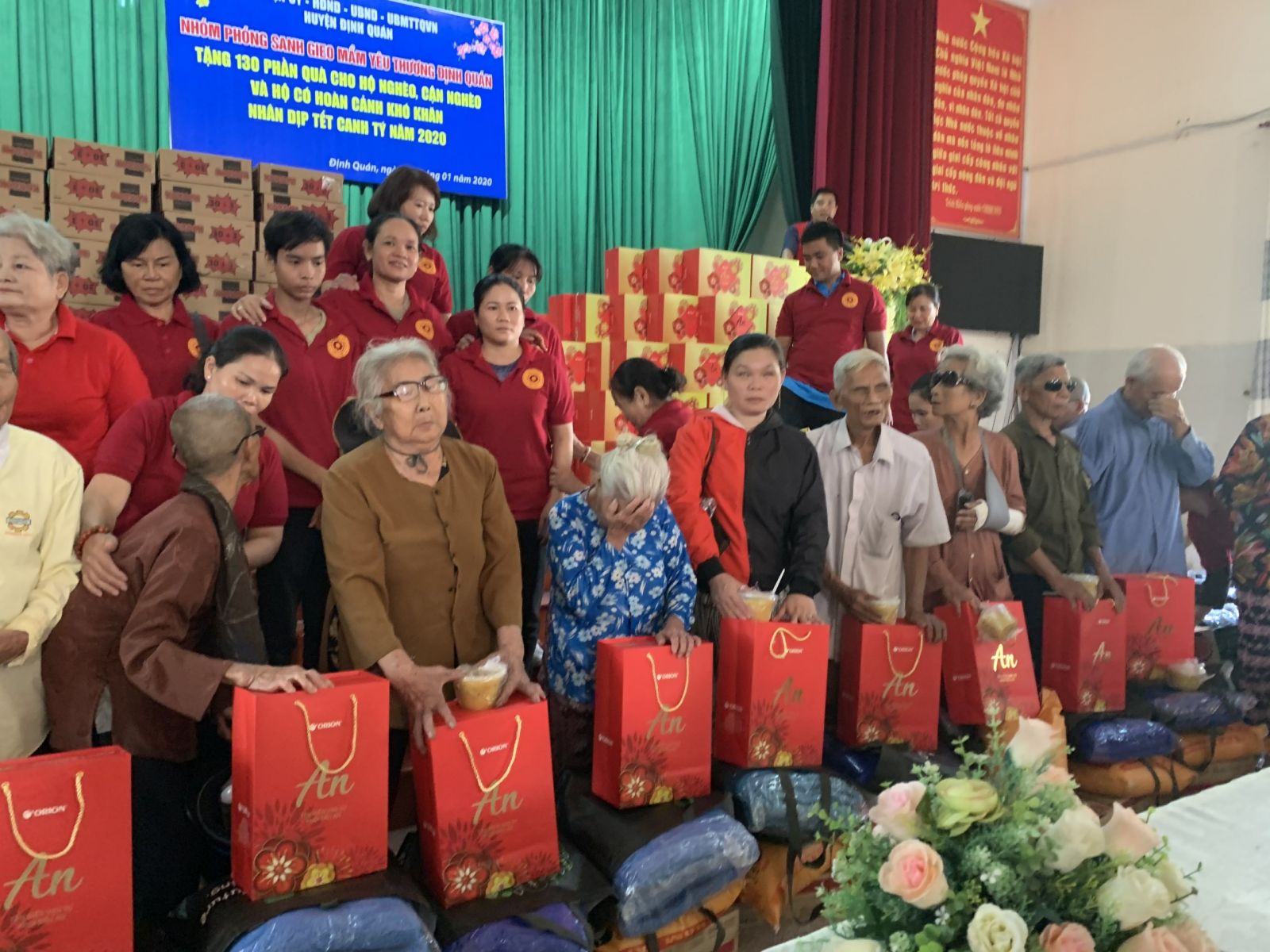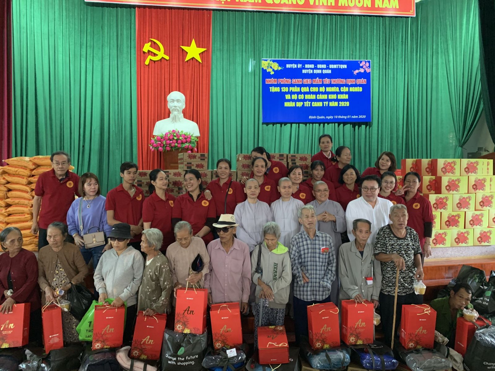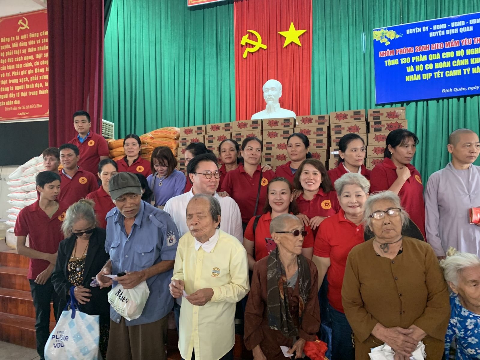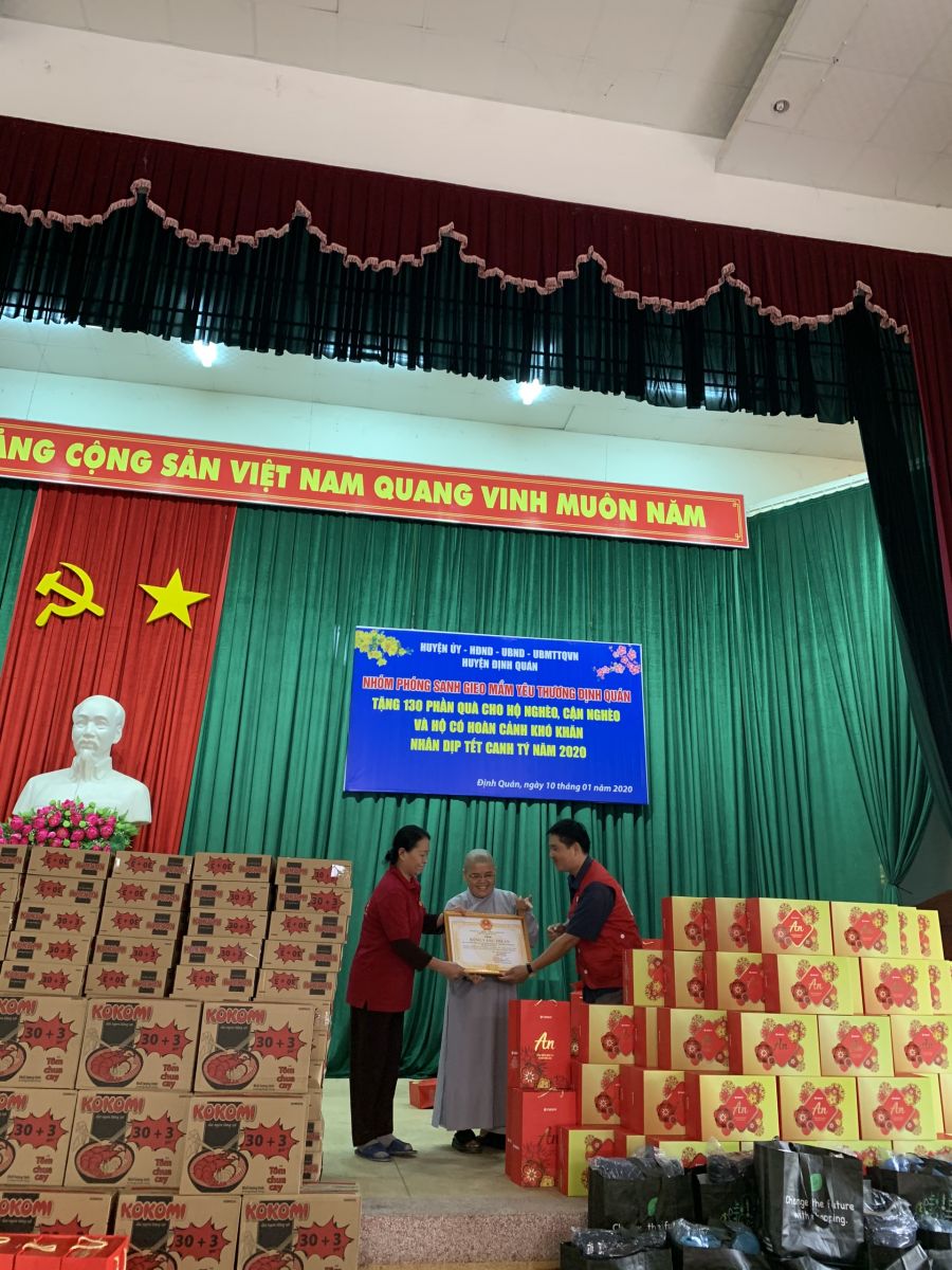Nhóm Phóng sanh Gieo mầm yêu thương Định Quán đã trao tặng 130 phần quà. Mỗi phần gồm có gạo, mì, dầu ăn, hộp cháo, nước trương, mền, hộp bánh và 2 bì thư Tịnh tài. Tổng giá trị các phần quà là 90 triệu đồng.