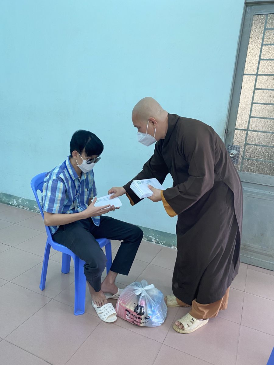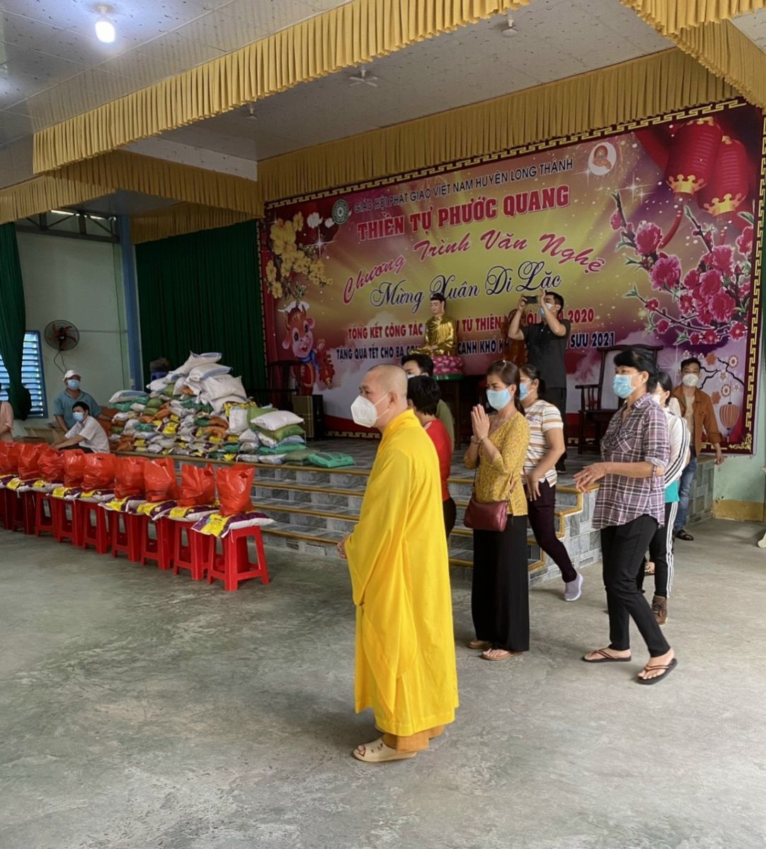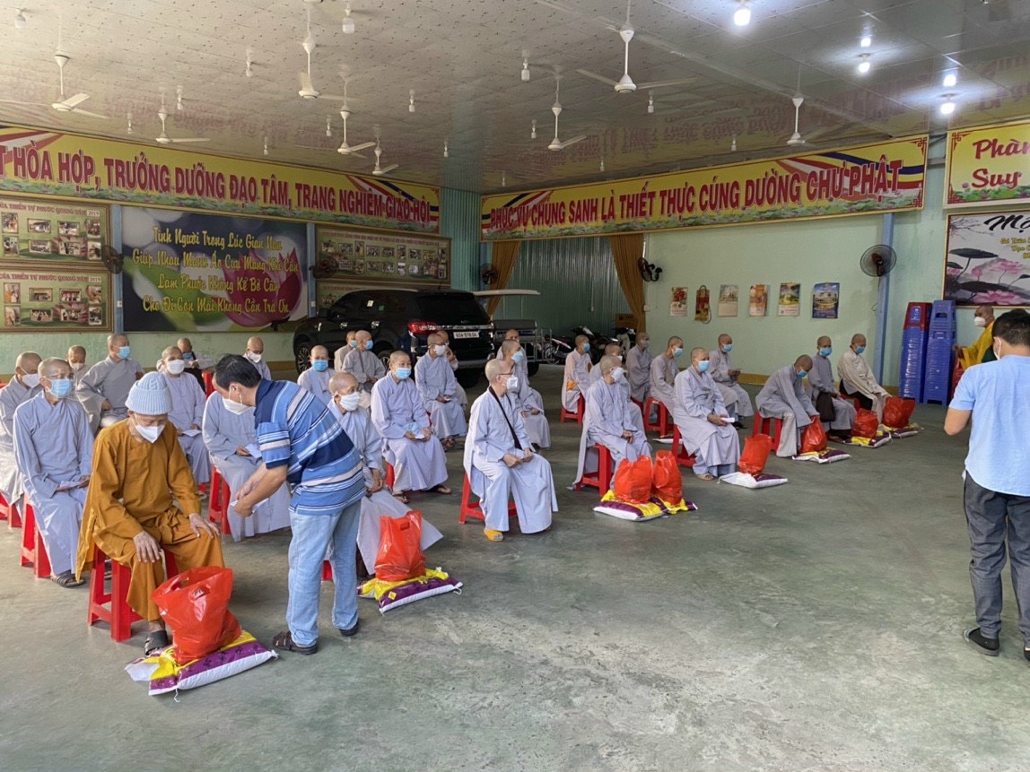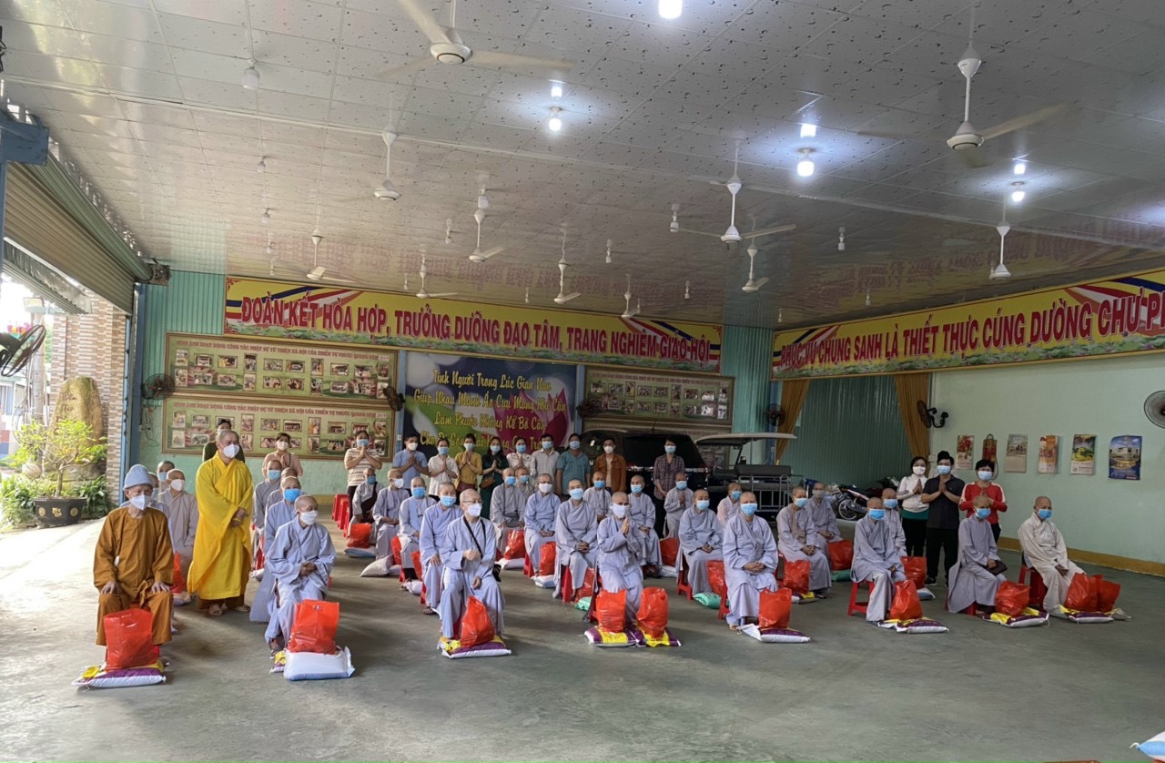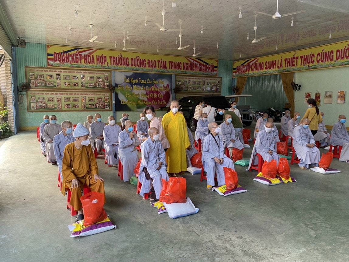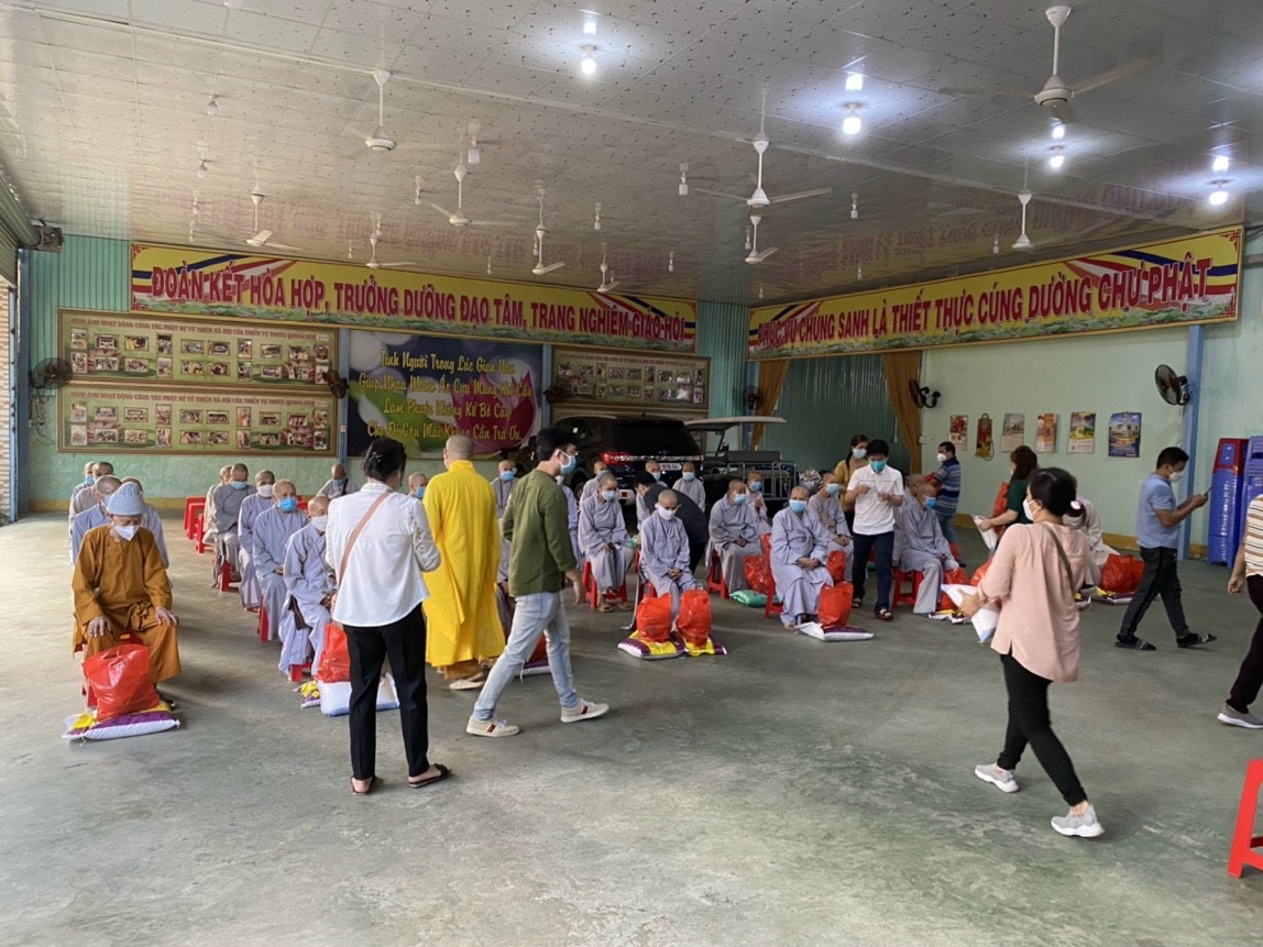 Trên cơ sở đó, đoàn đã thực hiện cúng dường hơn 100 phần quà cho chư tôn Đức Ni và 100 phần quà khác dành cho hội viên Hội Người mù tại huyện Long Thành nhằm hỗ trợ phần nào những khó khăn mà dịch bệnh Covid-19 gây ra. Tổng 200 phần quà trị giá là 80.000.000 đồng.