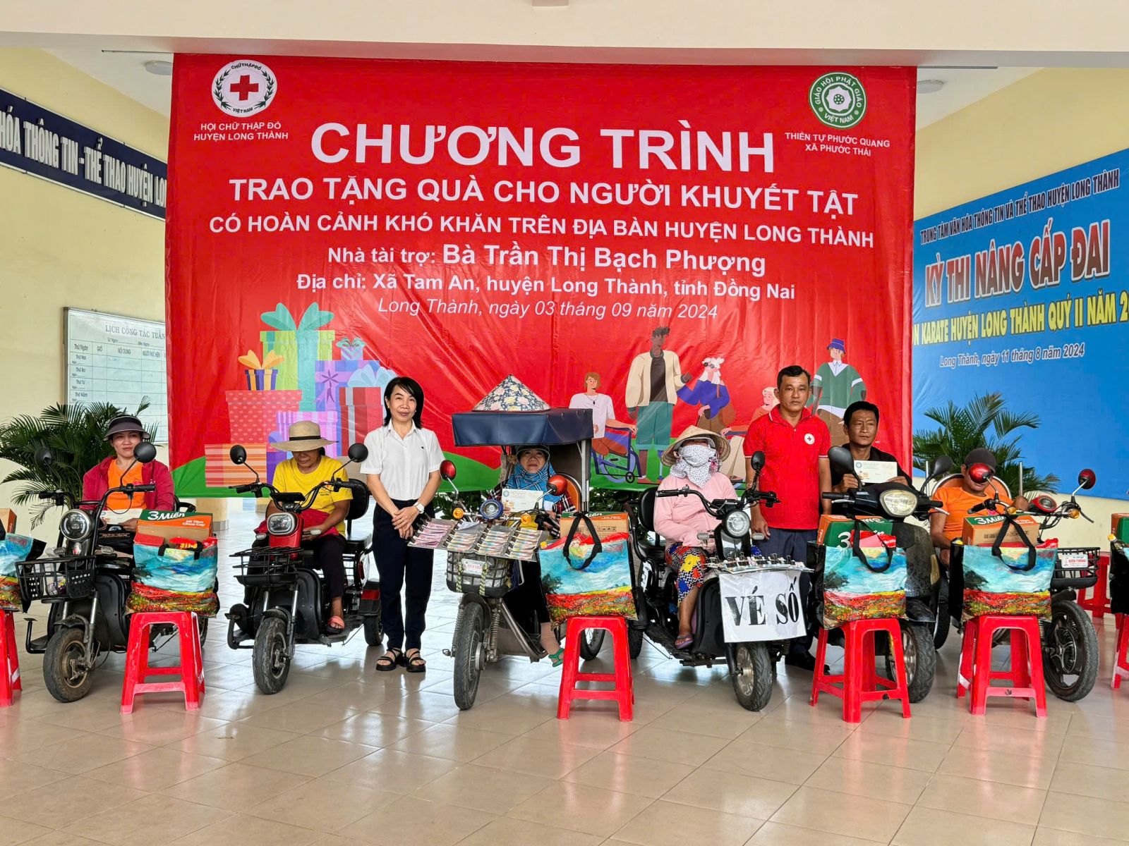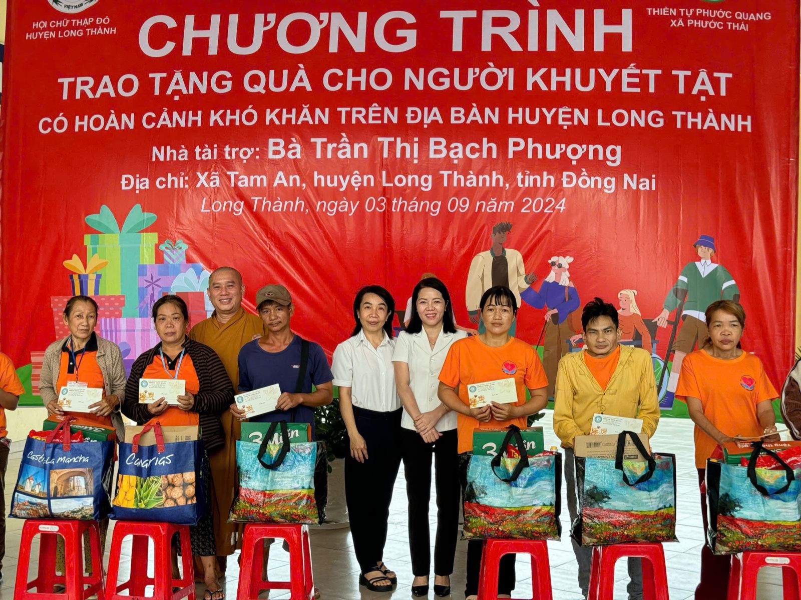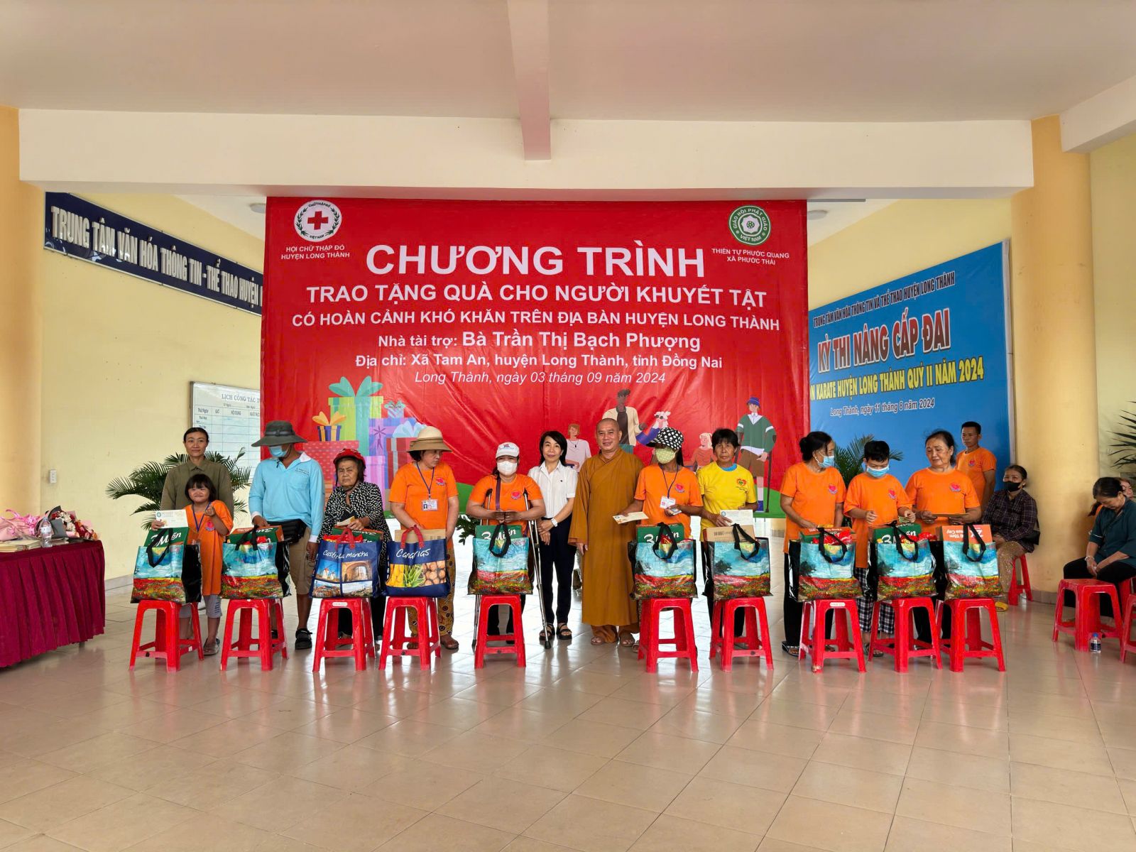 Tiếp đó, Chương trình tặng quà cho người khuyết tật có hoàn cảnh khó khăn trên địa bàn huyện Long Thành được sự tài trợ của bà Trần Thị Bạch Phượng – trú tại xã Tam An, huyện Long Thành. Chương trình đã trao tặng 150 phần quà đến bà con khó khăn trên địa bàn xã Phước Thái, Phước Bình, Tân Hiệp, Long Phước, An Phước – huyện Long Thành.