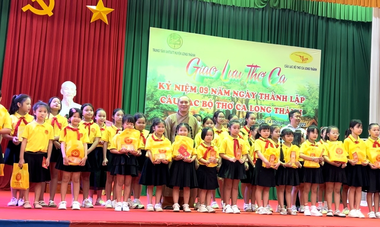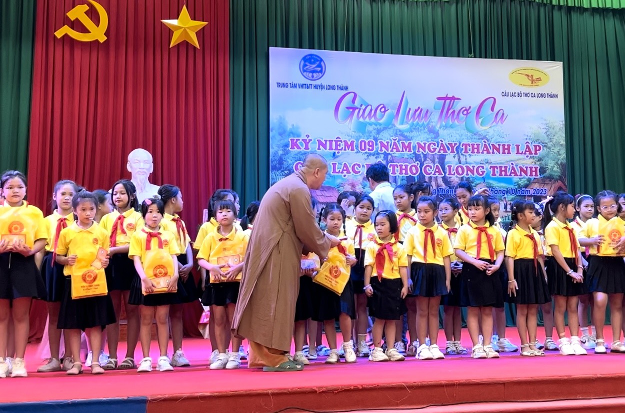 Tham dự tại chương trình kỷ niệm 09 năm thành lập câu lạc bộ Thơ ca huyện Long Thành, ĐĐ. Thích Nguyên Thông – Phó trưởng ban Thường trực ban Từ thiện xã hội tỉnh, Phó trưởng ban Kiểm soát Ban Trị sự tỉnh, Phó ban kiêm Chánh Thư ký Ban Trị sự GHPGVN huyện Long Thành, Trụ trì Thiền tự Phước Quang đã trao tặng 50 xuất học bổng cho các em học sinh trường tiểu học huyện Long Thành.