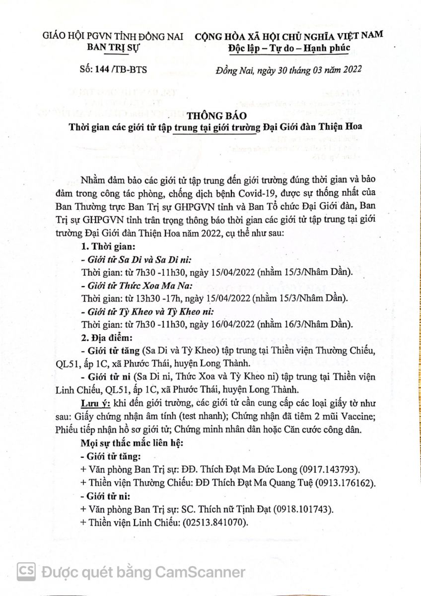 Nhằm đảm bảo các giới tử tập trung đến giới trường đúng thời gian và bảo đảm trong công tác phòng, chống dịch bệnh Covid-19, được sự thống nhất của Ban Thường trực Ban Trị sự GHPGVN tỉnh và Ban Tổ chức Đại Giới đàn, Ban Trị sự GHPGVN tỉnh trân trọng thông báo thời gian các giới tử tập trung tại giới trường Đại Giới đàn Thiện Hoa năm 2022, cụ thể như sau: