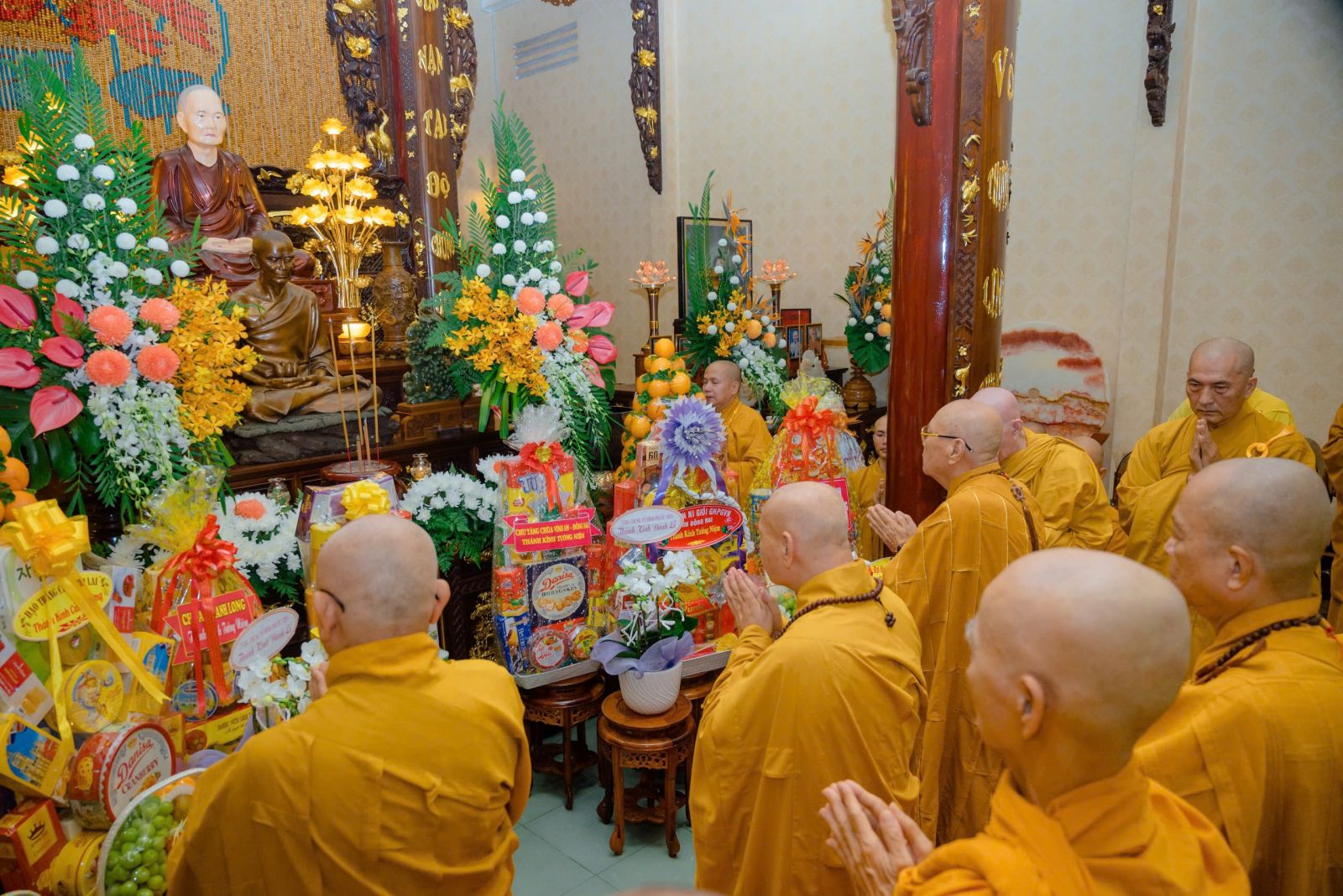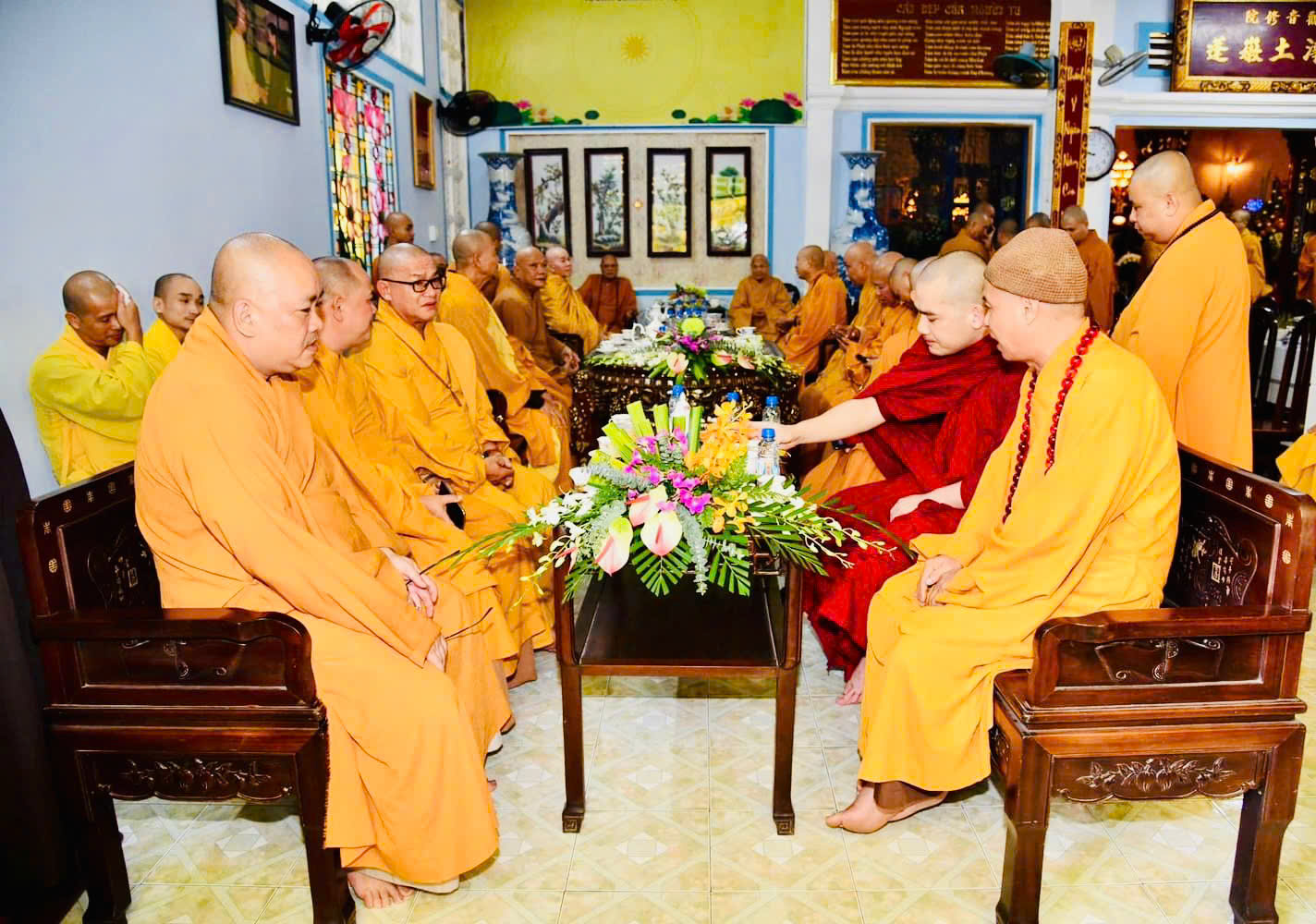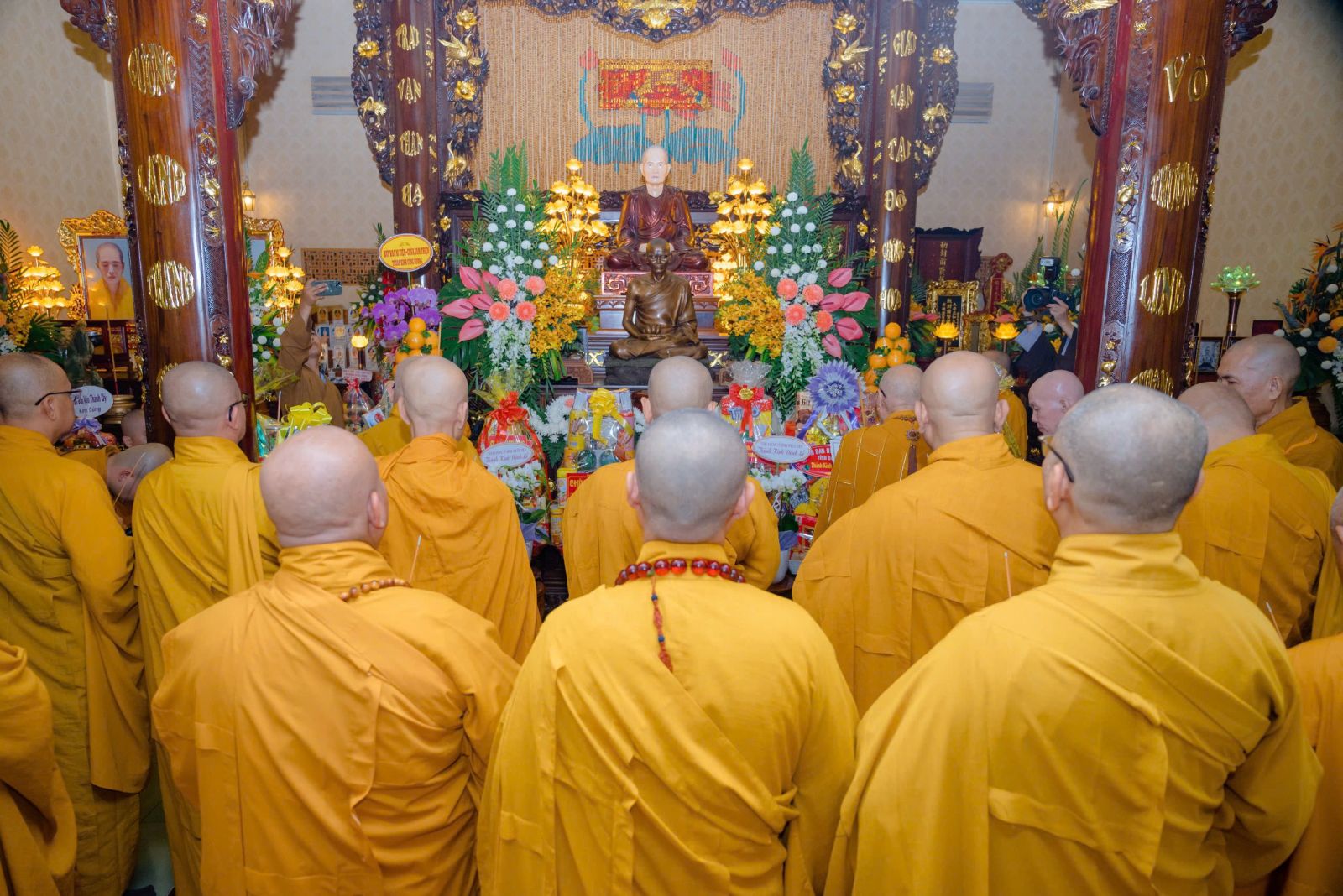 Đón tiếp quý phái đoàn đến dâng hương tưởng niệm có: HT. Thích Thiện Thảo, Trưởng ban Quản Trị Tông phong; Trưởng ban Tổ chức lễ tưởng niệm; Chư Tôn đức Phó ban Tổ chức: TT. Thích Minh Trì – Phó Ban Trị sự GHPGVN tỉnh Đồng Nai, Phó Ban Tổ chức; HT. Thích Thiện Tâm, Trụ trì chùa Pháp An; HT. Thích Thiện Kiết; HT. Thích Pháp Hỷ; HT. Thích Từ Thiện; TT. Thích Minh Vũ; TT Thích Thiện Hỷ; TT. Thích Thiện Quý – UV HĐTS, Phó trưởng BTS kiêm Chánh Thư ký Phật giáo TP. Hồ Chí Minh; Đại Đức Thích Chơn Nghĩa; TT. Thích Minh Nhựt – Trưởng BTS GHPGVN Quận Phú Nhuận; Ni trưởng Thích nữ Diệu Thọ; Ni trưởng TN. Kim Sơn; Ns. Tn Hương Nhũ; NT. Tn Diệu Thông; NT. Tn Diệu Tín; NT. Tn Lan Nhã cùng chư tôn đức Thường trực Môn phong đã trang trọng tiếp đón quý phái đoàn tại nơi lễ đường.