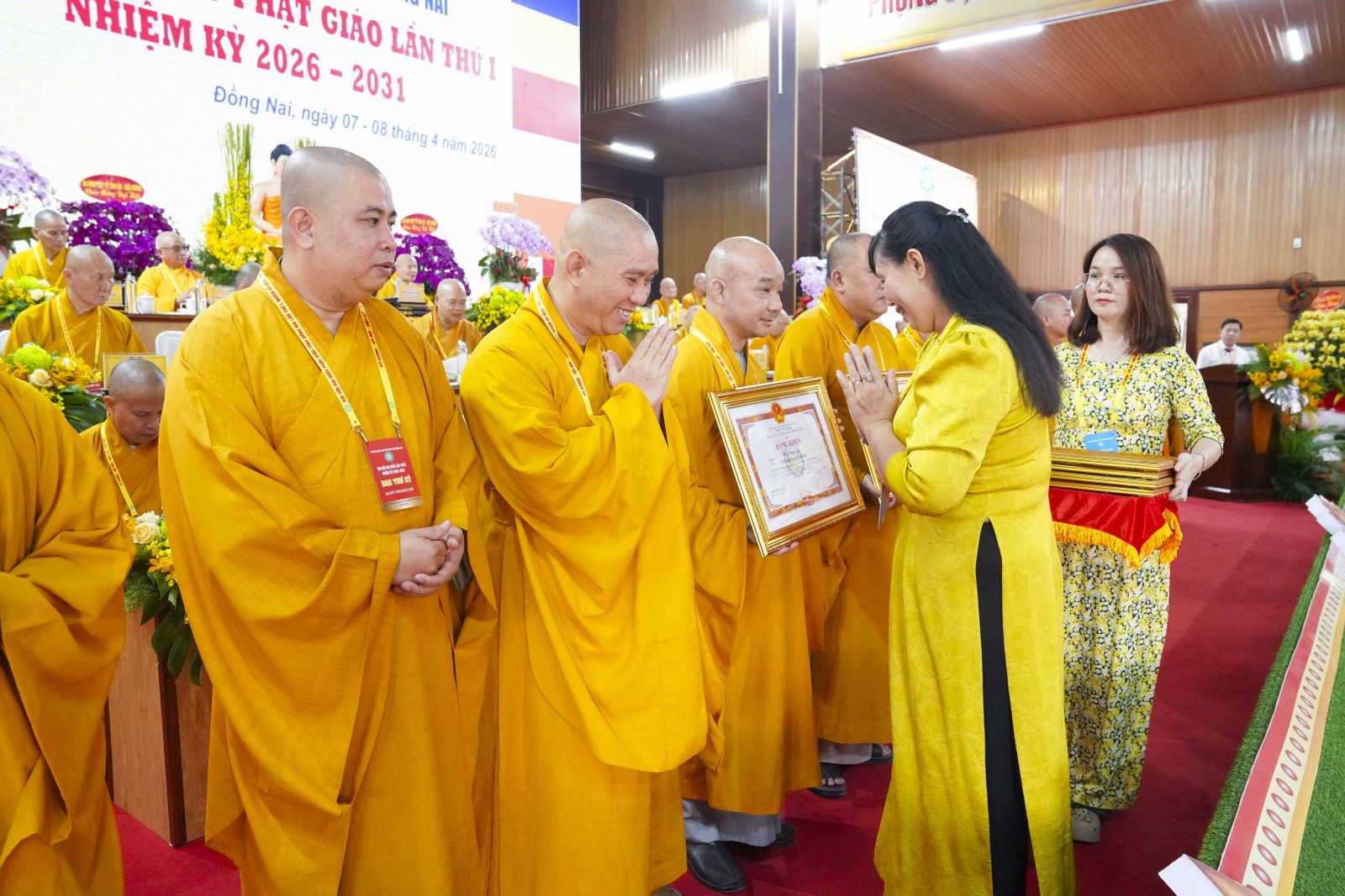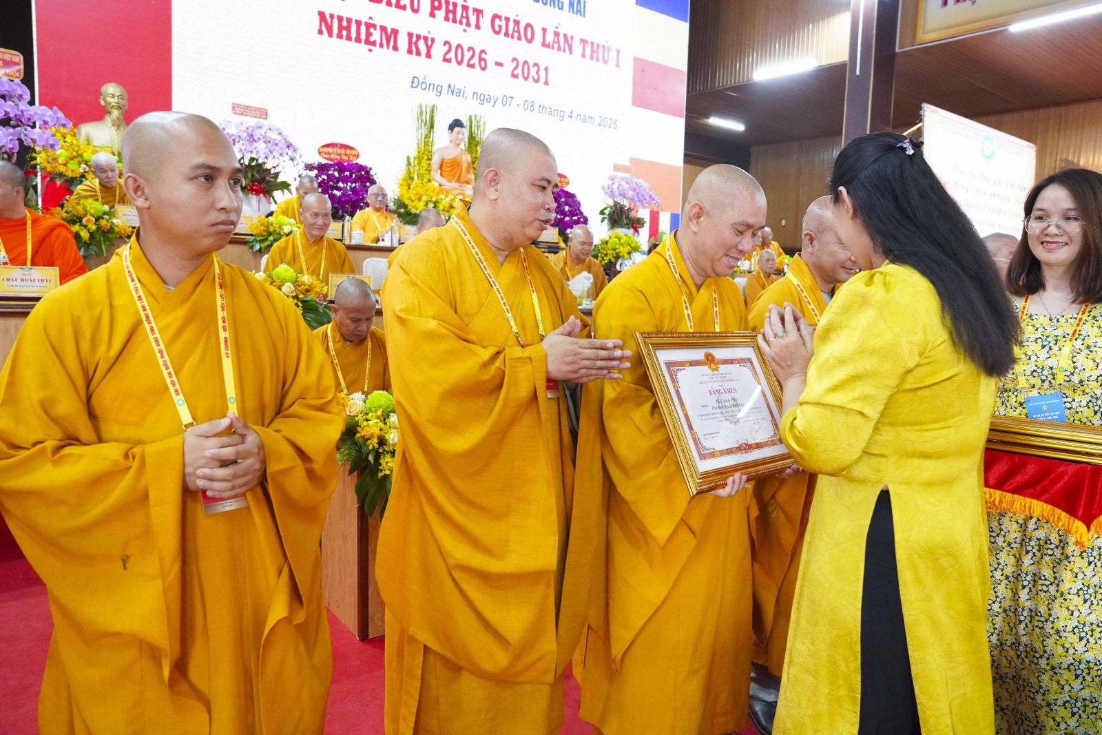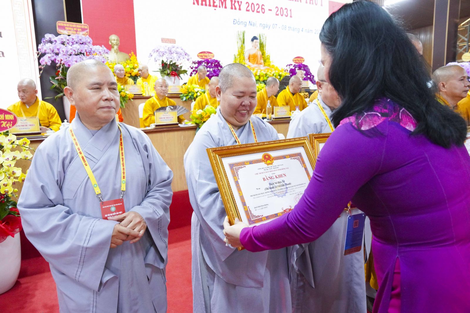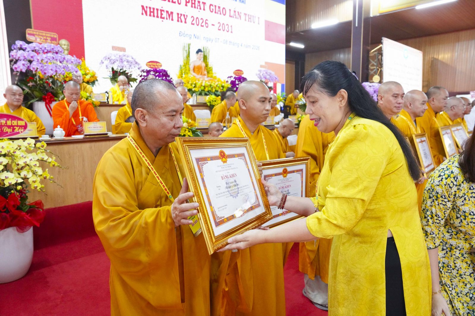 Tiếp đó, Đại đức Thích Thiện Trí thay mặt Ban Tổ chức thông qua báo cáo tóm tắt kết quả ngày làm việc thứ nhất và Lễ kỷ niệm 45 năm thành lập Giáo hội Phật giáo Việt Nam; đồng thời tiến hành trao Bằng Tuyên dương công đức của Trung ương Giáo hội cho 25 cá nhân có nhiều đóng góp tích cực, cùng Bằng khen của Ủy ban nhân dân tỉnh Đồng Nai.