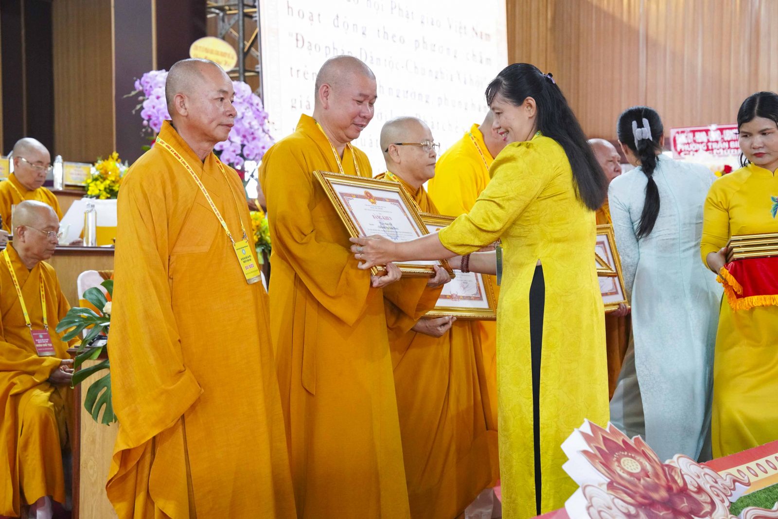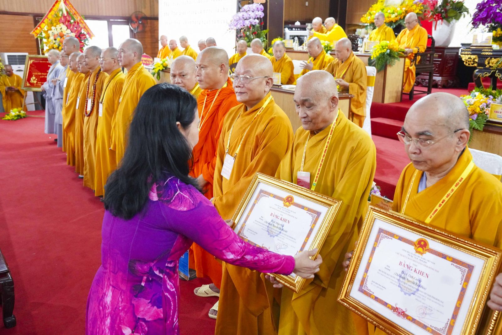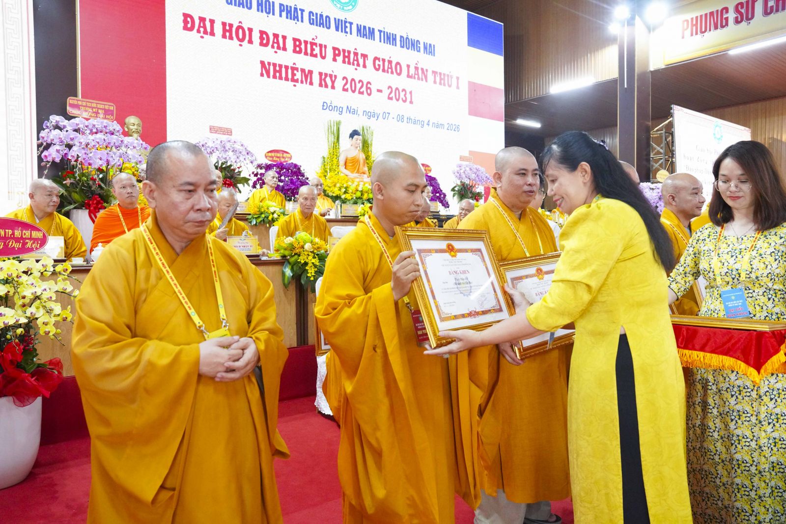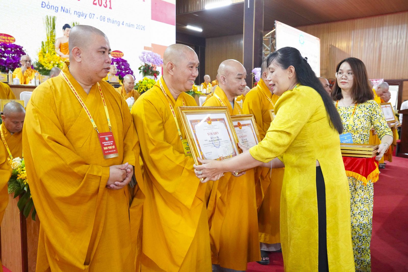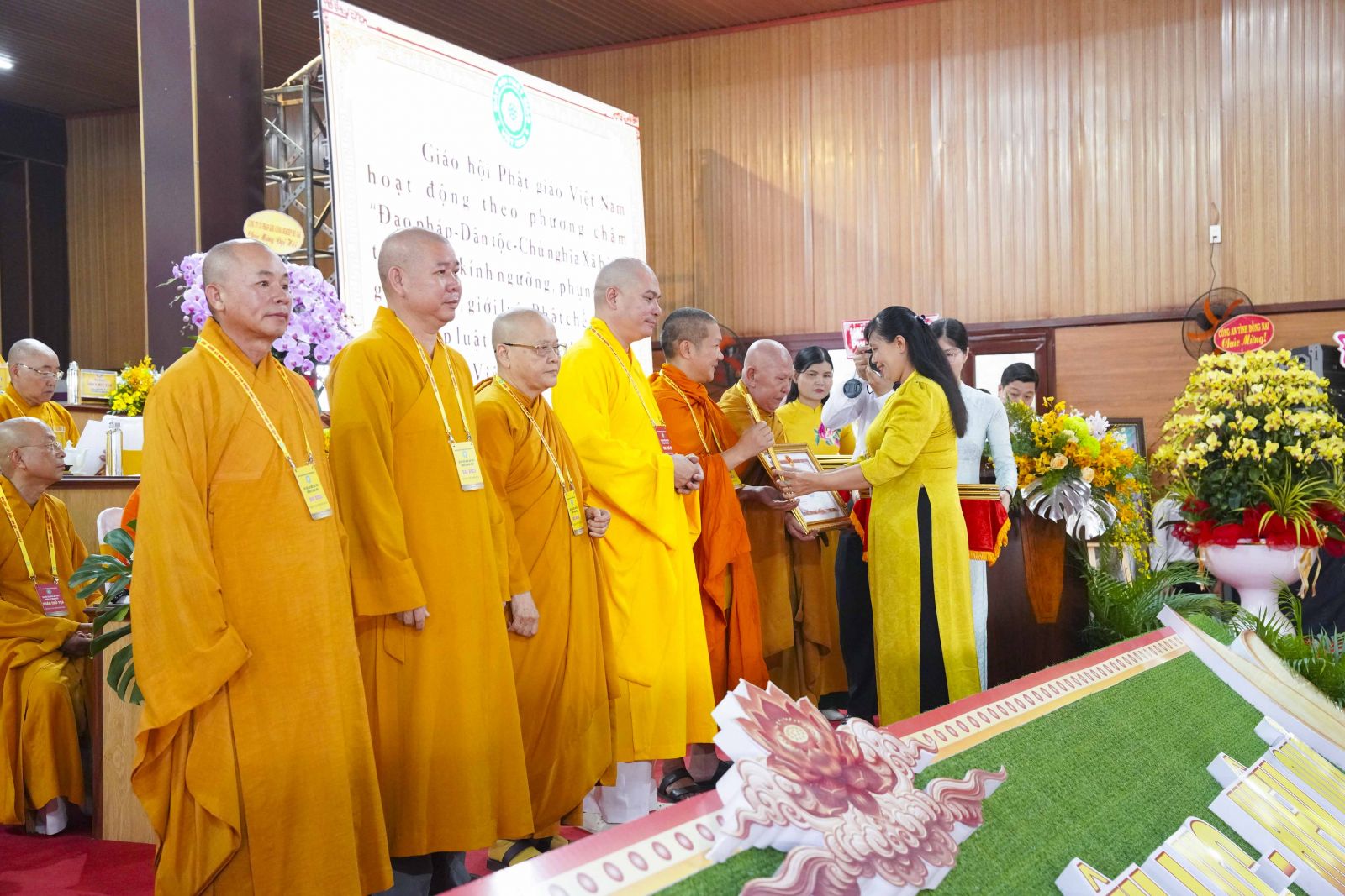 Tiếp đó, Đại đức Thích Thiện Trí thay mặt Ban Tổ chức thông qua báo cáo tóm tắt kết quả ngày làm việc thứ nhất và Lễ kỷ niệm 45 năm thành lập Giáo hội Phật giáo Việt Nam; đồng thời tiến hành trao Bằng Tuyên dương công đức của Trung ương Giáo hội cho 25 cá nhân có nhiều đóng góp tích cực, cùng Bằng khen của Ủy ban nhân dân tỉnh Đồng Nai.
