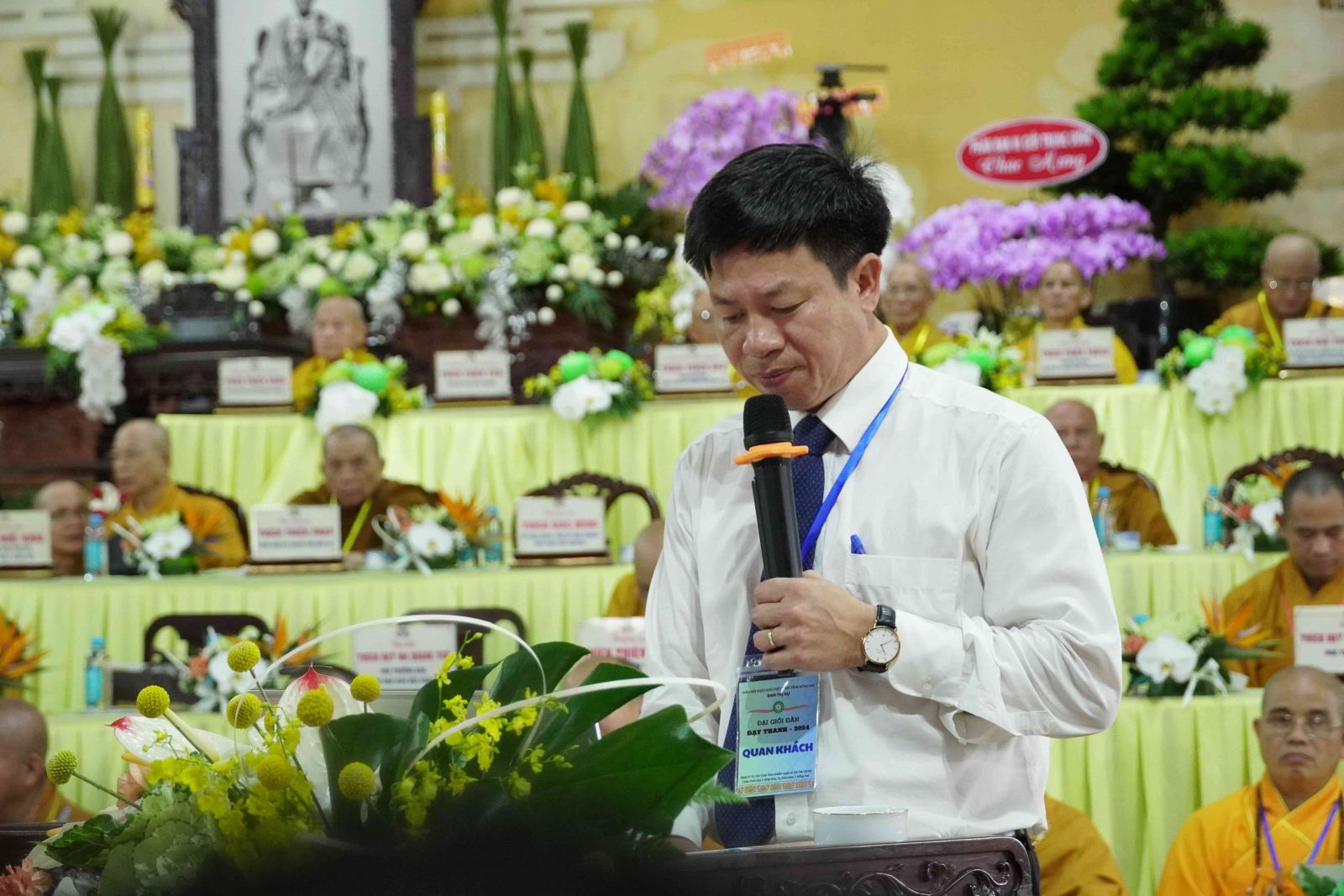 Tiếp đó ông Nguyễn Đình Kiên – Trưởng Ban Tôn giáo tỉnh Đồng Nai đã phát biểu: “Hôm nay tôi rất vui mừng được cùng với Lãnh đạo các ngành chức năng của Trung ương và Địa phương tham dự lễ khai mạc Đại Giới đàn Đạt Thanh năm 2024 do Ban Trị sự Giáo hội Phật giáo Việt Nam tỉnh Đồng Nai tổ chức. Qua nghe cung tuyên tiểu sử. Cố Đại lão HT. Thích Đạt Thanh, Ngài là bậc tôn túc của Giáo hội, có công rất lớn trong công cuộc chấn hưng Phật giáo và là một nhà yêu nước trung kiên, là bậc thầy cao quý của Tăng Ni, Phật tử Phật giáo. Do vậy, đây là dịp để chúng ta tưởng nhớ và tri ân những công lao to lớn của Đại lão Hòa thượng Thích Đạt Thanh, đồng thời đây cũng là dịp để tăng, ni giới tử thọ nhận giới pháp, trở thành những người thừa kế và truyền bá Phật pháp. Trong không khí trang nghiêm này, tôi xin gửi đến quý Hòa thượng, Thượng tọa, Ni trưởng, Ni sư, Đại đức Tăng, Ni cùng toàn thể giới tử và đồng bào phật tử lời chúc mừng trân trọng nhất. Chúc cho mỗi quý vị có mặt ở đây và qua quý vị chuyển lời chúc đến toàn thể tăng, ni và đồng bào phật tử tỉnh nhà thân tâm an lạc, phật sự viên thành, tinh tấn trên con đường Đạo pháp và Dân tộc.