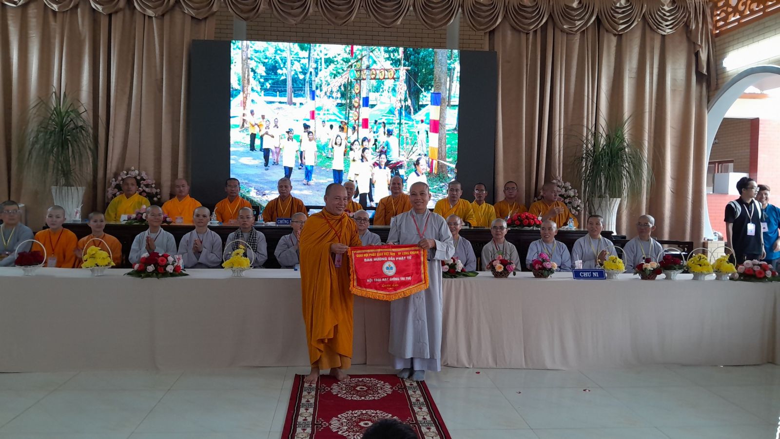 Để trại hè được tiếp nối, TX.NGỌC XUÂN, P.Bảo Vinh, Tp. Long Khánh nhận cờ đăng cai sẽ là nơi diễn ra hội trại " HẠT GIỐNG TRÍ TUỆ " lần thứ VIII. Đại Đức Thích Minh Phú, thay TT Trụ trì tiếp nhận cờ từ sư cô Tuệ Ý trụ trì Chùa Trúc Viên.