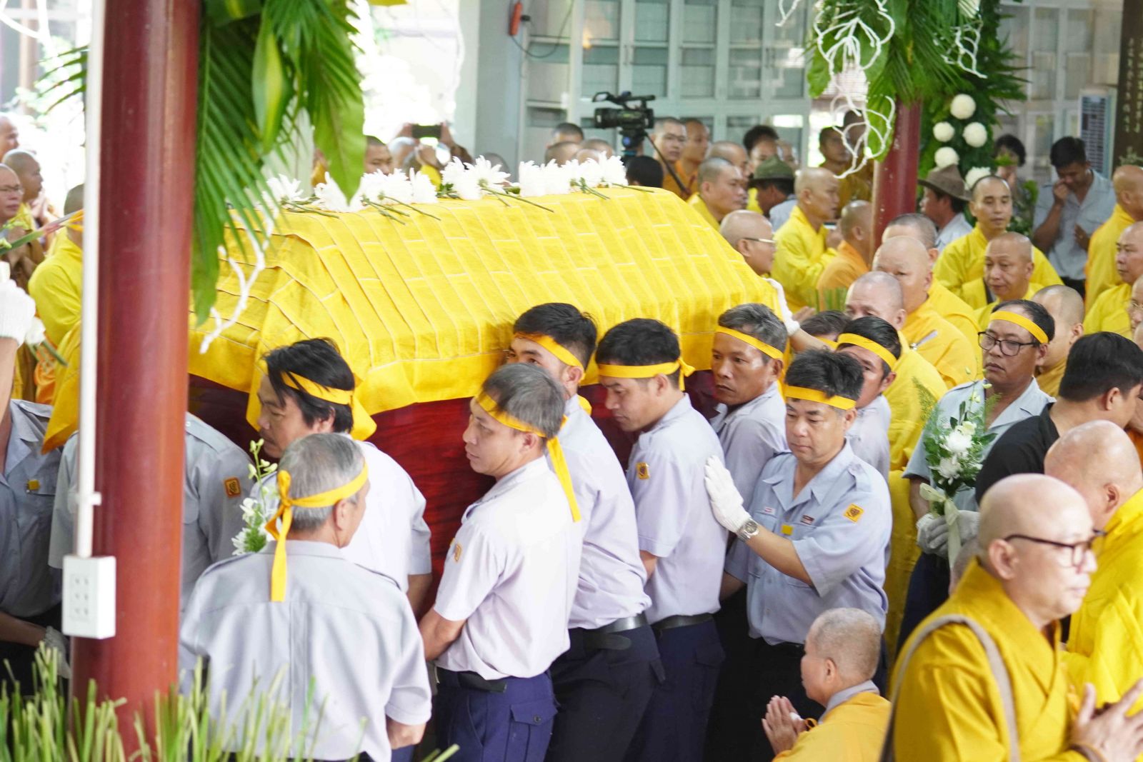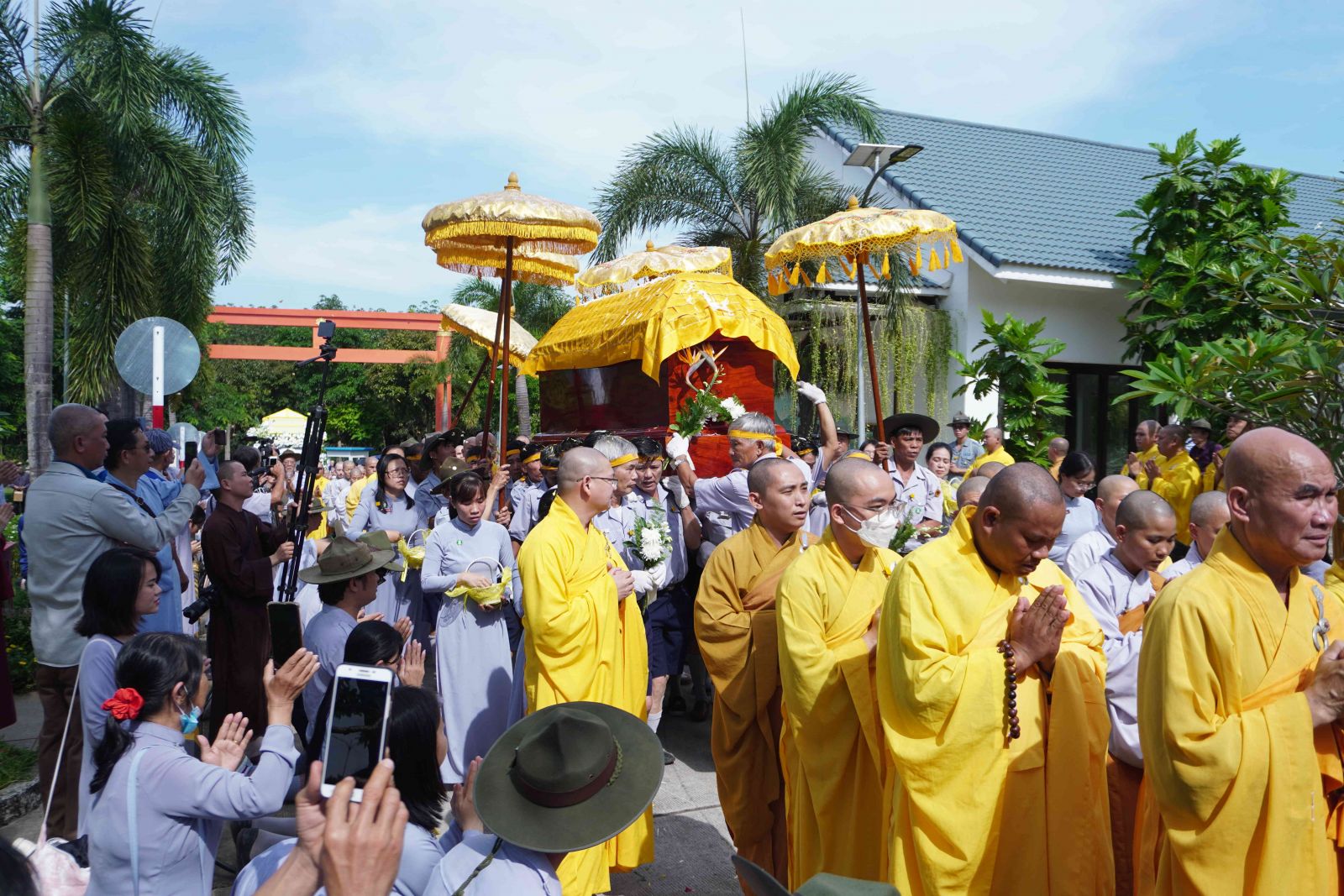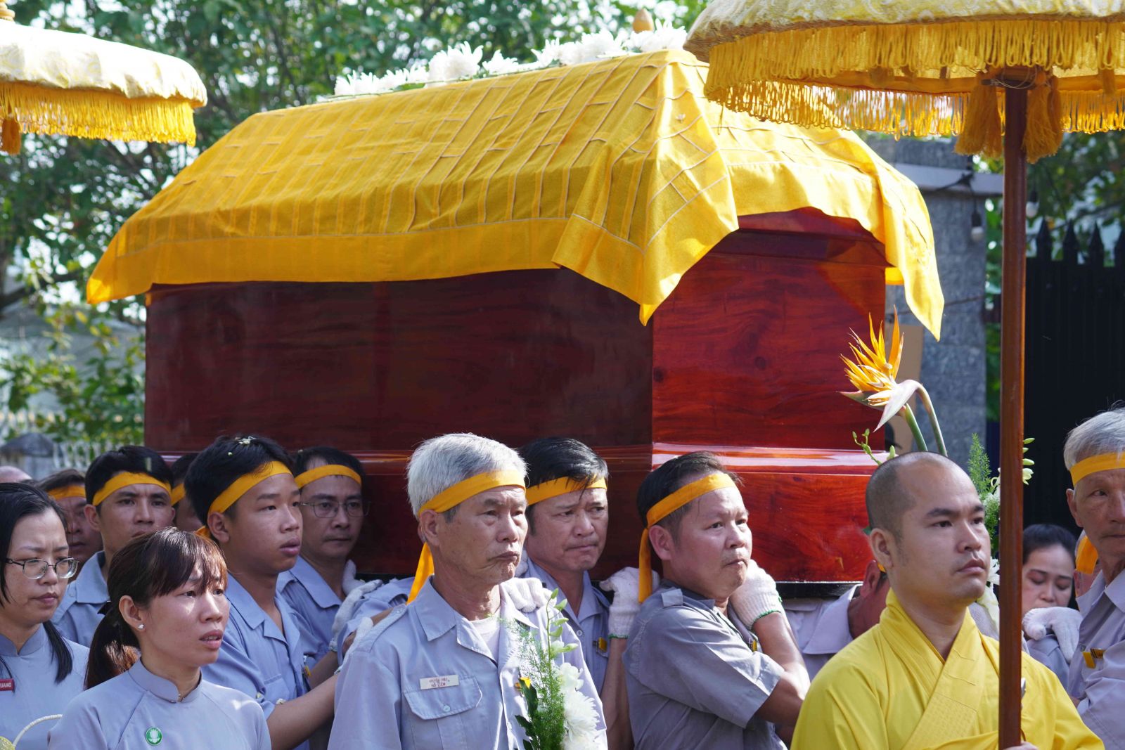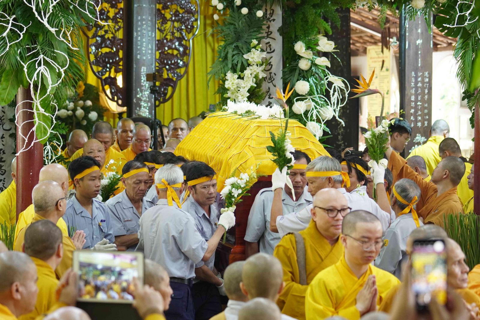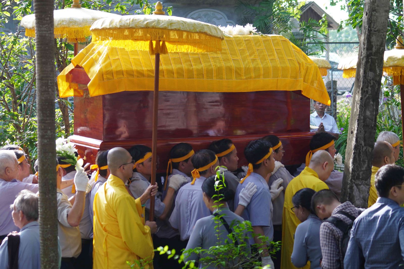 Sau lời cảm tạ, Hòa thượng Chứng minh đã làm lễ phất trần và Phụng tống kim quan Giác linh cố HT. Thích Tuệ Sỹ thăng thượng giá lễ trà tỳ trong tiếng trống trầm hùng, Tăng Ni Phật tử chí thành đảnh lễ cung tiễn Giác linh Ngài cao đăng Phật quốc.