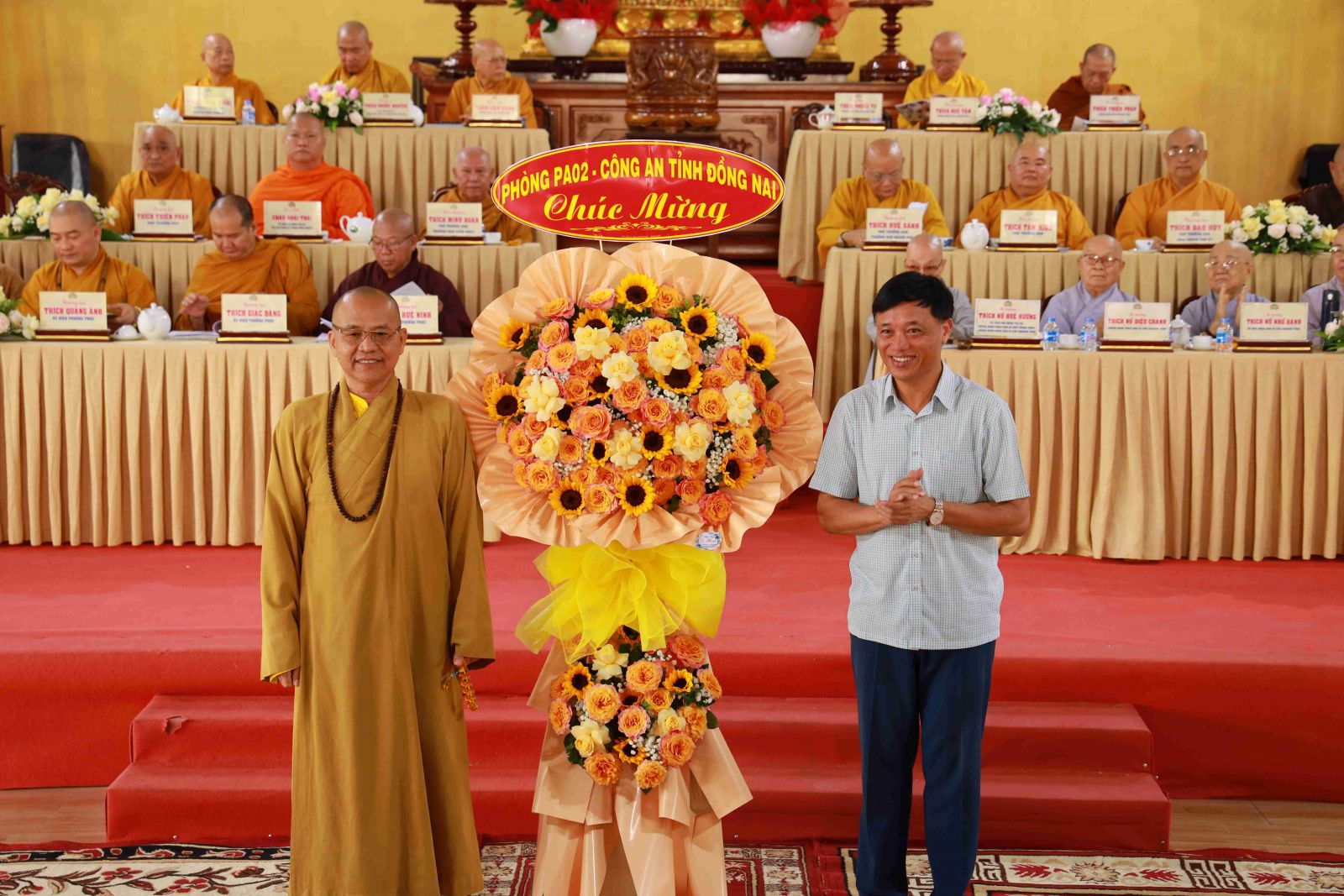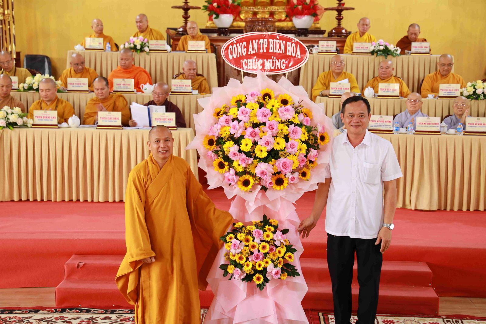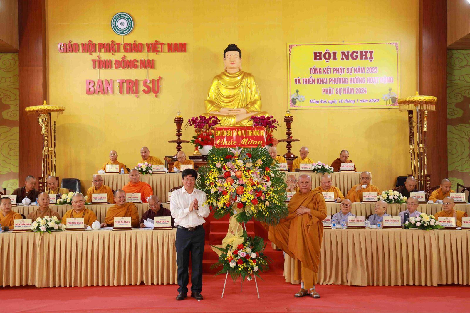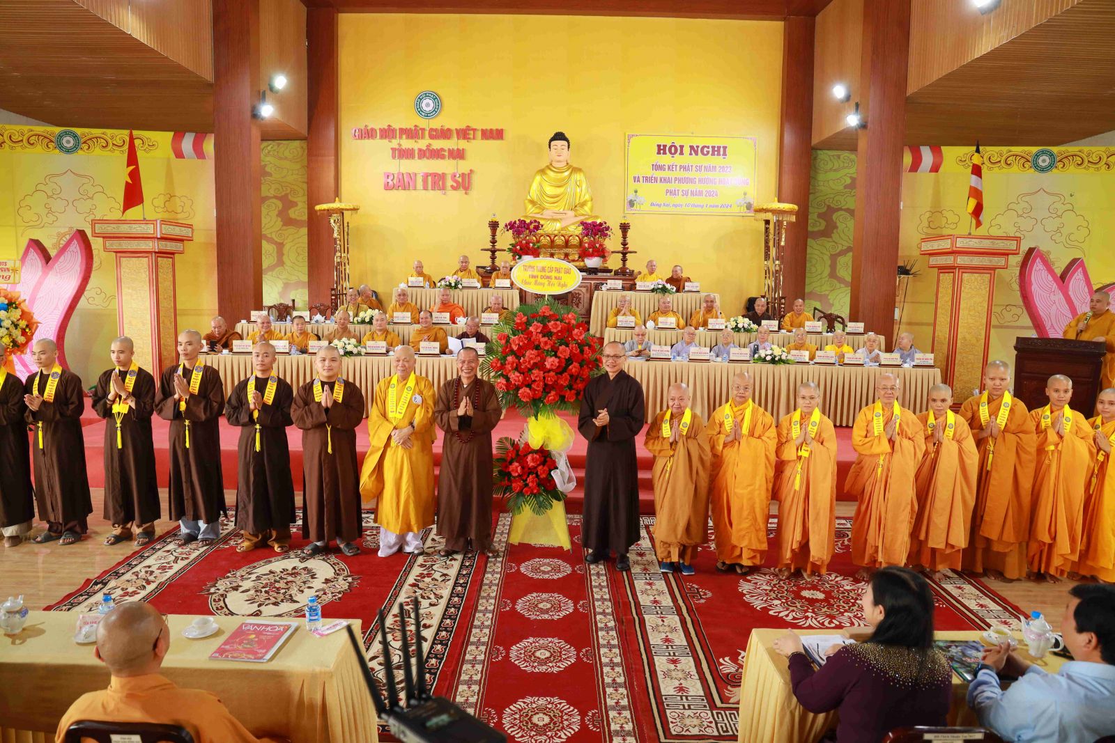 Chúc mừng Hội nghị tổng kết công tác Phật sự năm 2023 của Ban Trị sự GHPGVN tỉnh Đồng Nai, Hội đồng Trị sự và các ban ngành đã trao tặng các lẵng hoa chúc mừng.