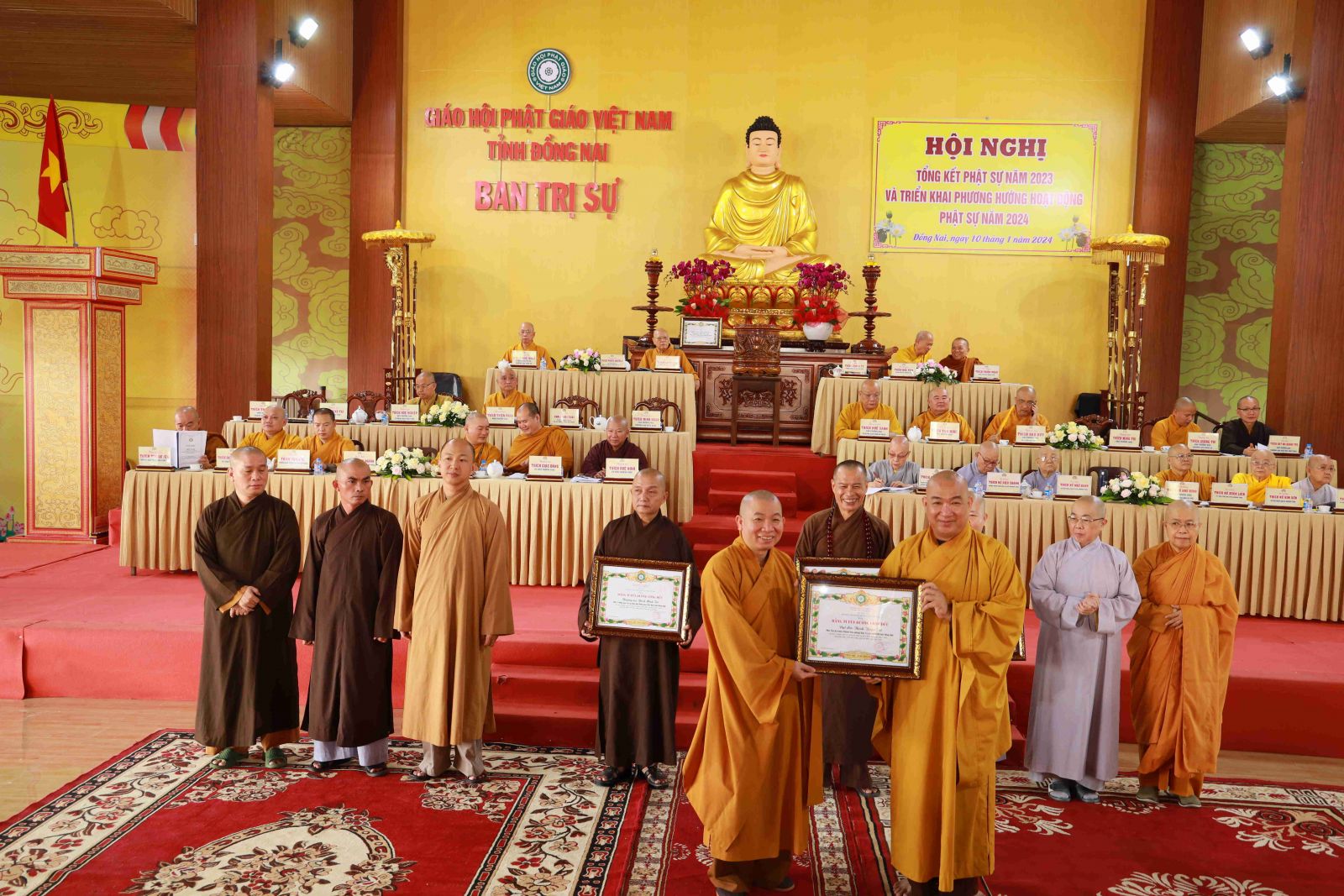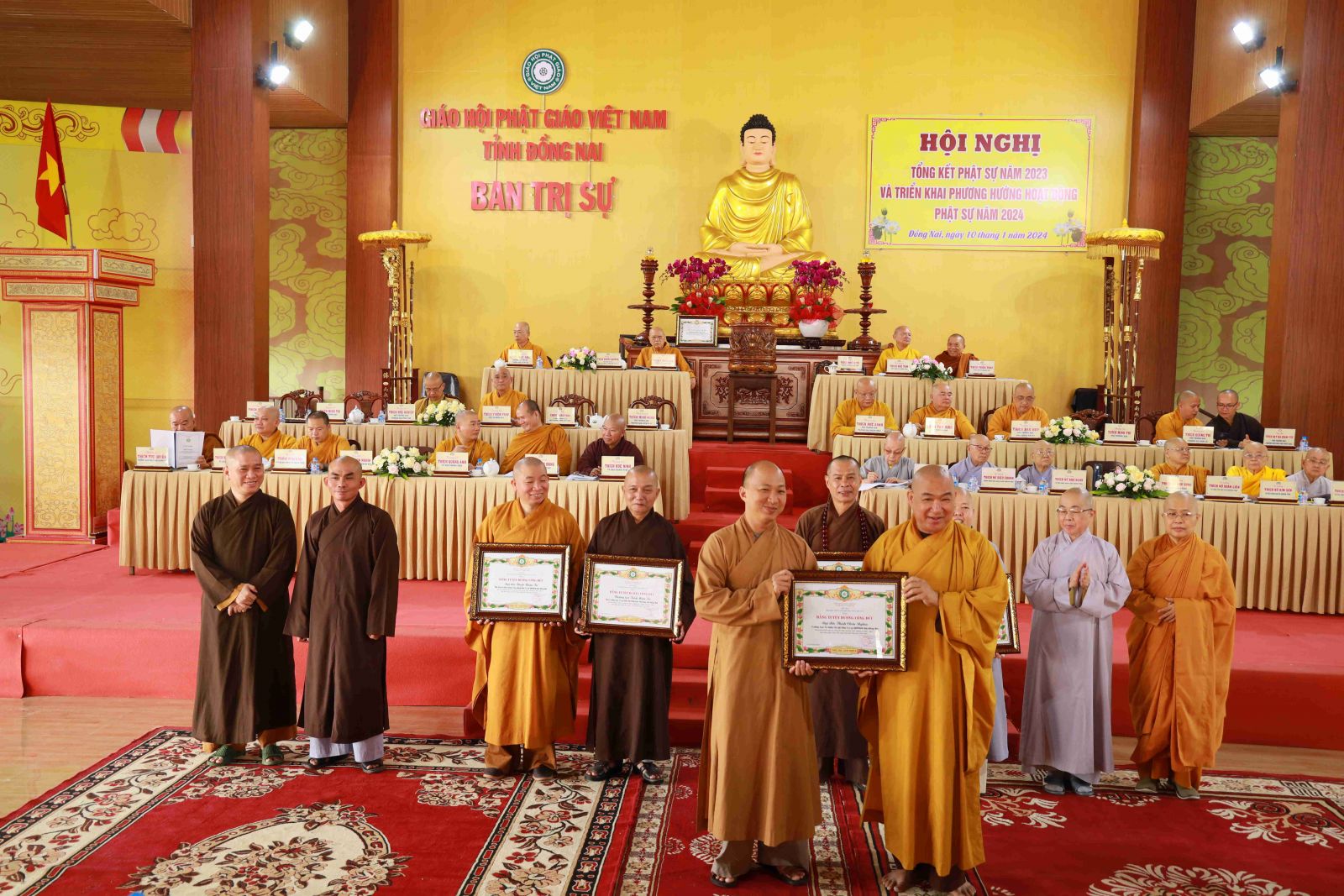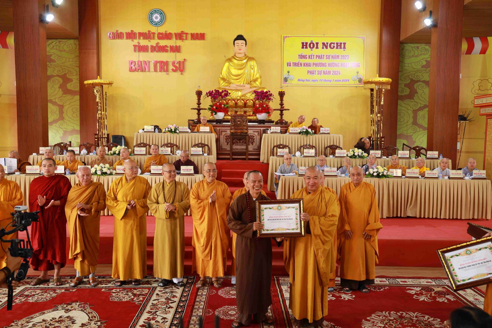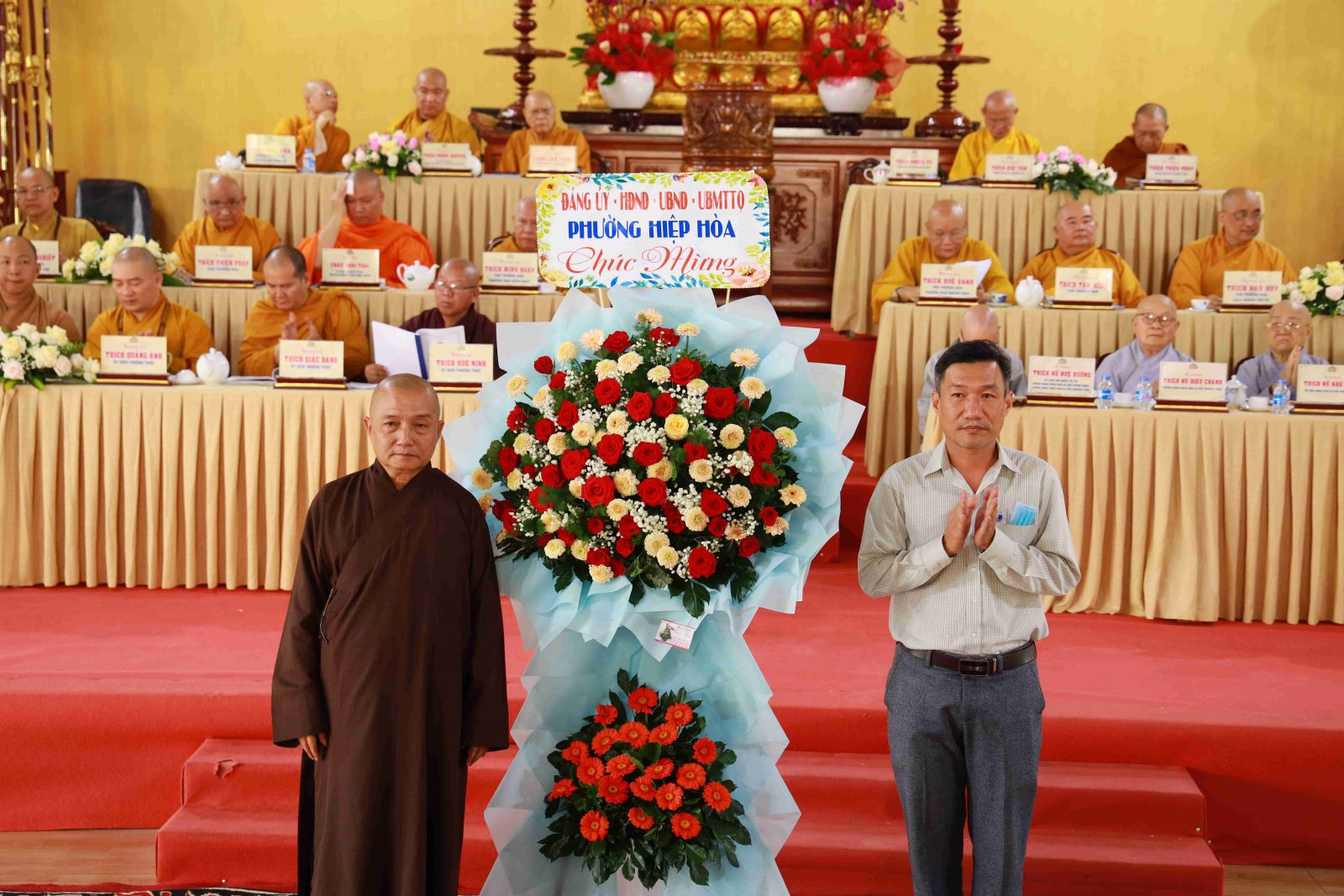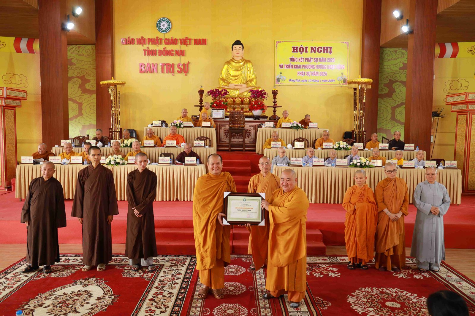 Chúc mừng Hội nghị tổng kết công tác Phật sự năm 2023 của Ban Trị sự GHPGVN tỉnh Đồng Nai, Hội đồng Trị sự và các ban ngành đã trao tặng các lẵng hoa chúc mừng.