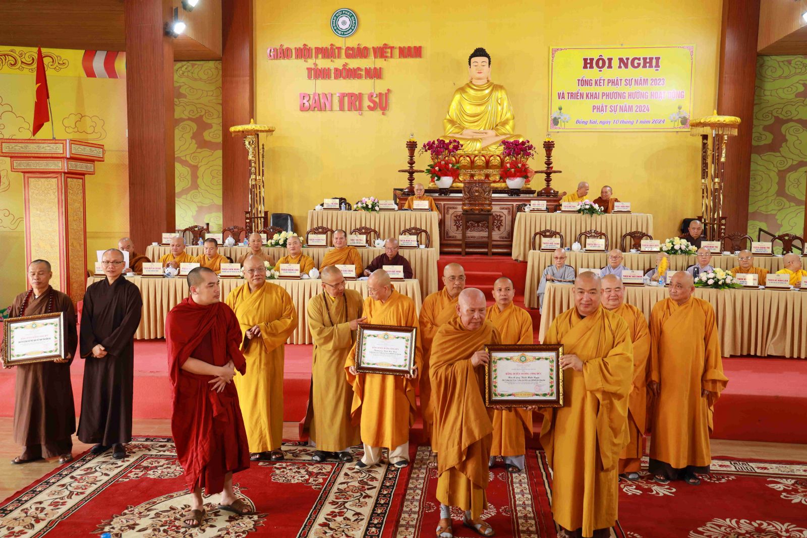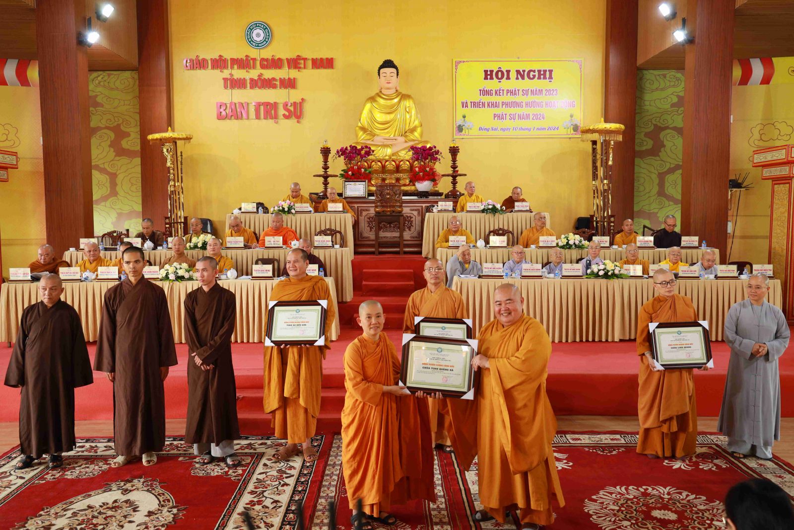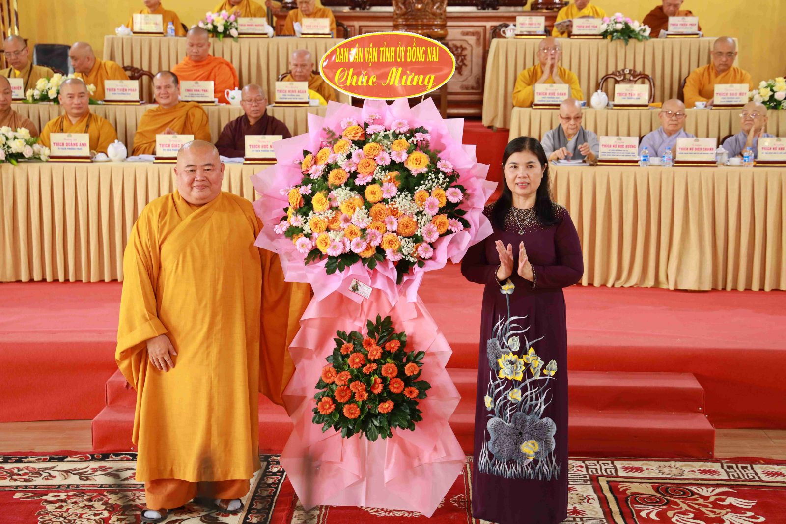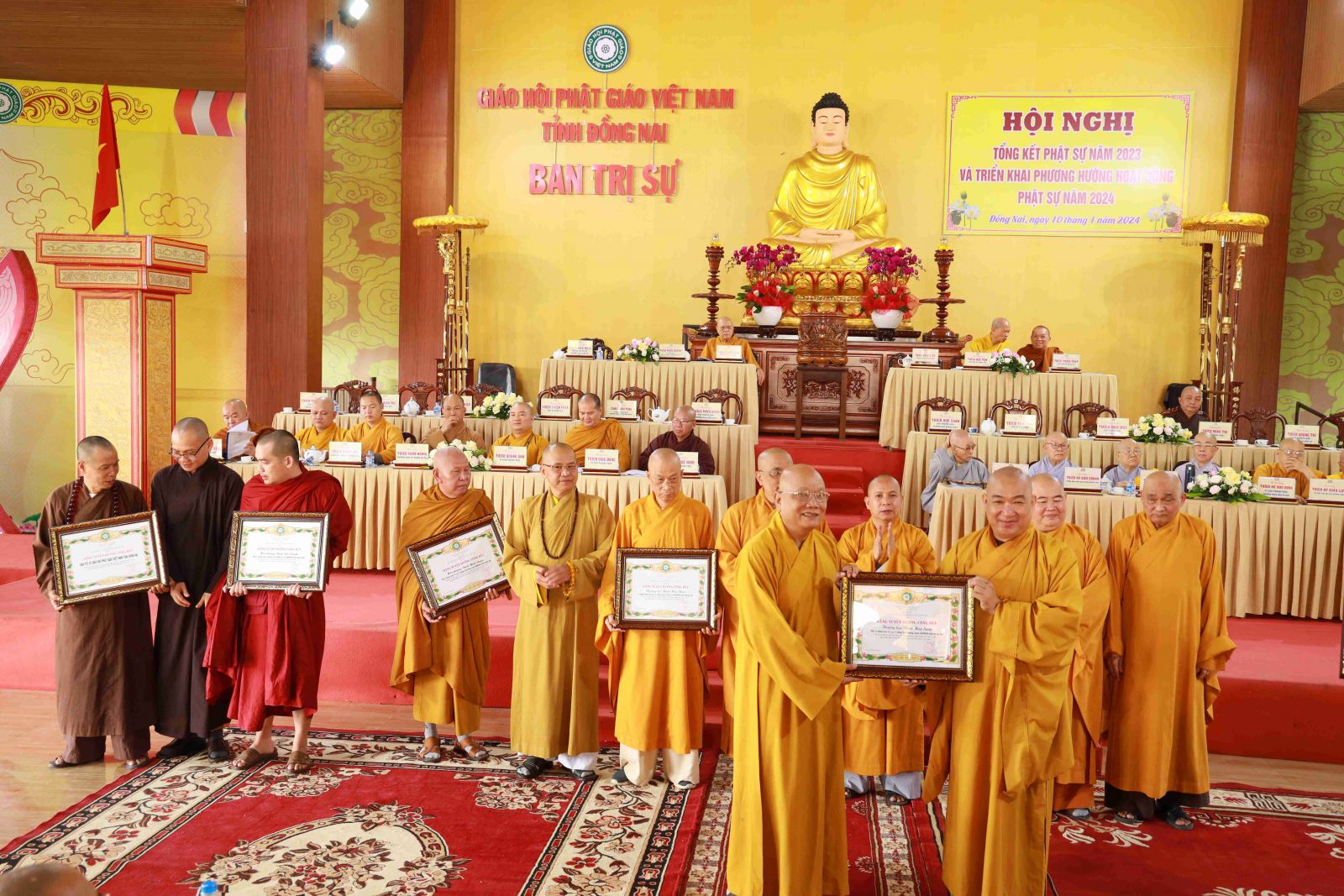 Chúc mừng Hội nghị tổng kết công tác Phật sự năm 2023 của Ban Trị sự GHPGVN tỉnh Đồng Nai, Hội đồng Trị sự và các ban ngành đã trao tặng các lẵng hoa chúc mừng.