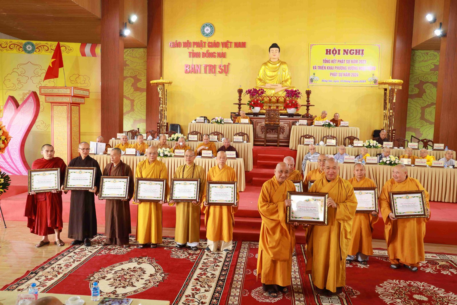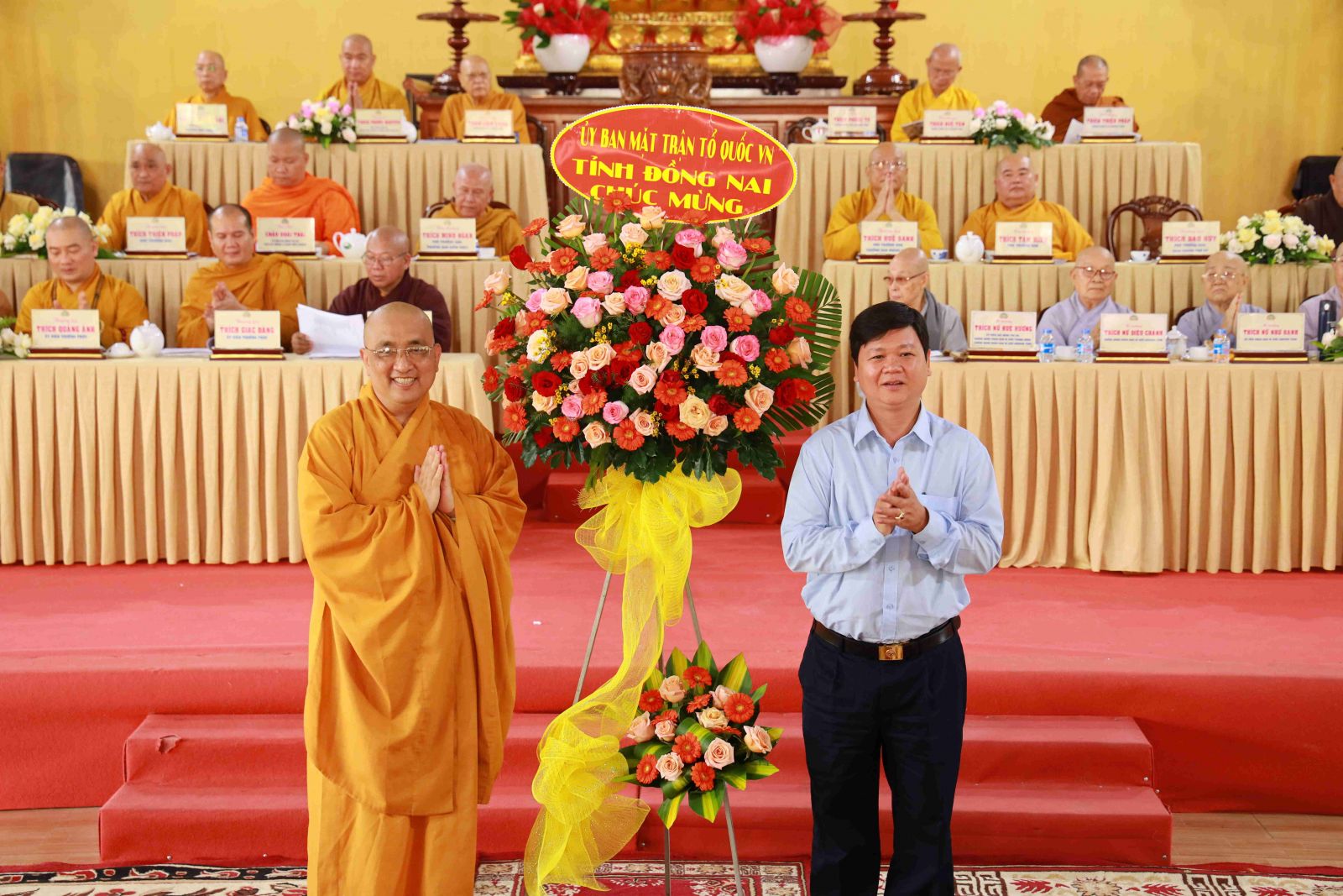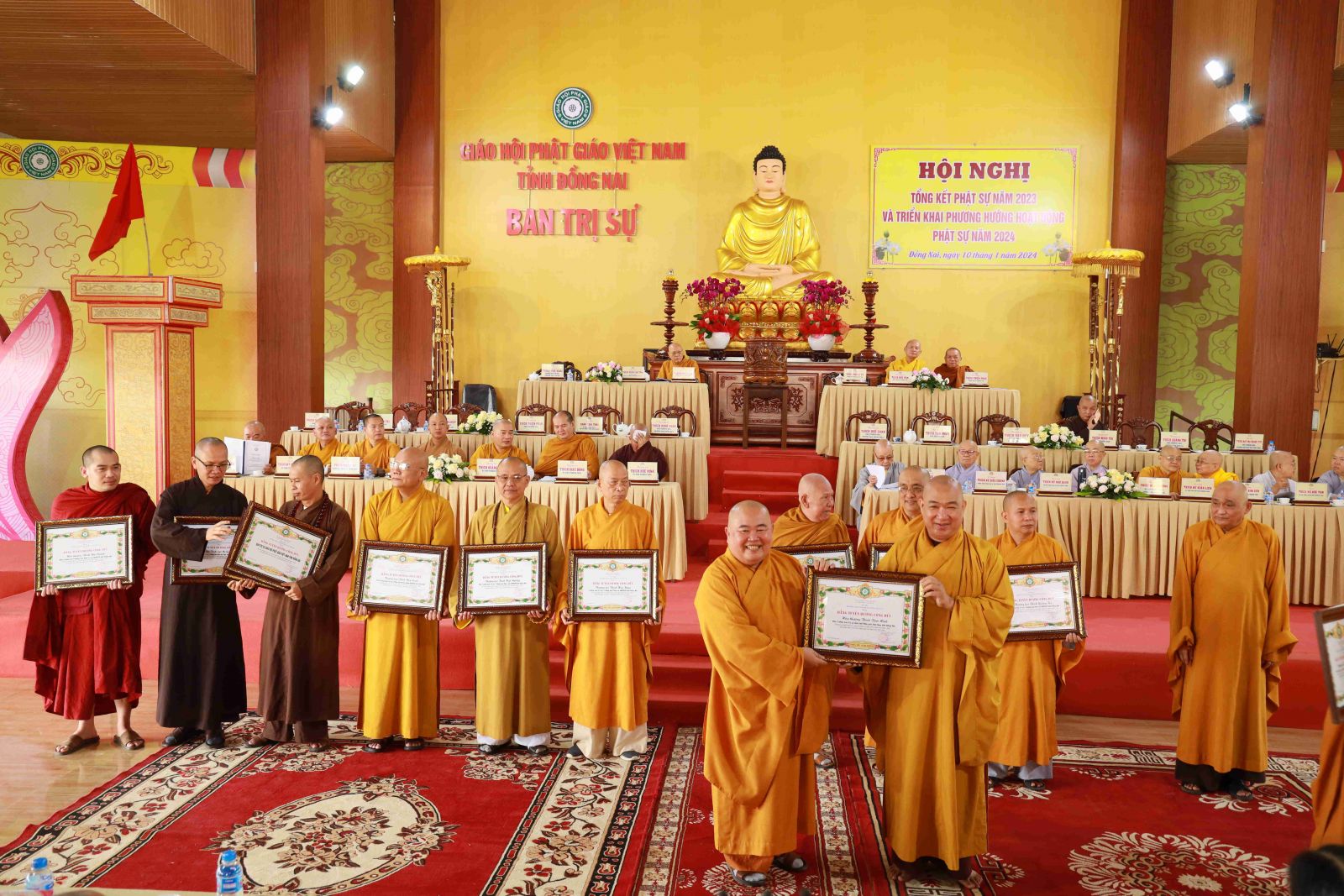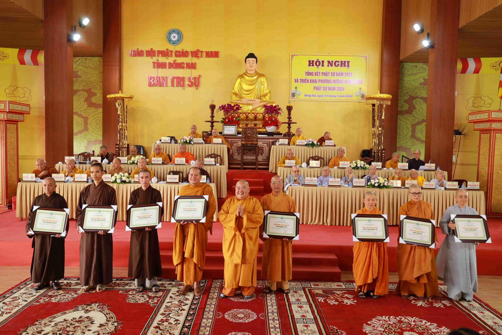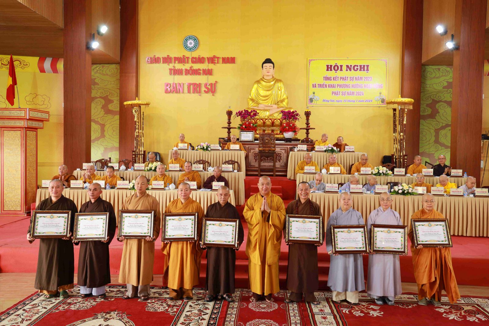 Chúc mừng Hội nghị tổng kết công tác Phật sự năm 2023 của Ban Trị sự GHPGVN tỉnh Đồng Nai, Hội đồng Trị sự và các ban ngành đã trao tặng các lẵng hoa chúc mừng.