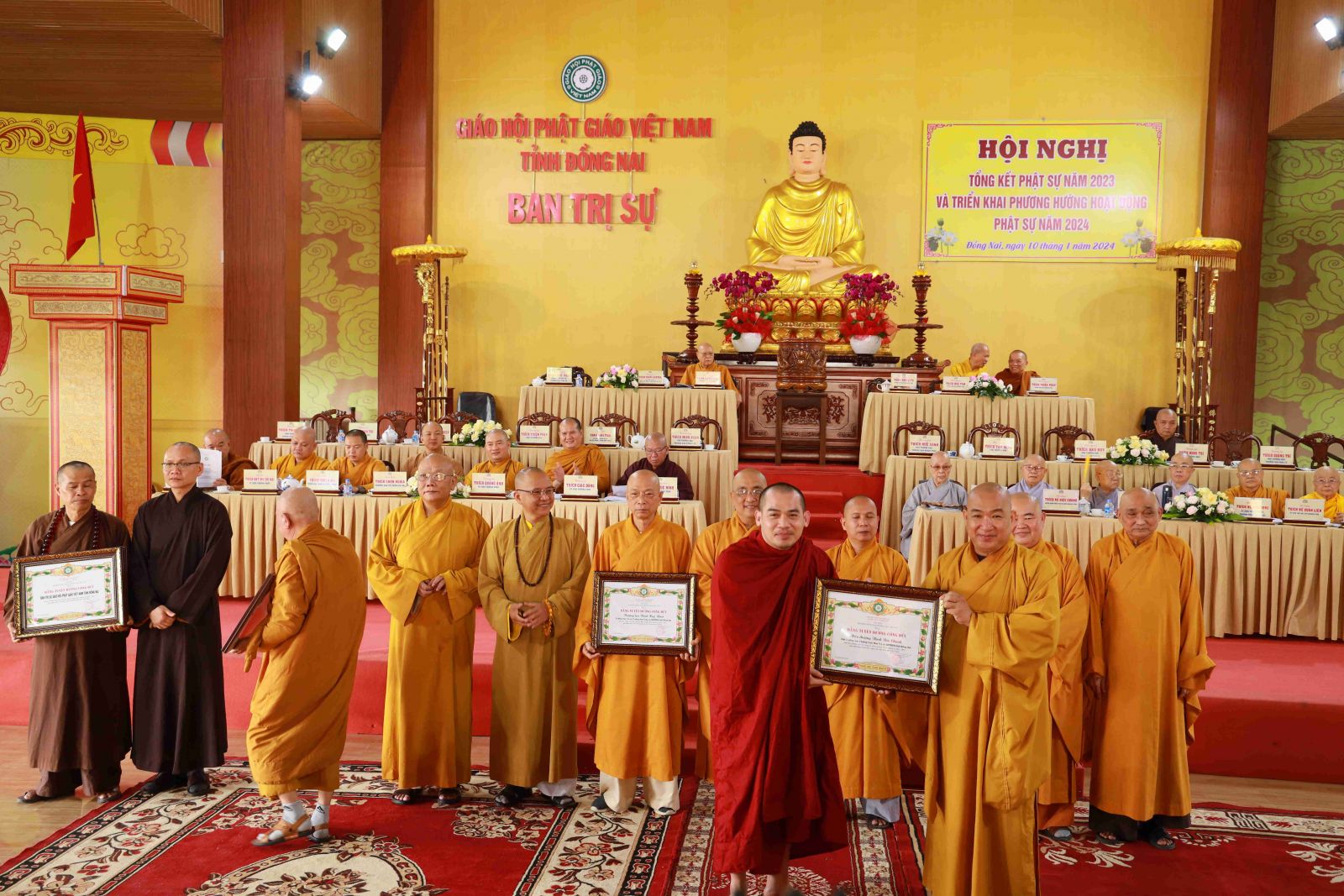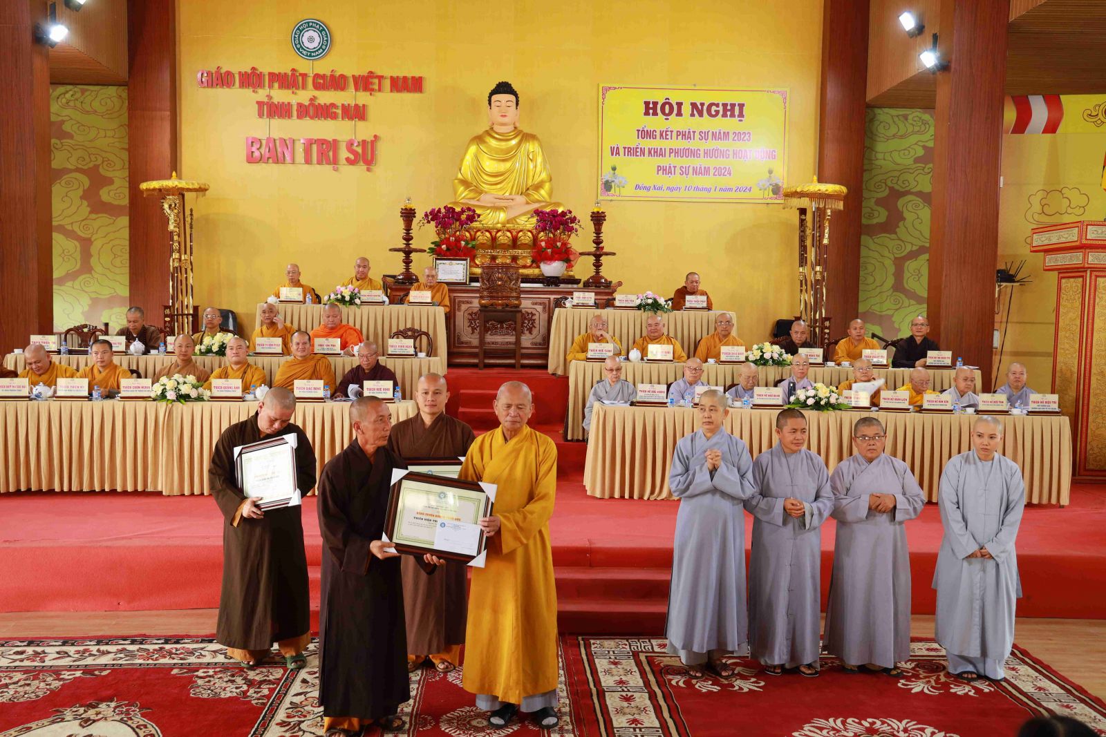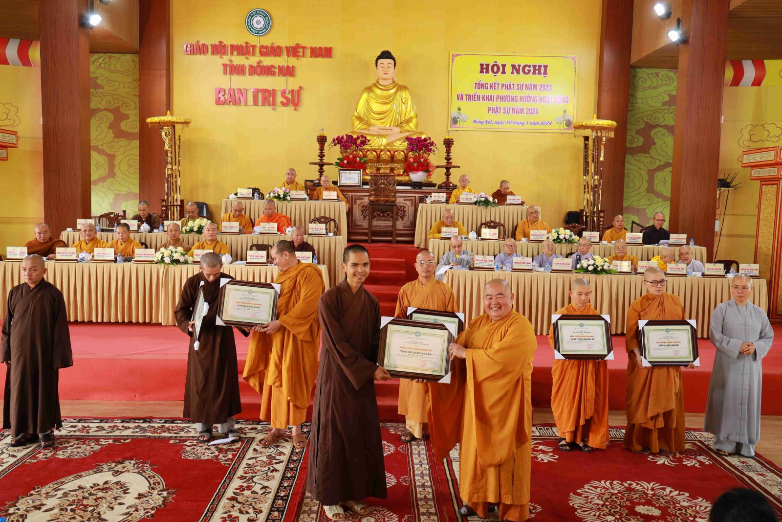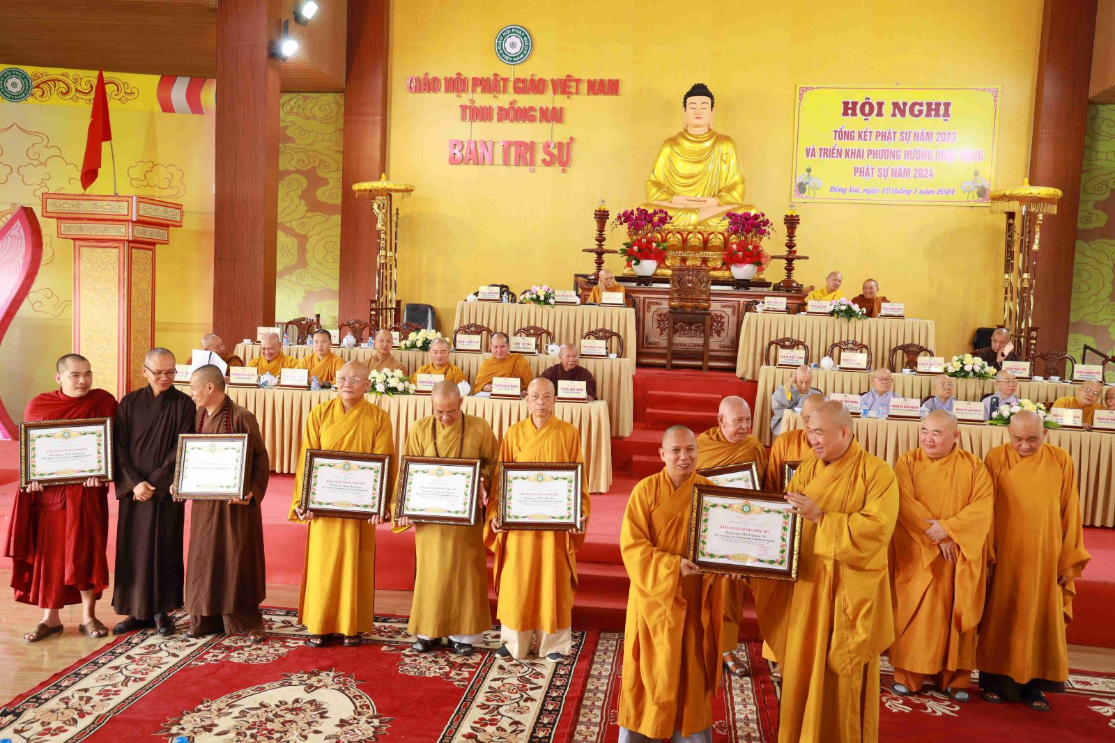 Chúc mừng Hội nghị tổng kết công tác Phật sự năm 2023 của Ban Trị sự GHPGVN tỉnh Đồng Nai, Hội đồng Trị sự và các ban ngành đã trao tặng các lẵng hoa chúc mừng.