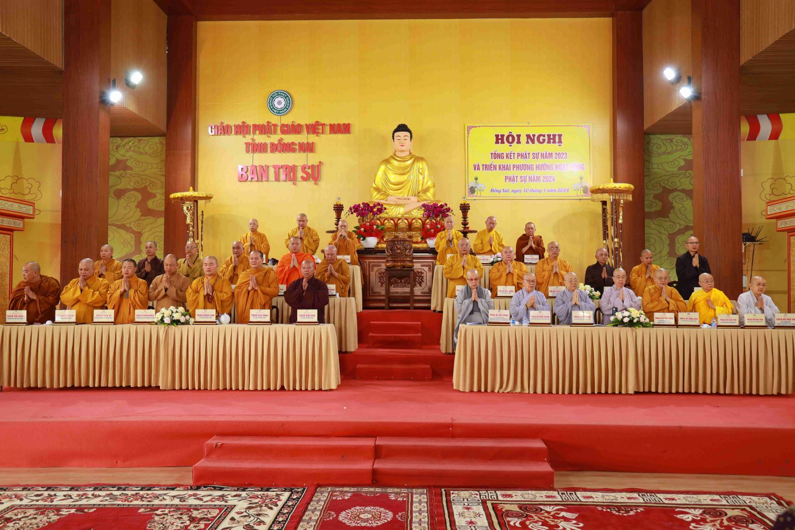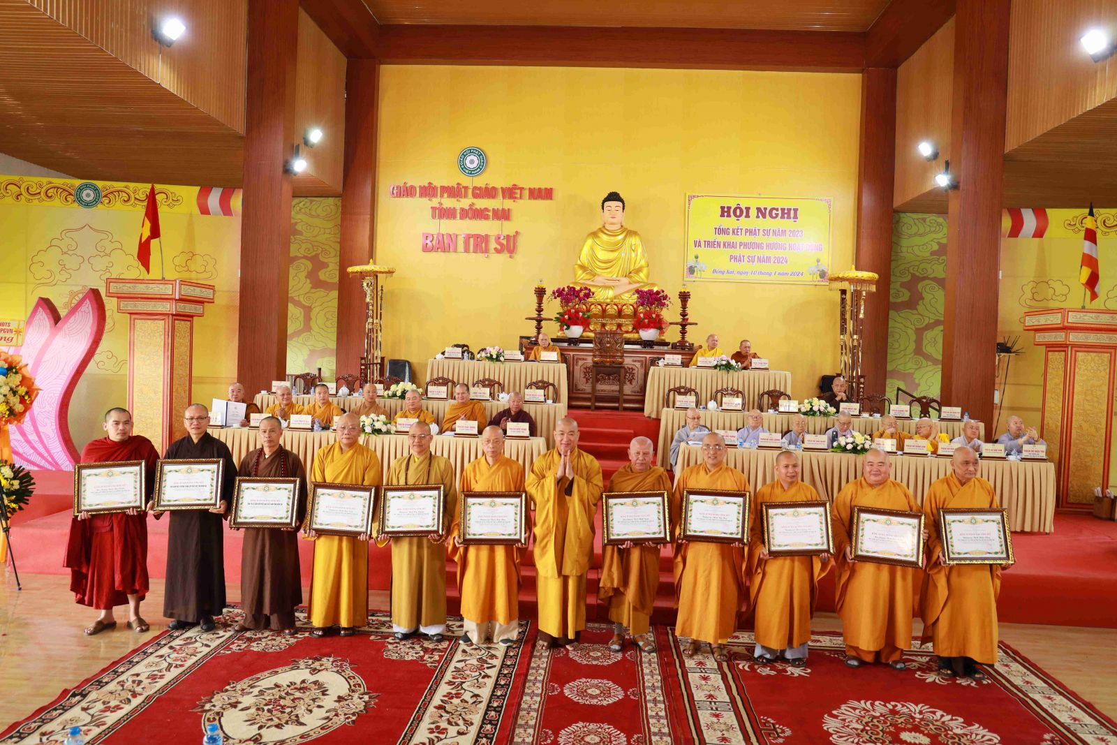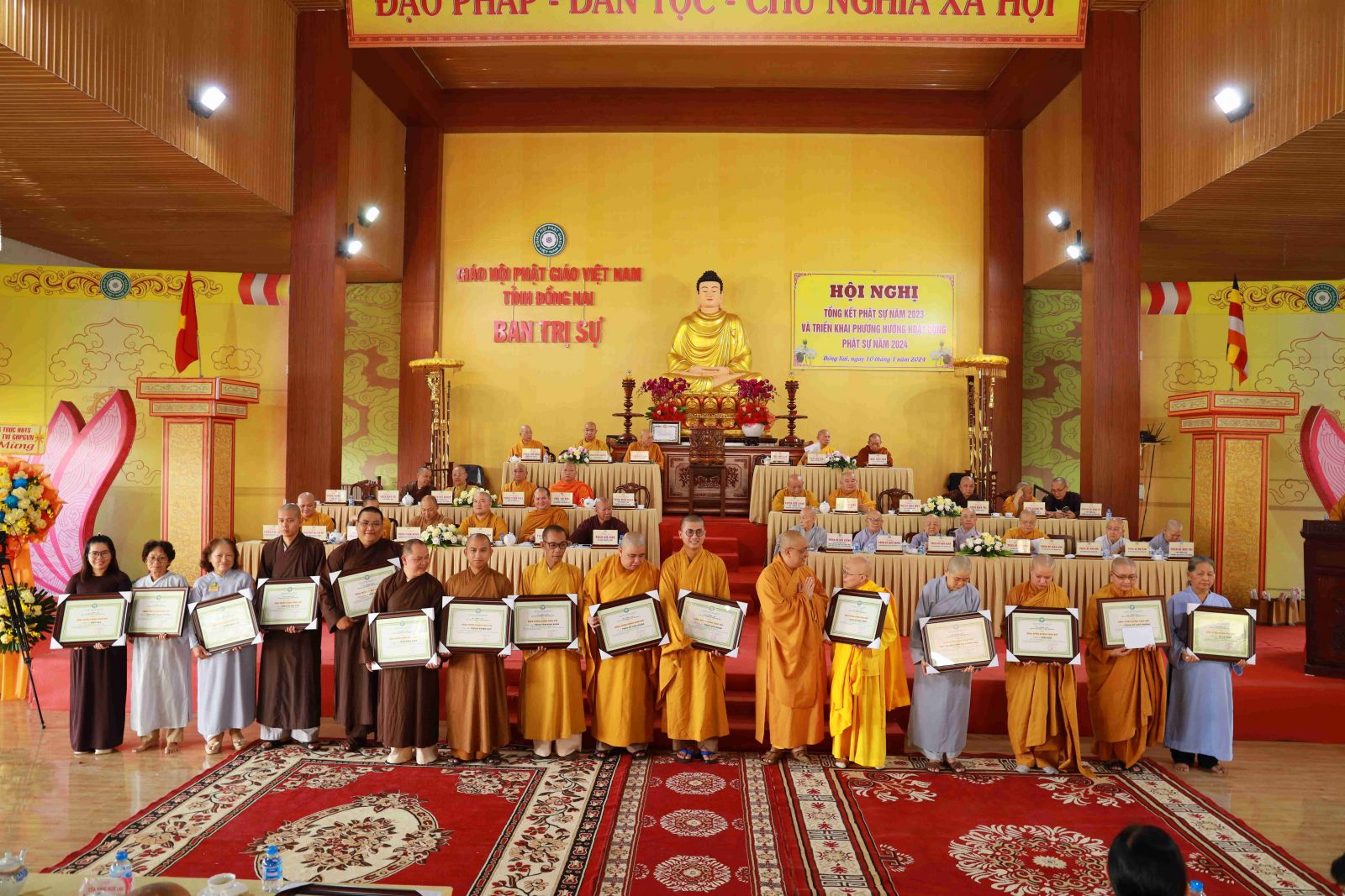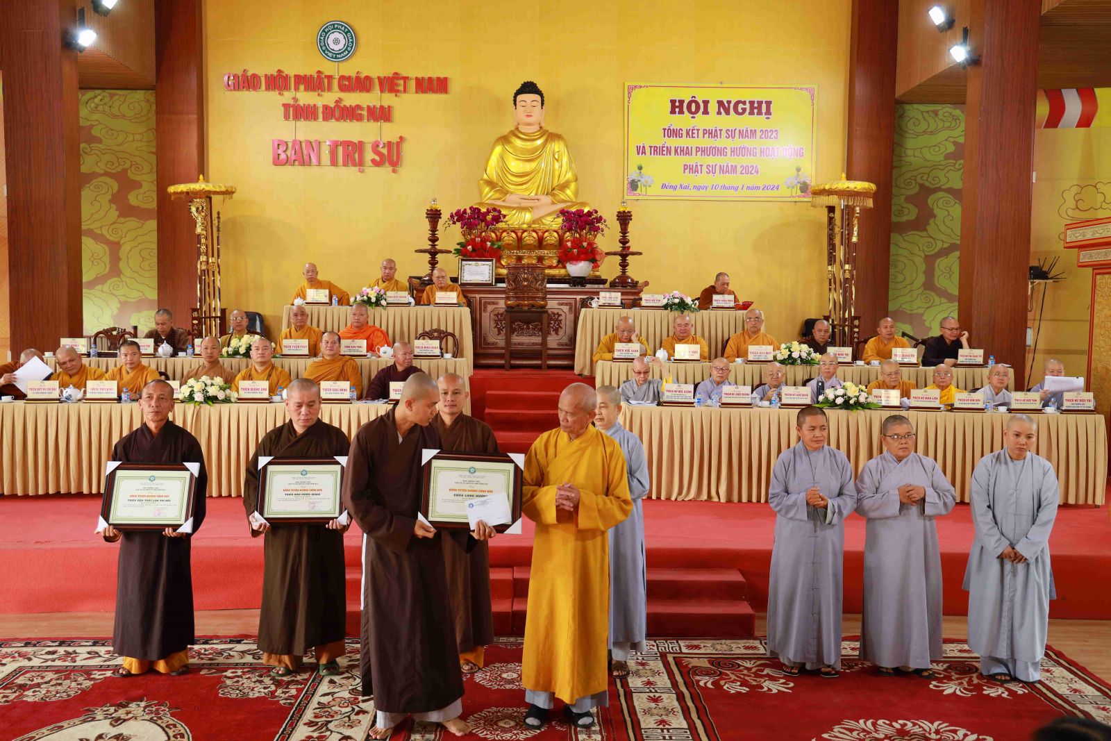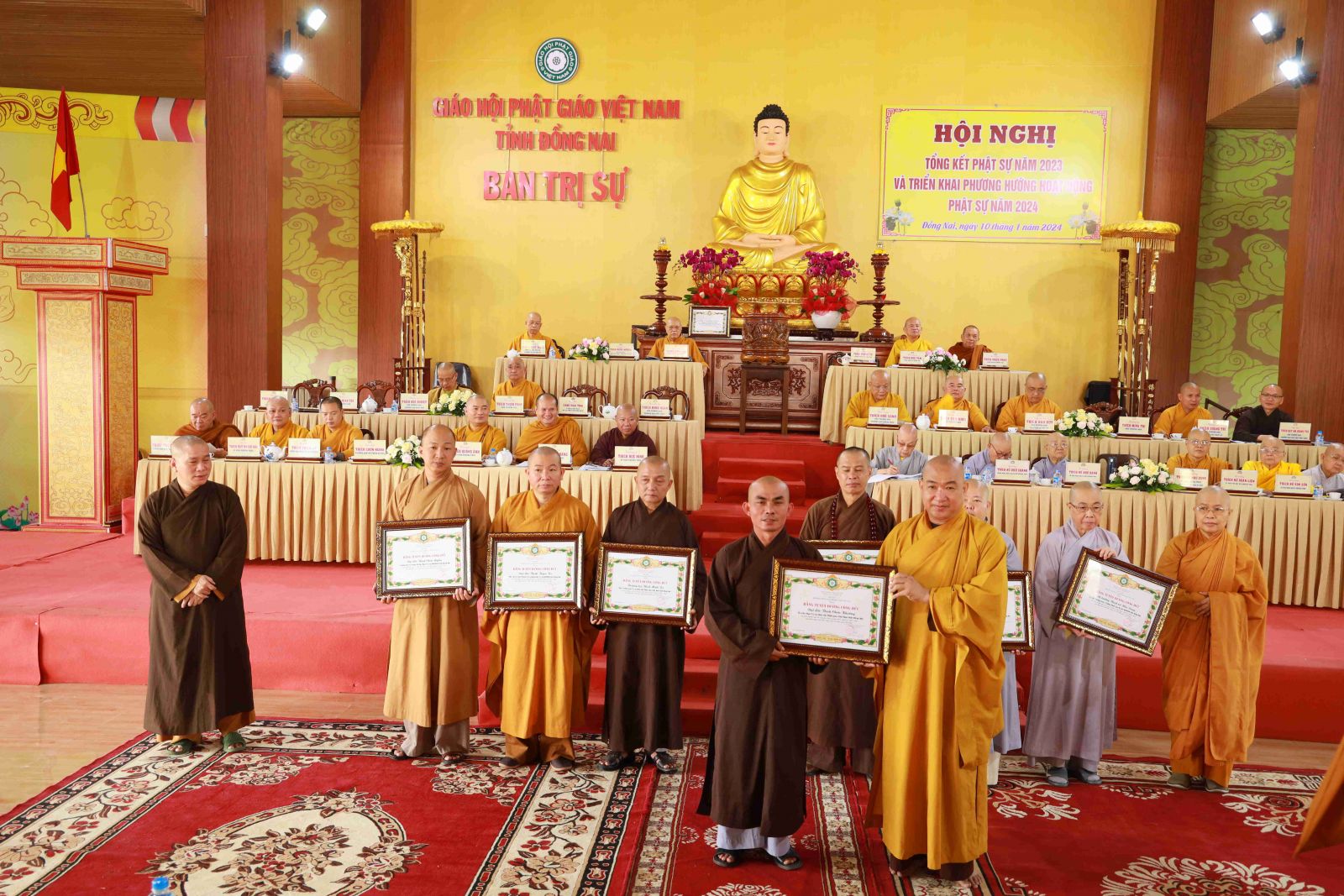 Chúc mừng Hội nghị tổng kết công tác Phật sự năm 2023 của Ban Trị sự GHPGVN tỉnh Đồng Nai, Hội đồng Trị sự và các ban ngành đã trao tặng các lẵng hoa chúc mừng.