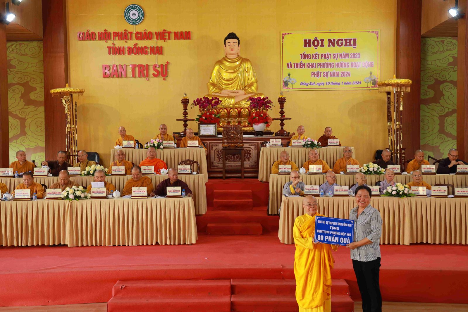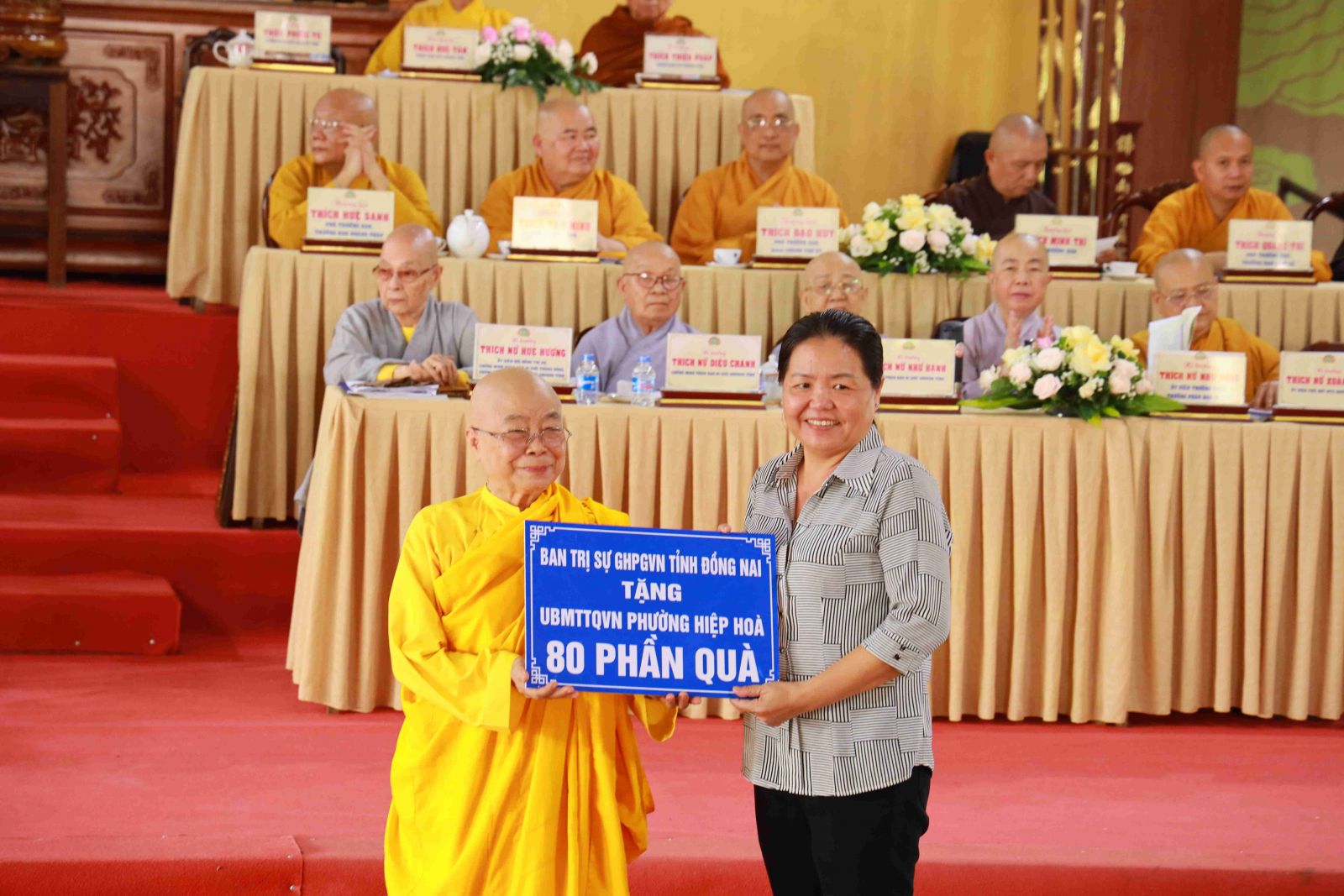 Khép lại phiên hội nghị, Ban Trị sự GHPGVN tỉnh Nai cũng trao tặng cho UBMTTQVN phường Hiệp Hòa 80 phần quà.