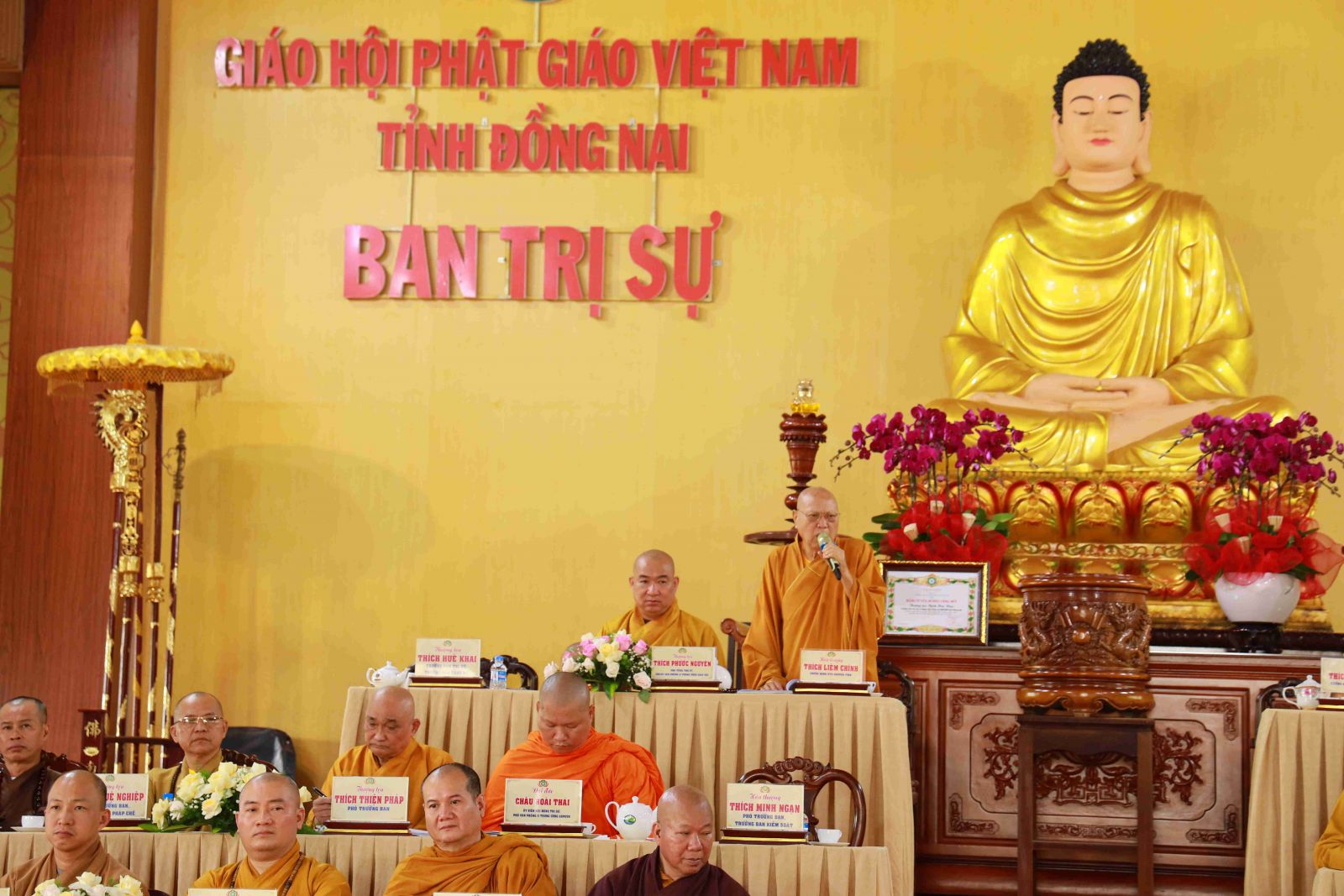 Tiếp đó, ĐĐ. Thích Quảng Trí báo cáo trường trung cấp Phật học tỉnh Đồng Nai đang đạo tạo song song 2 khóa X-XI, Tăng Ni sinh nội trú hiện nay là 569 vị. Nhờ sự quan tâm giúp đỡ của Giáo hội và chính quyền các cấp, đời sống tu học sinh hoạt của nhà trường ổn định, đạt kết quả tốt. Ban Giáo Dục Phật giáo T.Ư, trước đây đã cung cấp rất nhiều sách giáo khoa giáo trình Trung cấp Phật học cho Giáo thọ và Tăng Ni sinh các khóa đã học xong. Đầu năm 2022, nhà trường được nhận 520 bộ sách giáo khoa, mỗi bộ gồm 15 đầu sách, tổng cộng là 7.800 quyển. Đặc biệt, năm 2023, nhà trường đã nhận được 49 máy vi tính do Ban Giáo Dục Phật Giáo Trung Ương tặng cho nhà trường và Giáo thọ để phục vụ công tác dạy và học đáp ứng thời đại công nghệ vi tính.