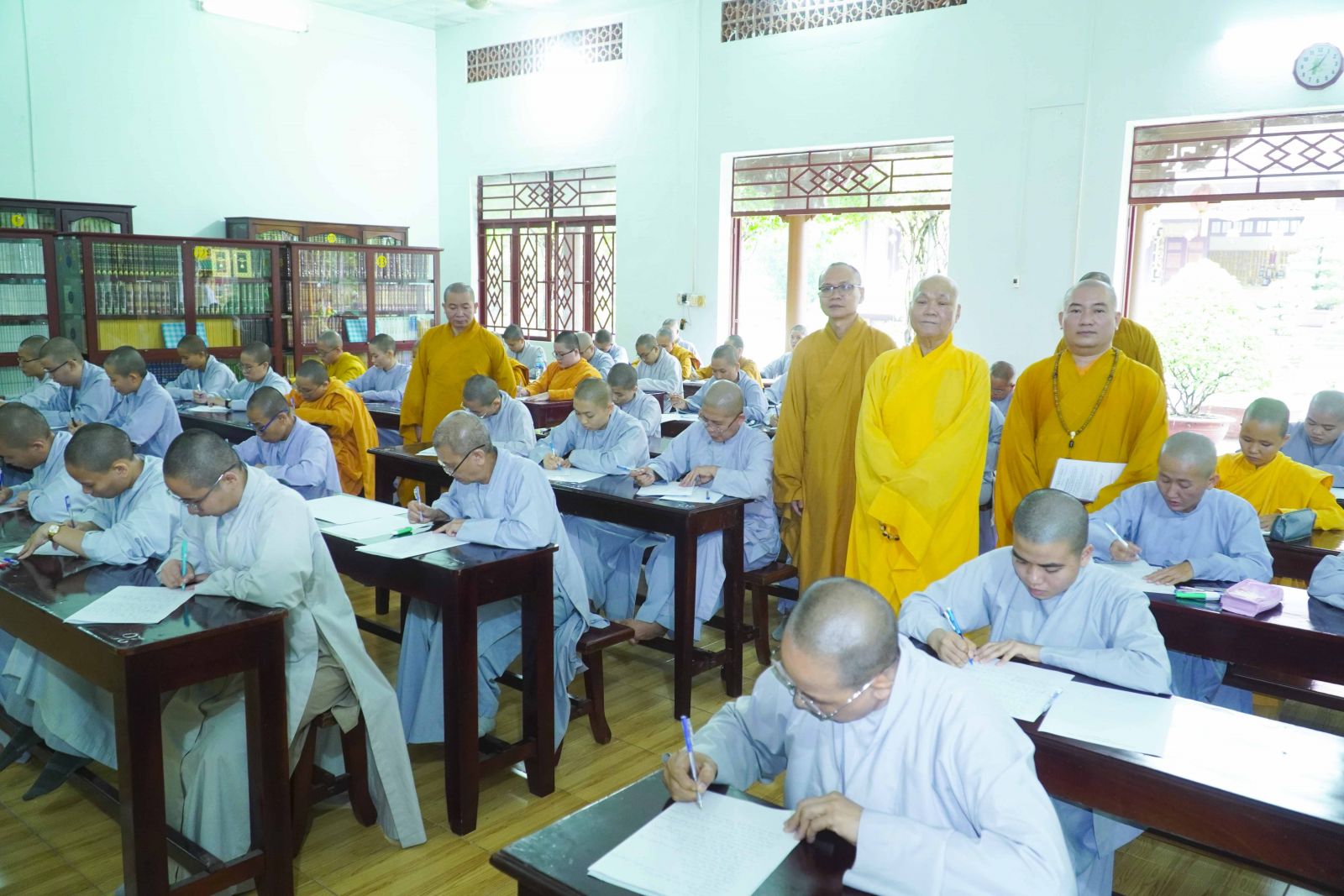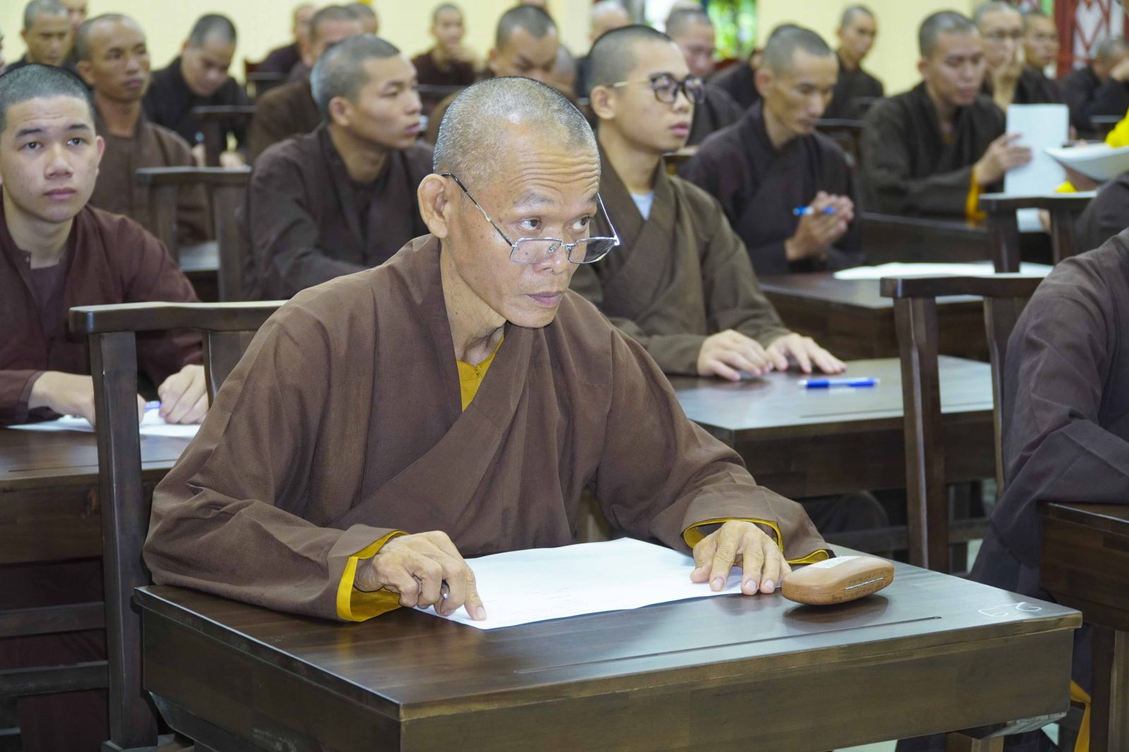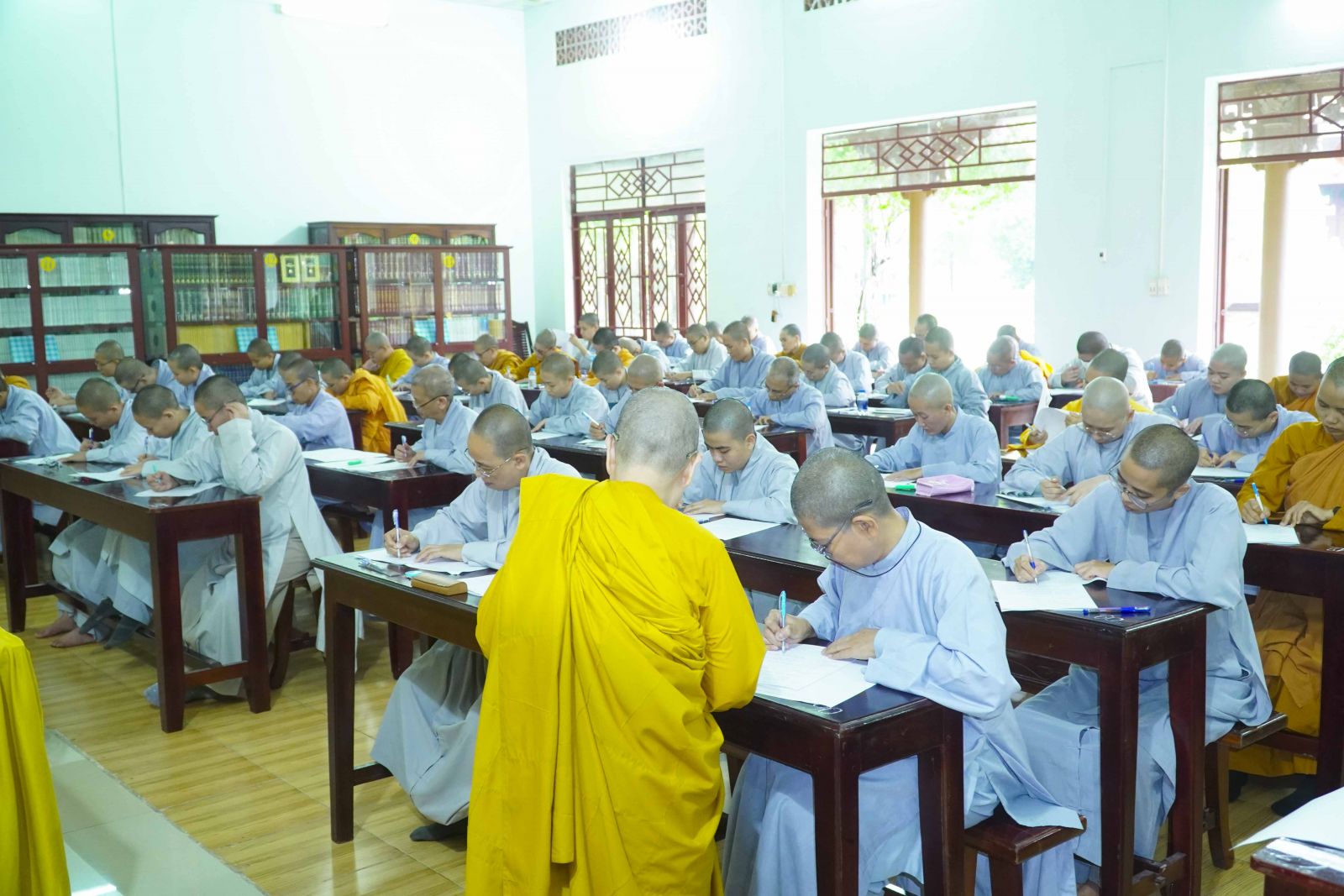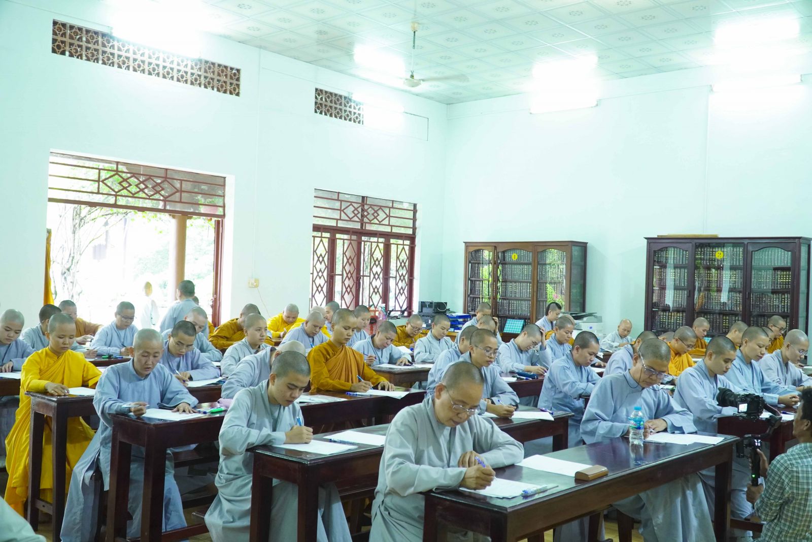 Sau lời Đạo từ của Hòa thượng Chứng minh, Tăng Ni sinh đã bước vào môn thi đầu tiên là Phật Pháp Căn Bản – thời gian: 90 phút và môn thi: Việt Văn – 90 phút.