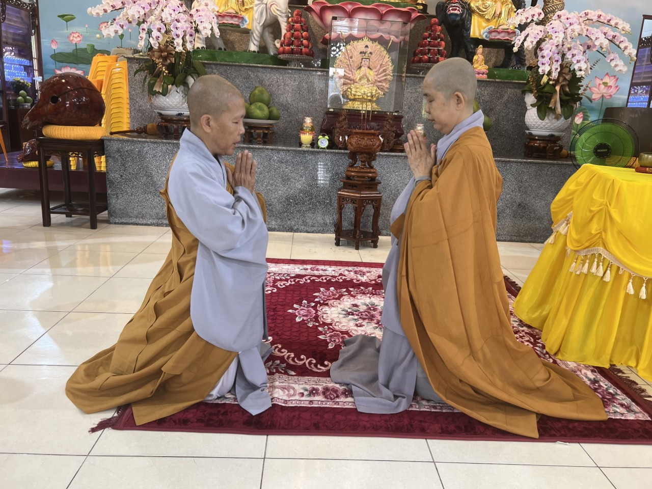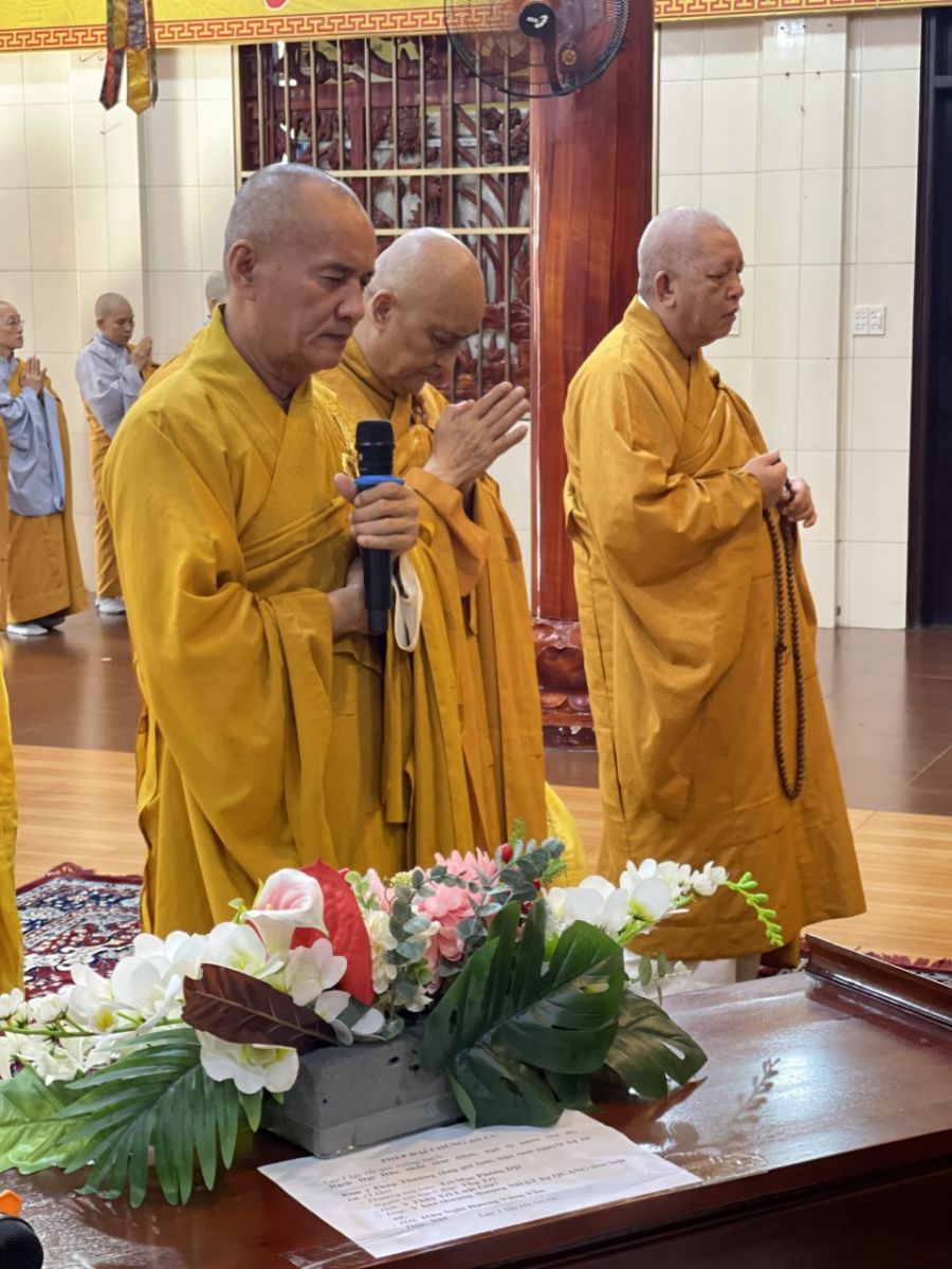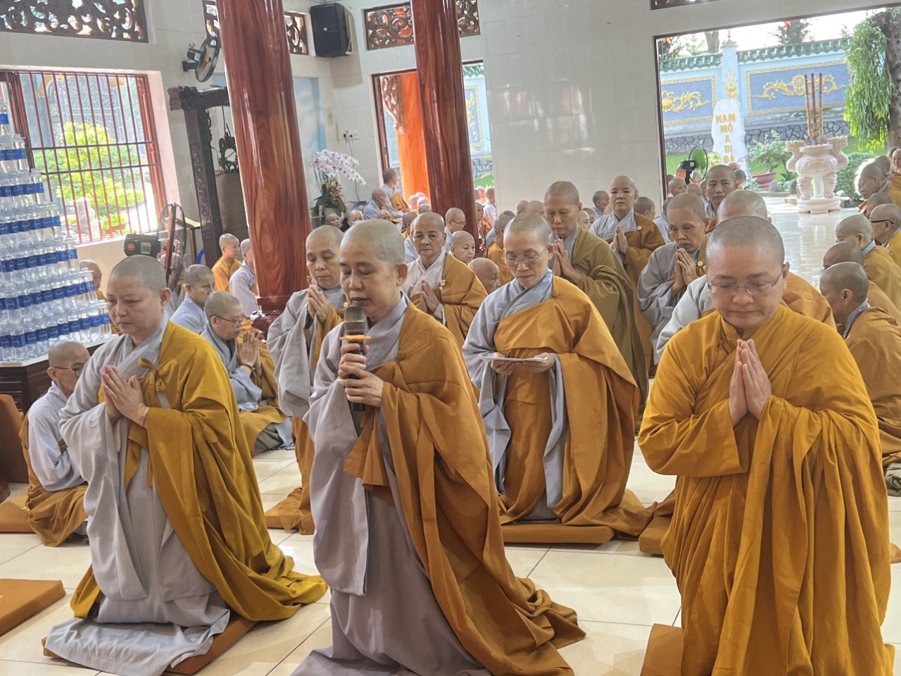 Ni sư Thích Nữ Tuệ Minh trưởng phân ban Ni giới huyện Nhơn Trạch và ban chức sự trường hạ chùa Diệu Âm đối trước đại Tăng thỉnh cầu giáo giới an cư cho Ni chúng.