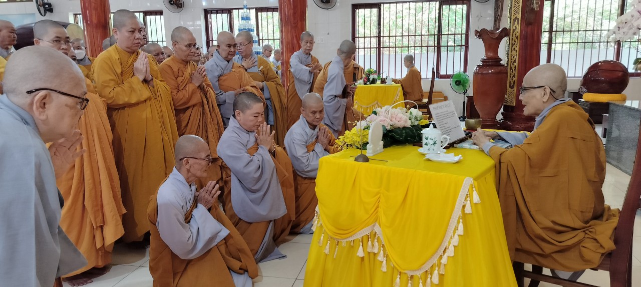 Hòa Thượng chứng minh ban lời giáo sắc và TT trưởng ban cũng ban lời sách tấn chỉ dạy NS trưởng phân ban Ni giới huyện Nhơn Trạch kết nối với chư Ni huyện Nhơn Trạch và ban chức sự đồng lòng để trưởng dưỡng đạo tâm, phụng sự giáo hội và giúp cho trường hạ chùa Diệu Âm được thành tựu tốt đẹp hơn.