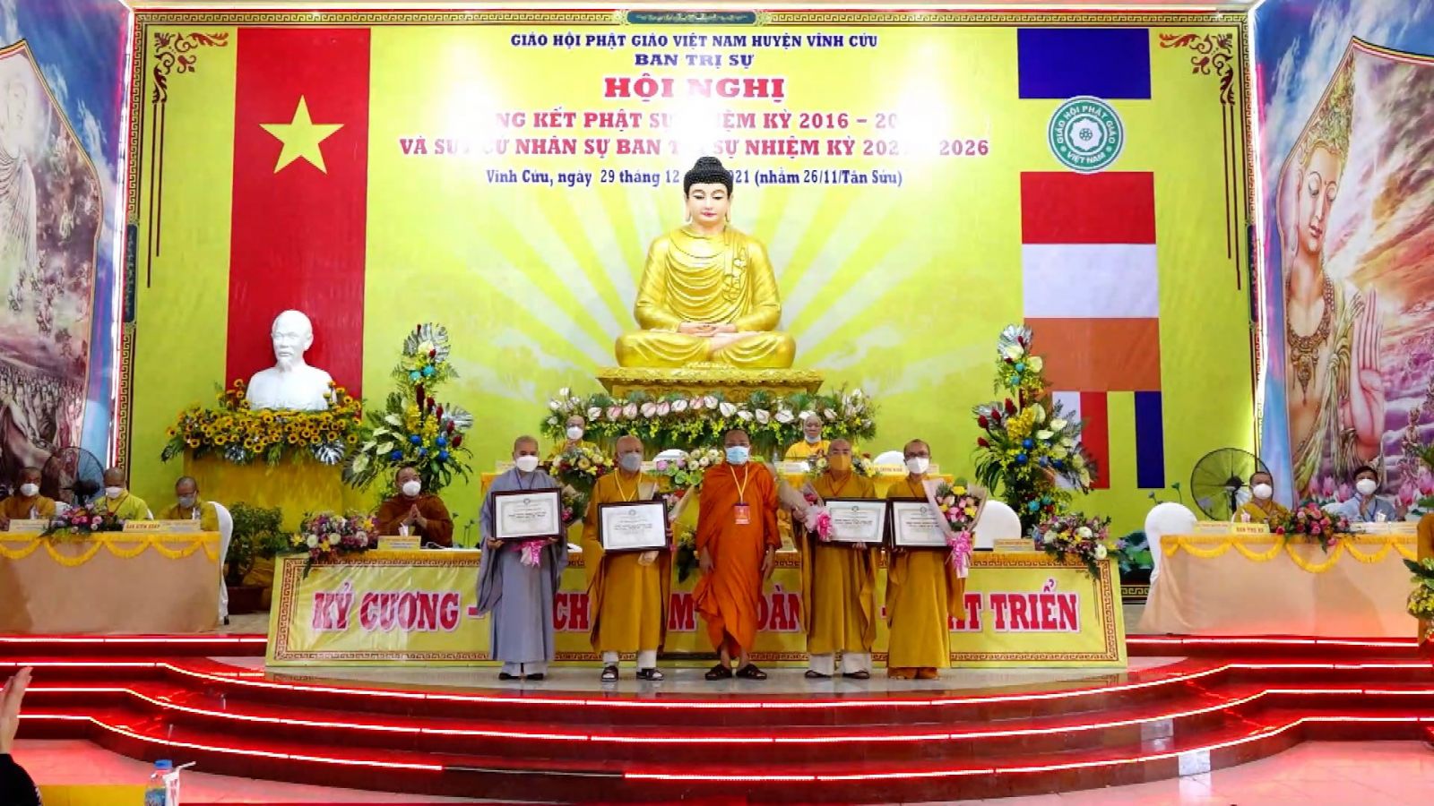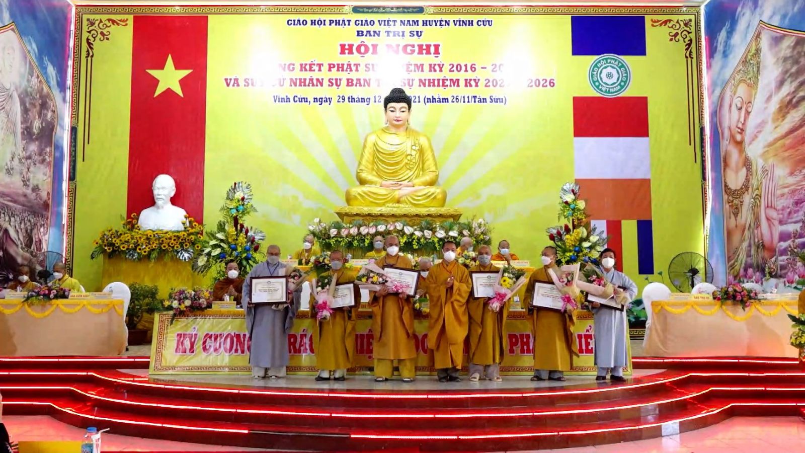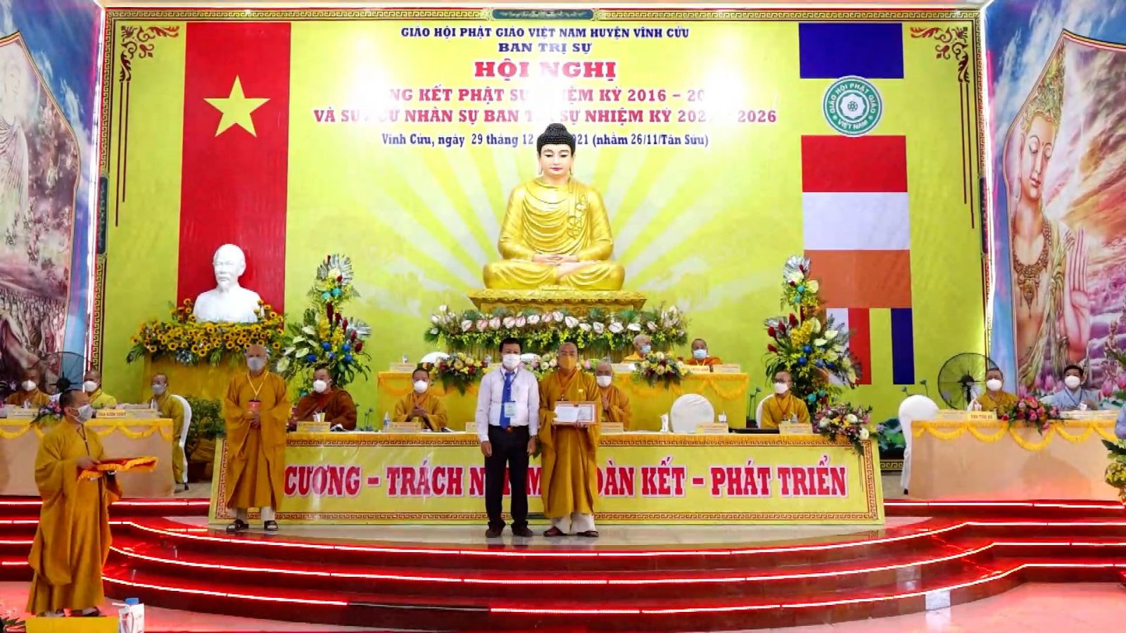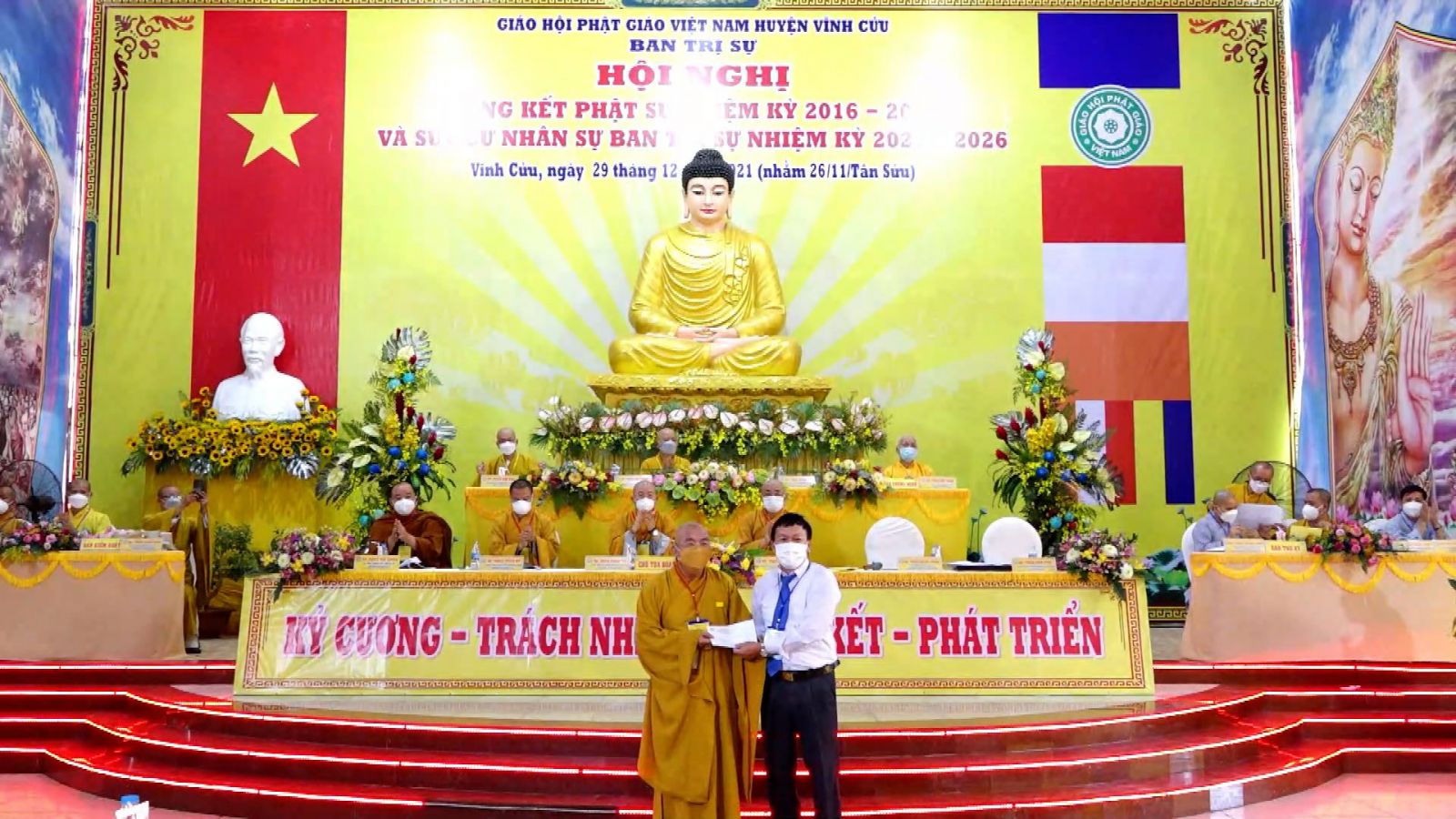 sau bài tóm tắt công tác phật sự nhiệm kỳ VIII (2016-2021) Ban Trị sự GHPGVN huyện Vĩnh Cửu đã tuyên bố mãn nhiệm, trong đó đã tri ân chư tôn đức Tăng Ni huyện nhà trong nhiệm kỳ qua đã đóng góp tích cực trong công tác phát triển của giáo hội phật giáo huyện.