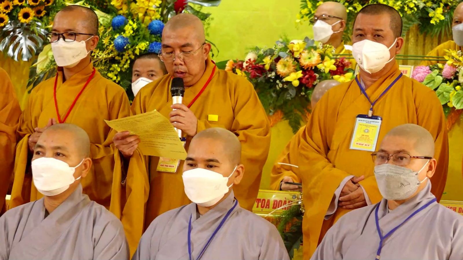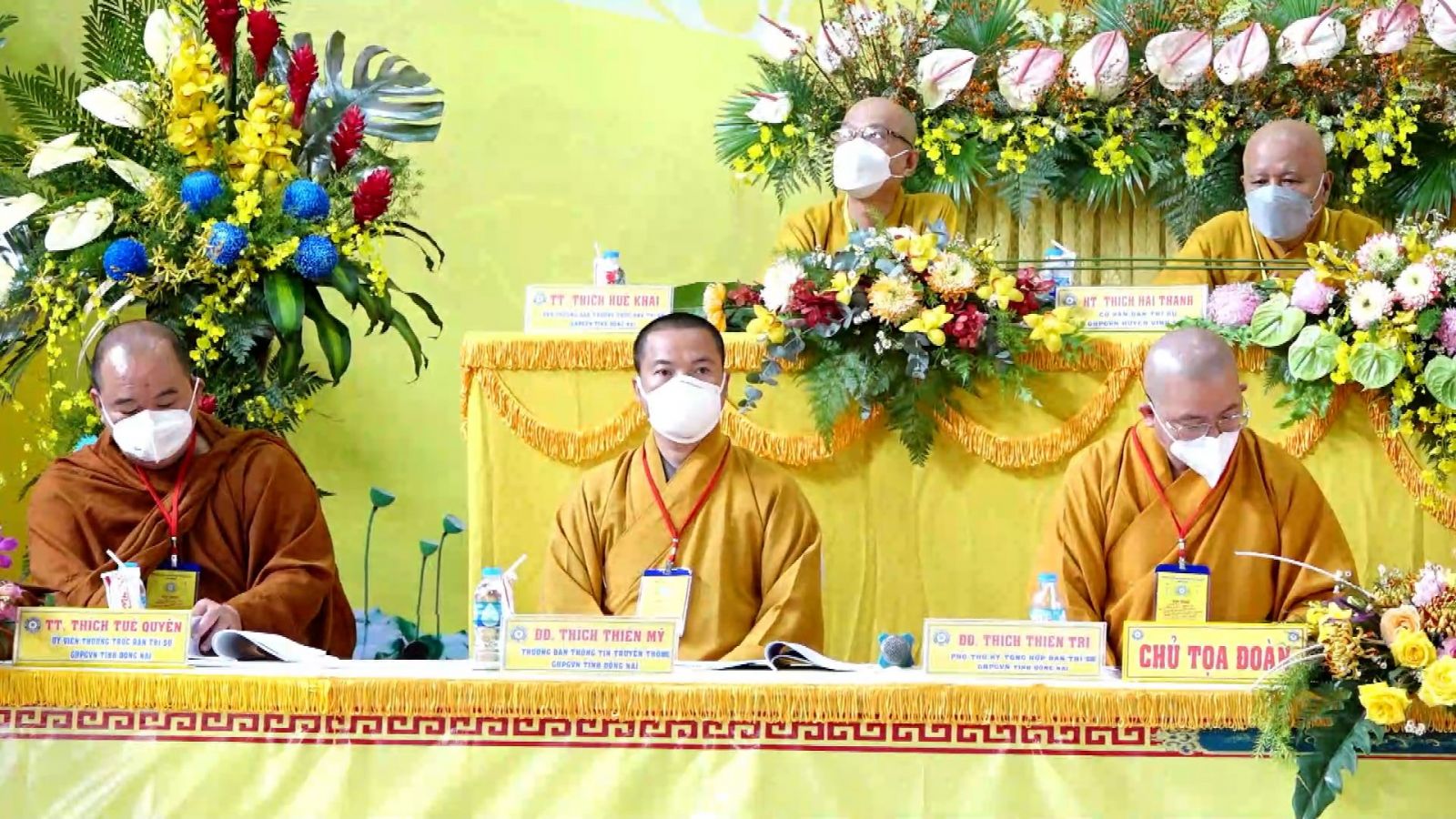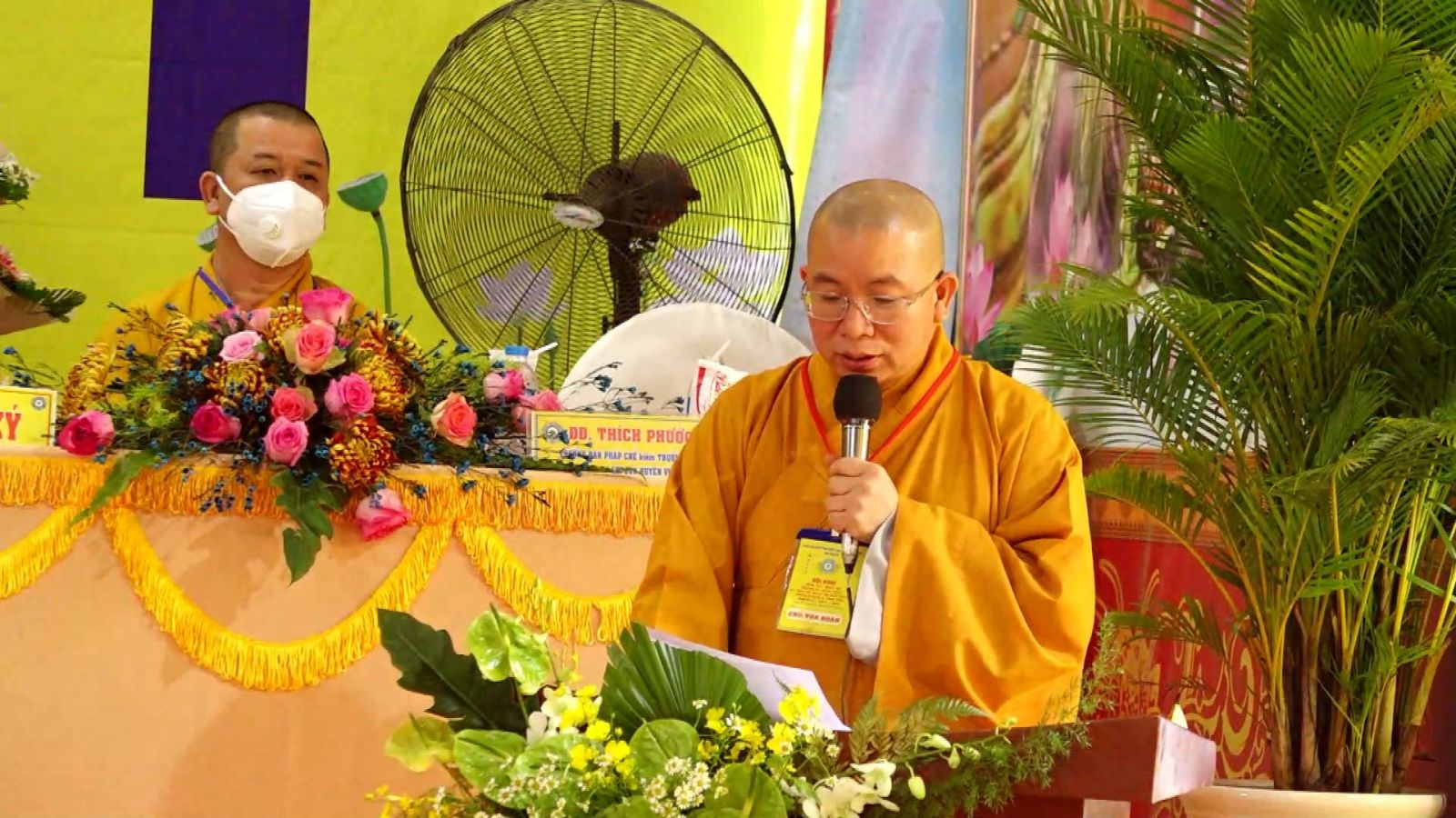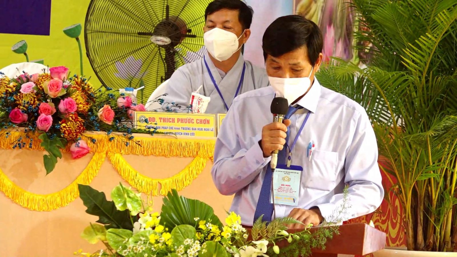 Sau phần tặng hoa, đoàn chủ tọa đã mời ĐĐ. Thích Kiến Tịnh – Phó BTS GHPGVN huyện Vĩnh Cửu Lên đọc và thông qua công tác Phật sự nhiệm kỳ VIII (2016-2021)