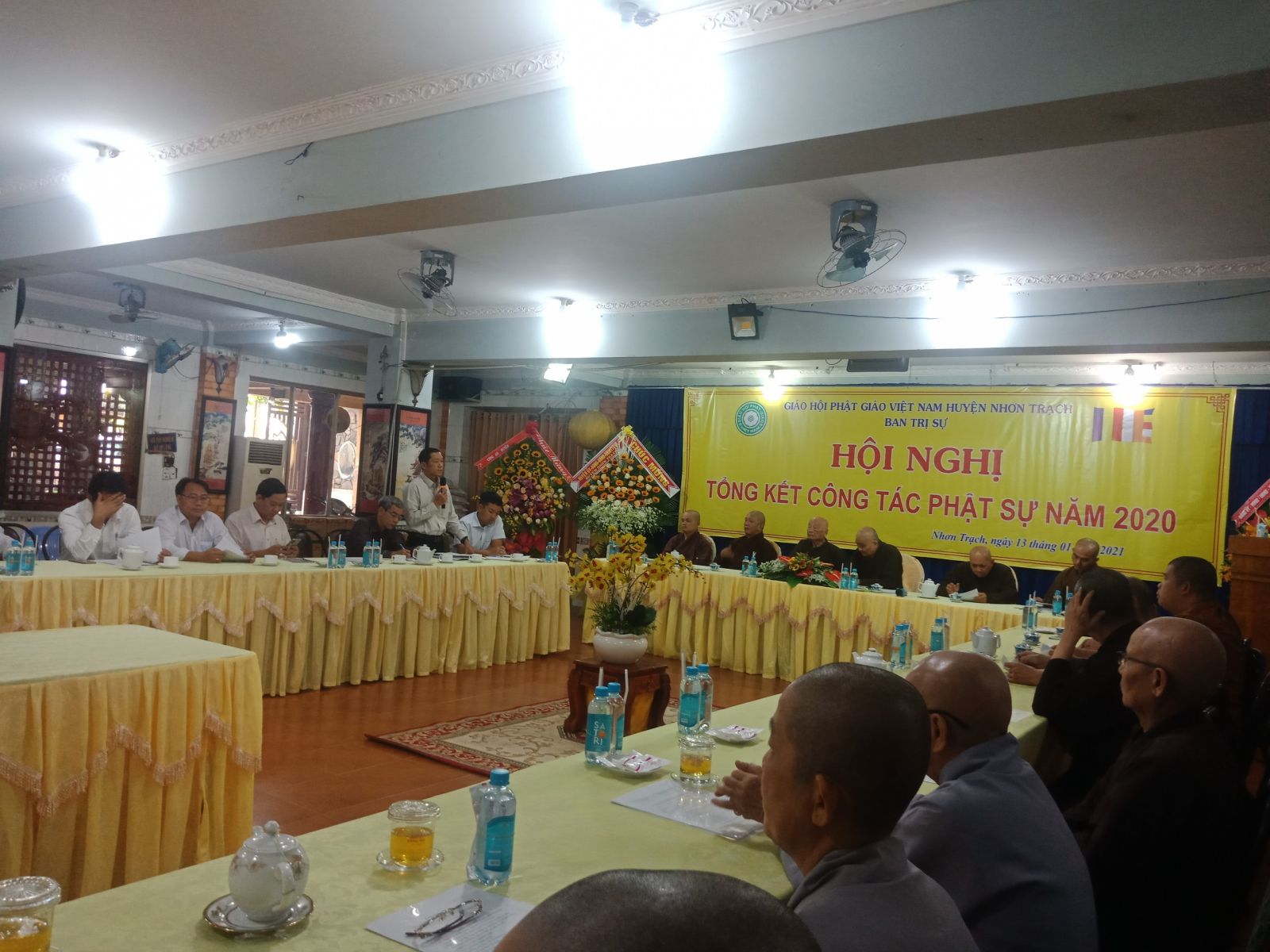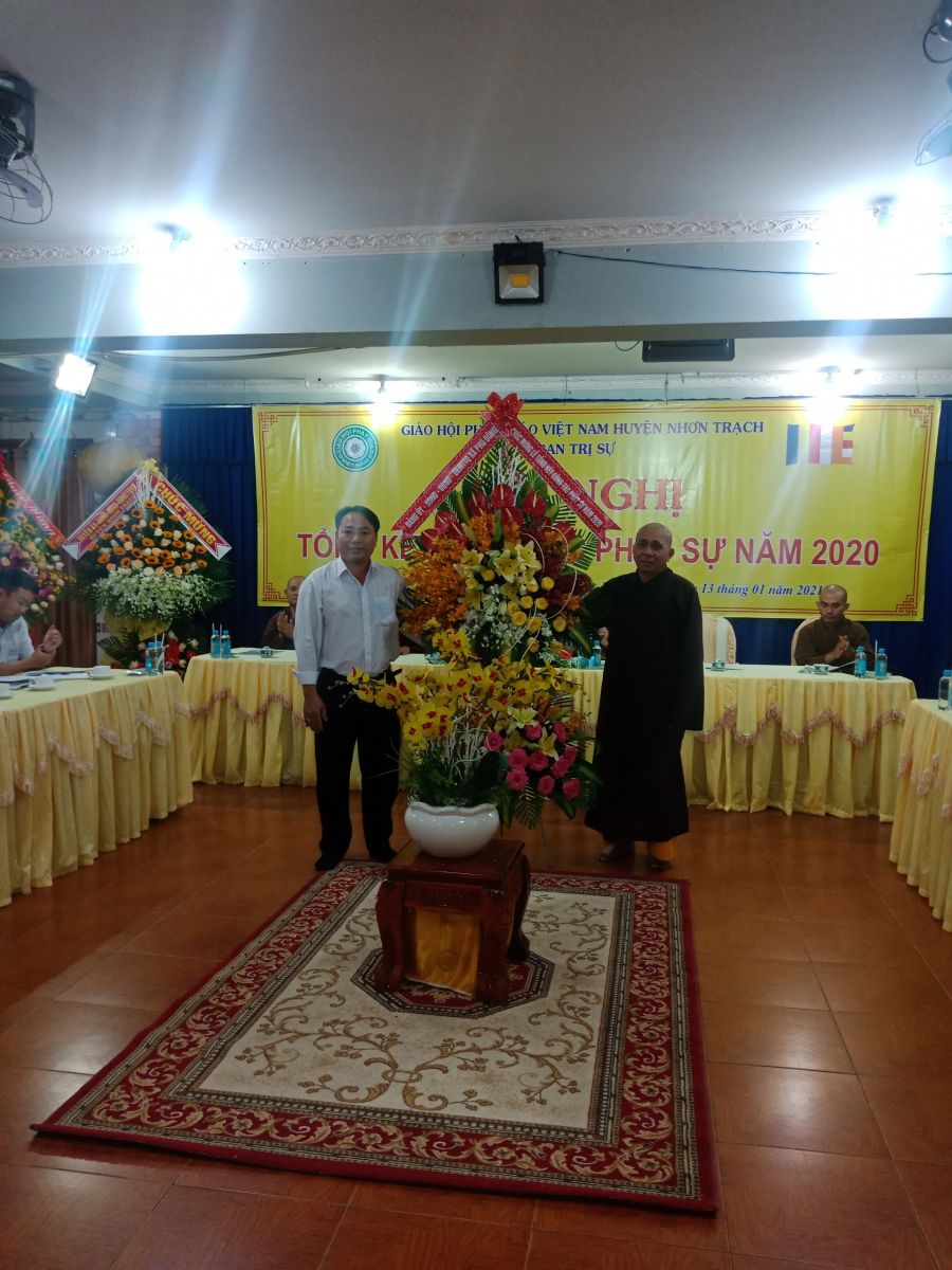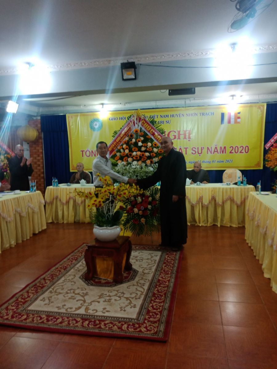 ĐĐ. Thích Minh Hạnh báo cáo công tác Phật sự năm 2020. Theo đó, huyện Nhơn Trạch hiện có 28 cơ sở Tự viện, 358 Tăng Ni và có các tự viện thường xuyên tổ chức khóa tu niệm Phật, thọ bát quan trai, hướng dẫn Phật tử tu học, đi cúng dường Trường hạ; hay các buổi lễ hàng năm như Lễ Phật Đản, An cư kiết hạ, Lễ Vu lan,… Đặc biệt năm nay dịch Covid-19 ảnh hưởng đến kinh tế xã hội nên không tụ tập đông người, có phần khiến các hoạt động bị đình trệ. Tuy nhiên về mặt từ thiện năm nay, các tự viện đã kêu gọi quý Phật tử, mạnh thường quân chung tay giúp đỡ bà con trong đợt dịch Covid-19 và bão lụt miền Trung với nhiều hình thức khác nhau như nấu cơm từ thiện, phát bánh mì, bánh ướt cho công nhân ăn sáng, gạo, mì, áo quần, phát học bổng, thuốc men, chăn mền,… động viên thăm hỏi sức khỏe bằng những phần quà đầy yêu thương để chia sẻ khó khăn phần nào trong cuộc sống. Tổng số tiền từ thiện là 14.920.000.000 đồng (mười bốn tỷ chín trăm hai mươi triệu đồng).