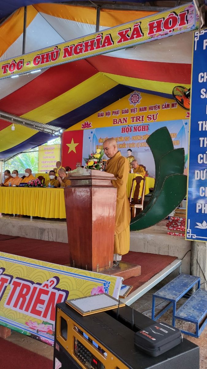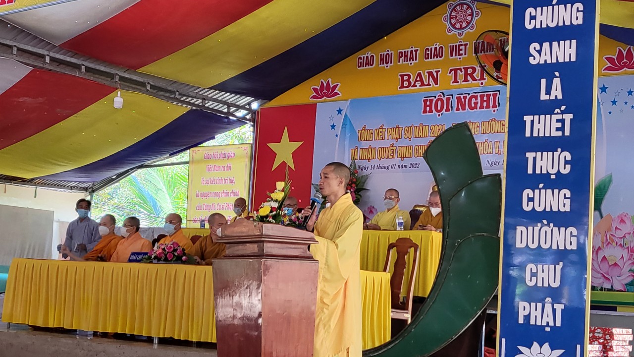 Tại hội nghị, ĐĐ Thích Quảng Lý thay mặt đoàn chủ tọa tuyên bố khai mạc hội nghị. Tiếp đó, Đại đức Thích Thái Tâm - Phó Thư ký kiêm Chánh Văn Phòng Ban Trị sự GHPGVN huyện thay mặt Ban Thư ký báo cáo tóm lược hoạt động Phật sự năm 2021 và ĐĐ Thích Lạc Phong trình qua phương hướng hoạt động Phật sự năm 2022.