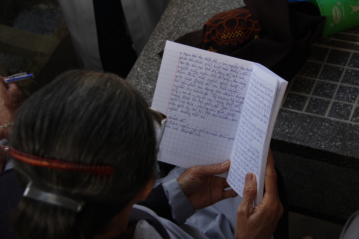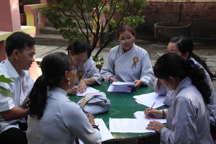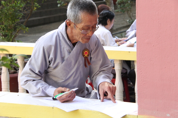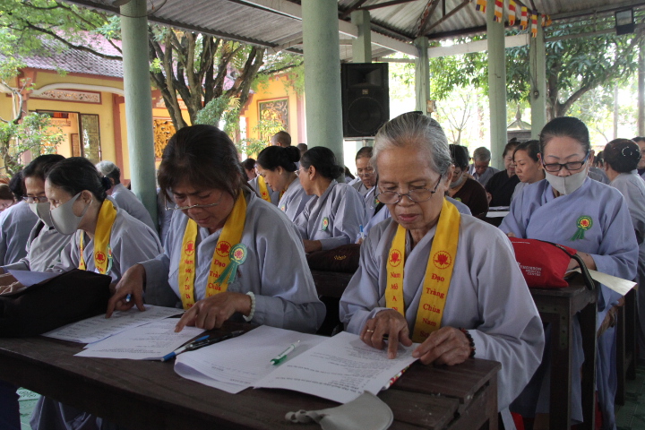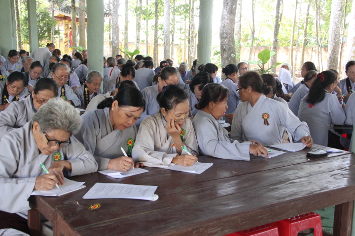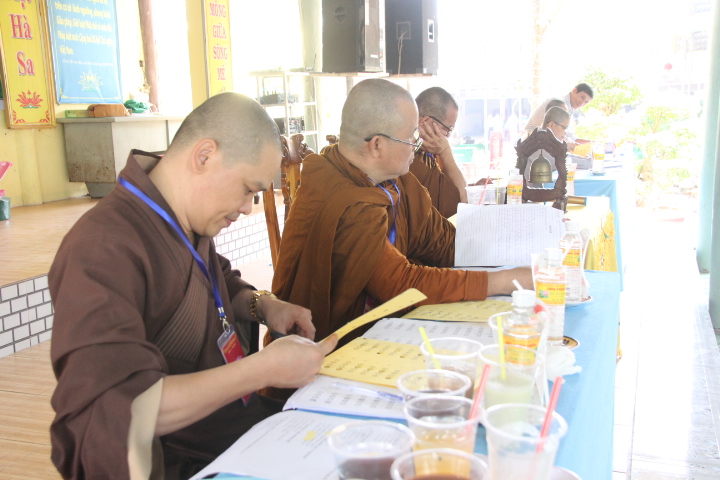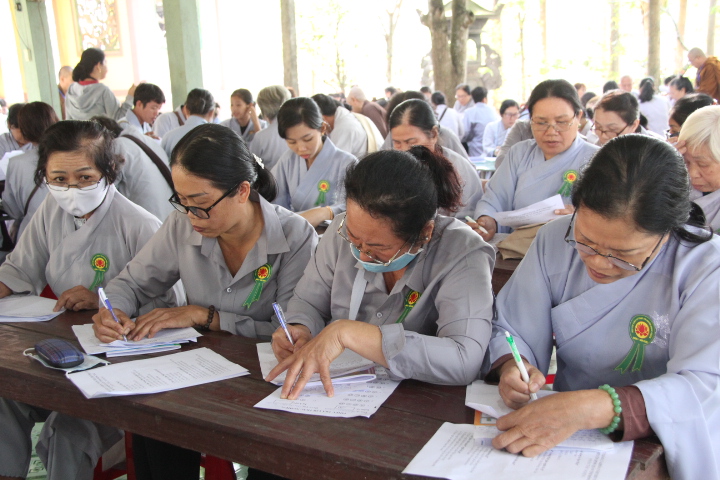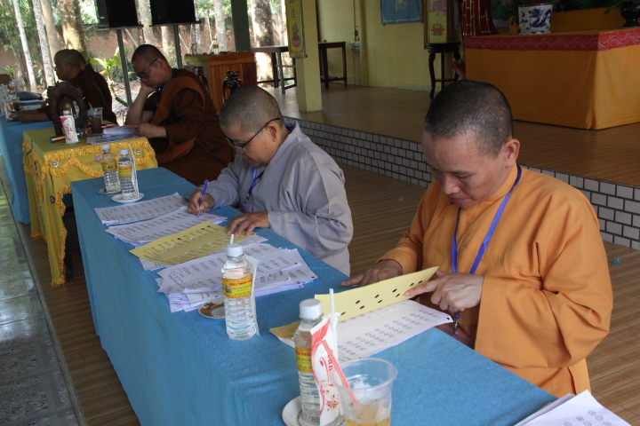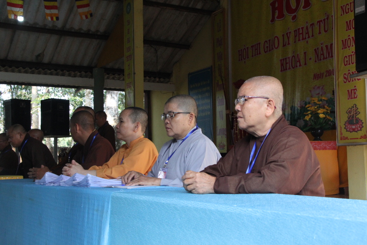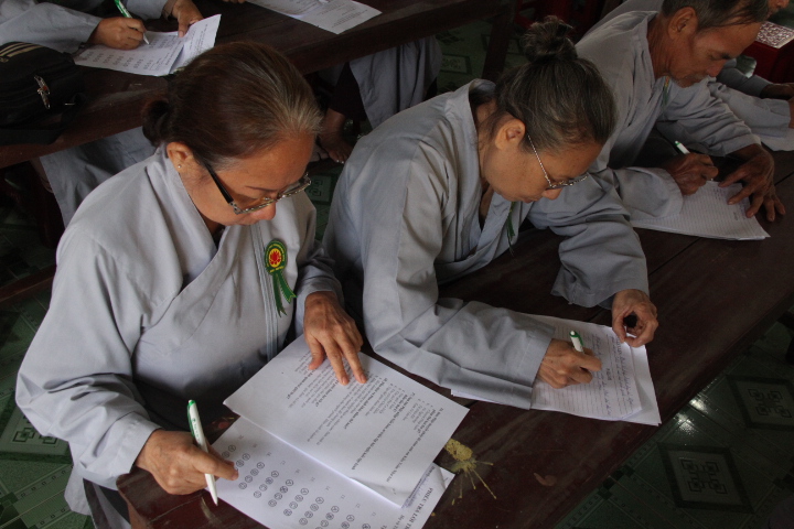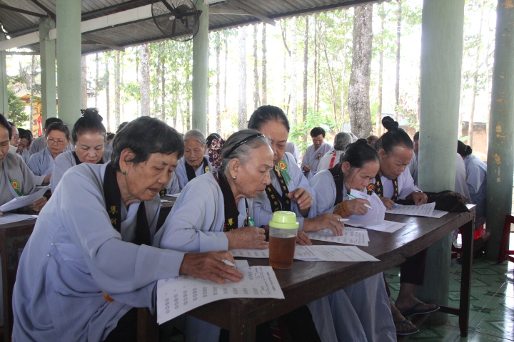 Thí sinh đã làm bài trong 90 phút, nội dung đề thi gồm 20 câu trắc nghiệm Phật học phổ thông mức độ cơ bản và một câu tự luận chủ đề về Ngũ giới. Mặc dù không gian chật hẹp, thí sinh phải ngồi khá gần nhau nhưng tinh thần tự lực và muốn đánh giá khả năng của chính mình, các thí sinh làm bài khá nghiêm túc.