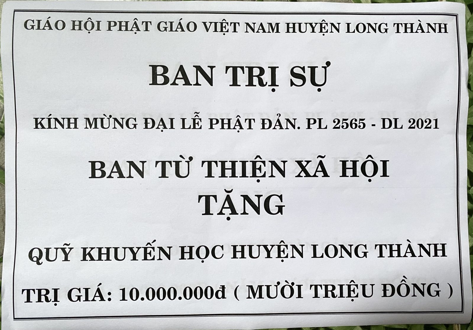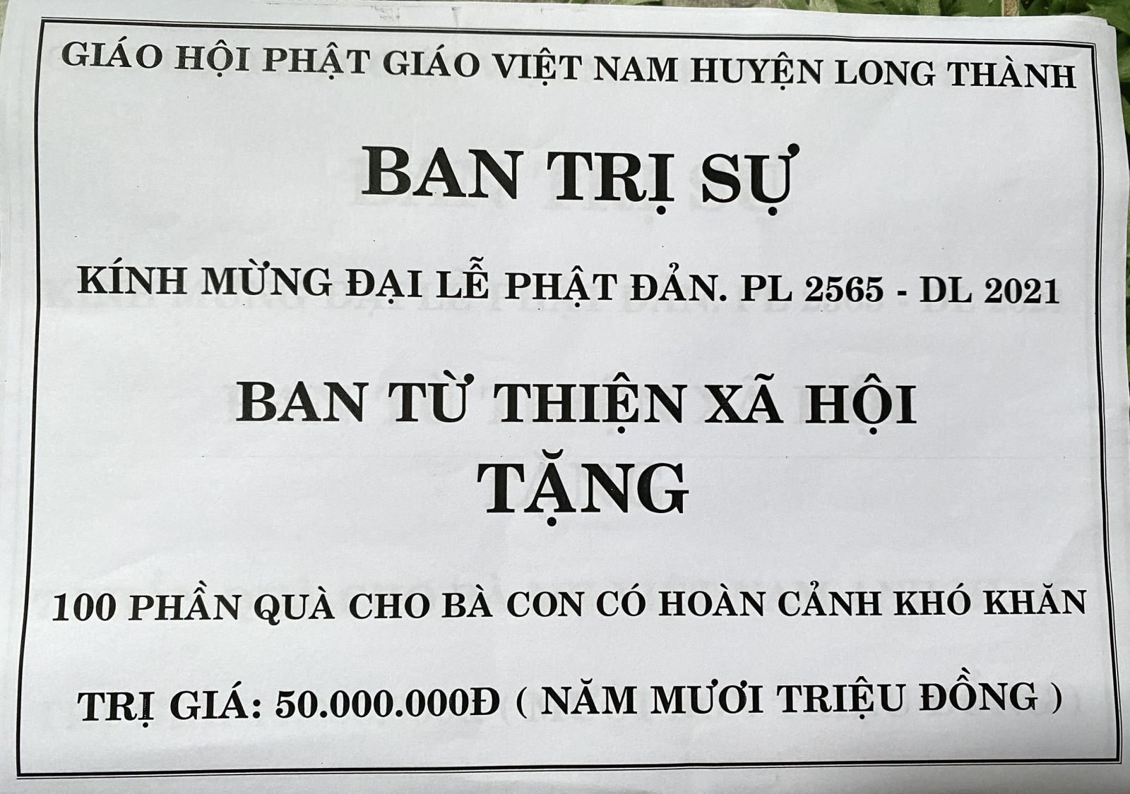 Tổng giá trị các phần quà là 74.000.000 đồng, do Tăng Ni cơ sở Phật giáo huyện Long Thành đóng góp, phát tâm. Do tình hình dịch bệnh diễn biến phức tạp nên buổi lễ trao quà gián tiếp cho các đại diện để tránh tập trung đông người, đảm bảo công tác phòng chống dịch an toàn.