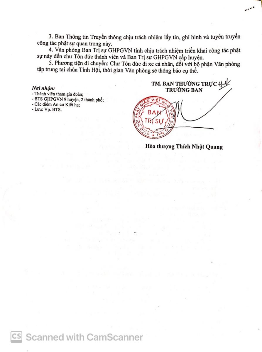 | Nơi nhận: - Thành viên tham gia đoàn; - BTS GHPGVN 9 huyện, 2 thành phố; - Các điểm An cư Kiết hạ; - Lưu: Vp BTS. |