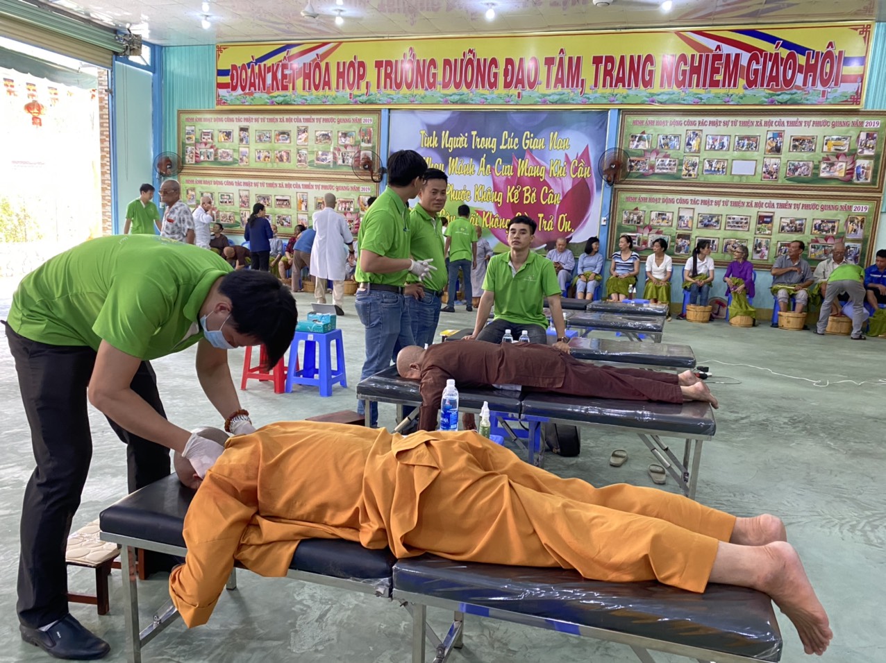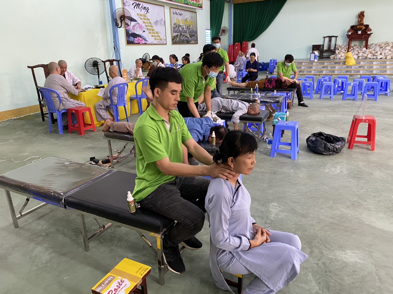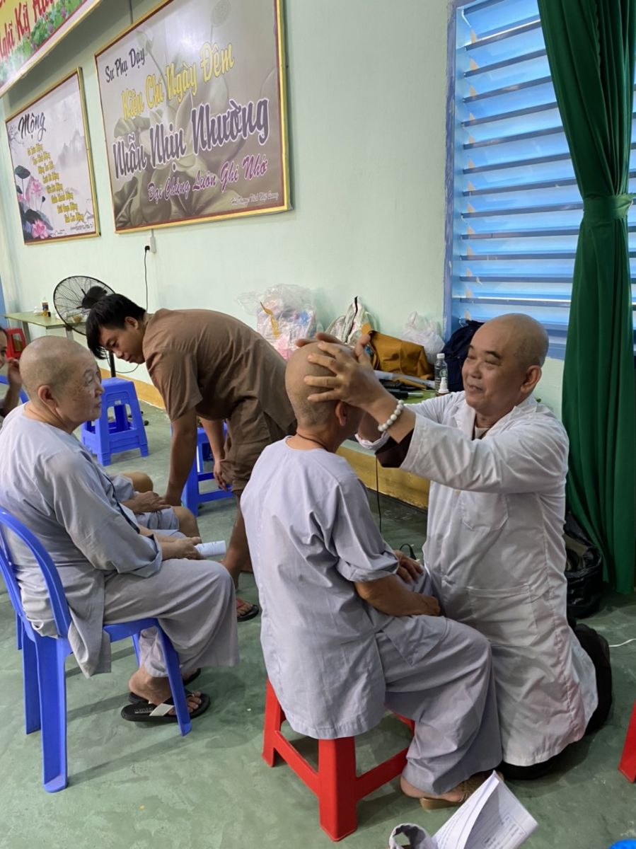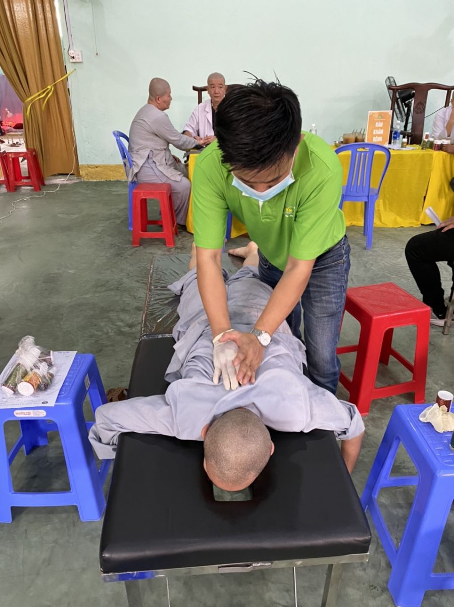 Cụ thể, đoàn từ thiện đã tham gia phục vụ thuốc ngâm chân, châm cứu, day ấn huyệt, đắp thuốc cho Chư tôn Đức Tăng, Ni khu vực Ngoại viện Thường chiếu, bà con sinh sống tại địa bàn huyện Long Thành. Sau 2 ngày thăm khám, đoàn đã hỗ trợ và phục vụ trên 700 bệnh nhân.