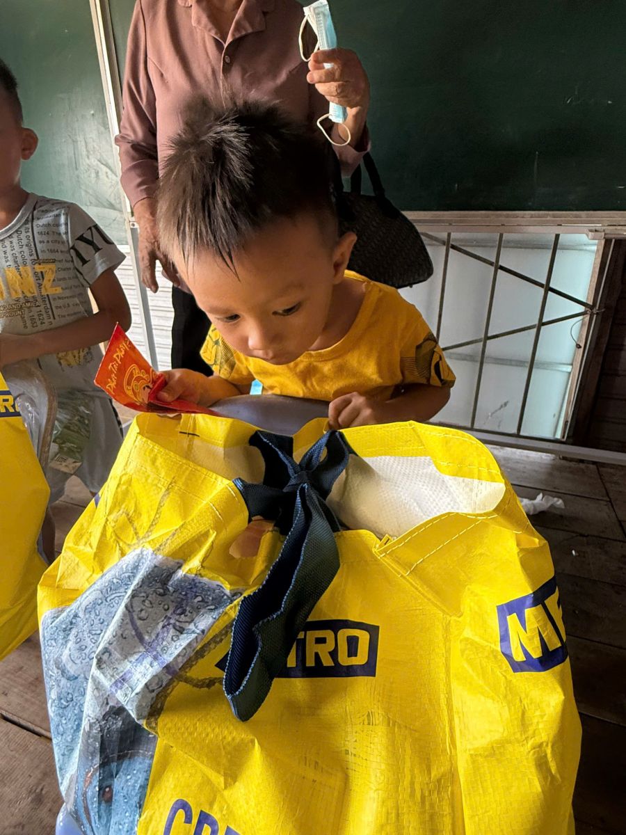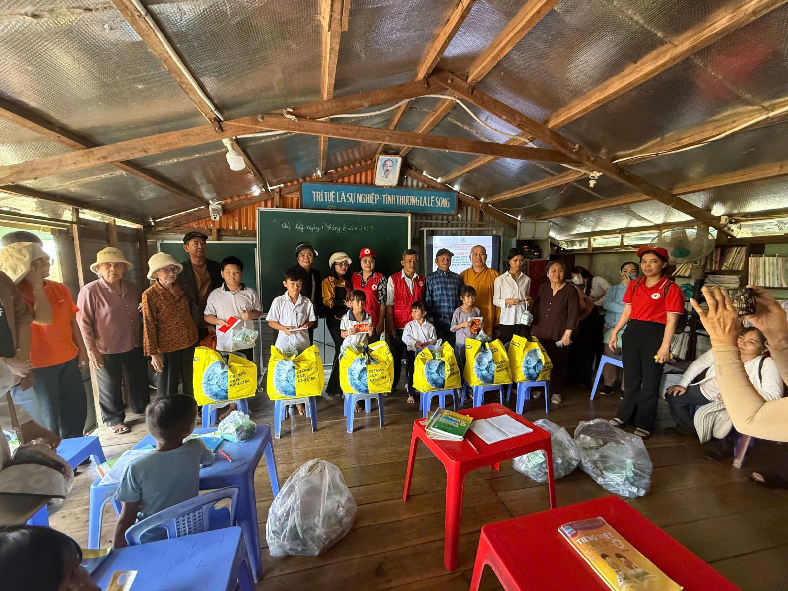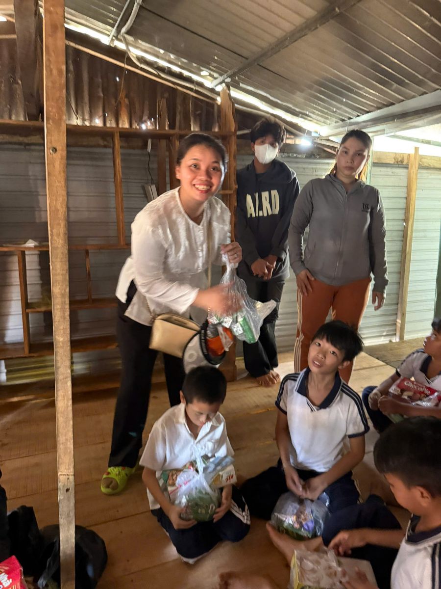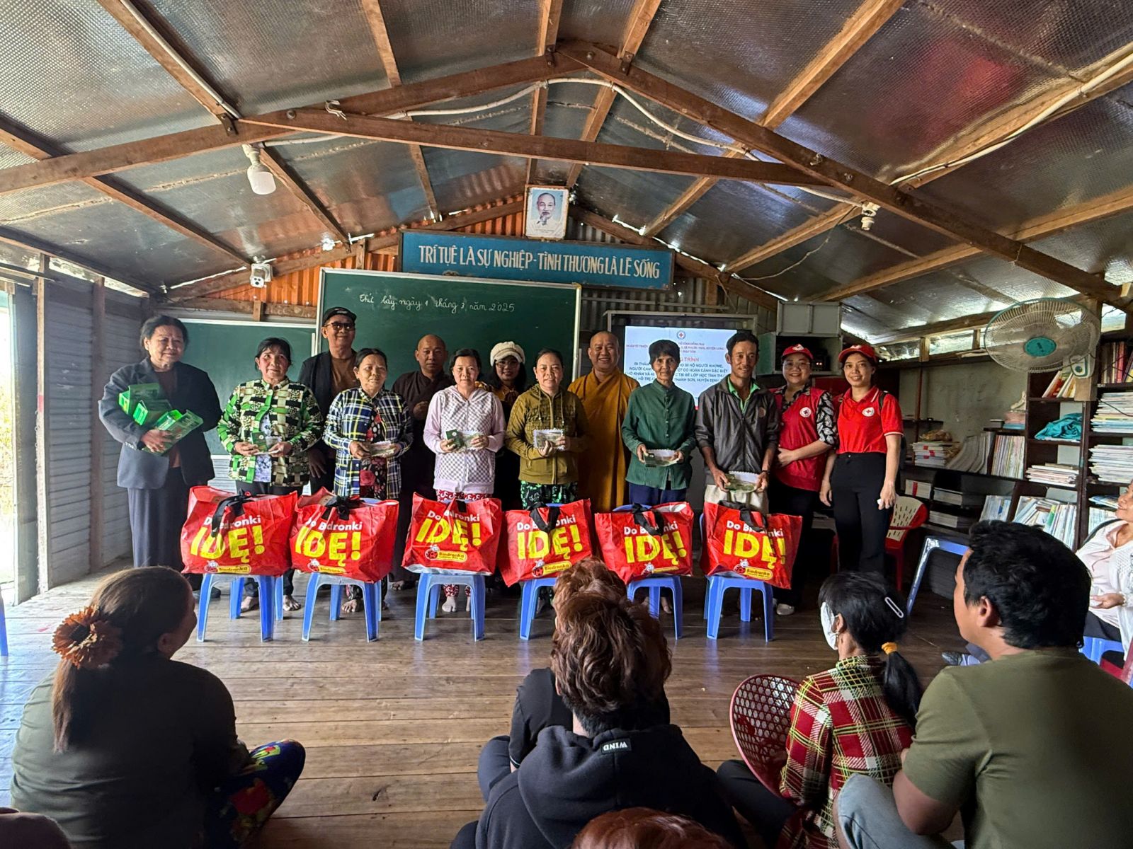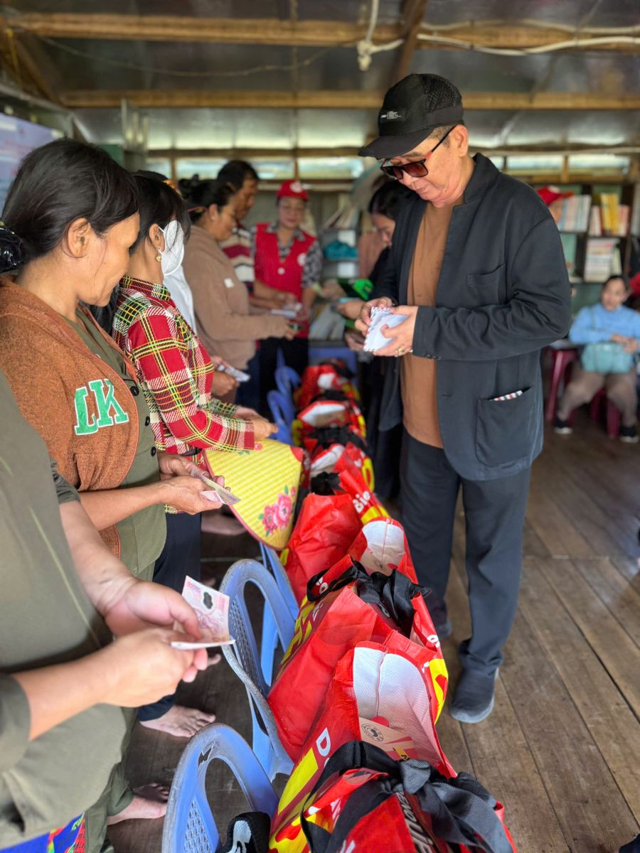 Tại đây đoàn trao tặng 70 phần quà, trong đó có 40 phần quà cho trẻ em là học sinh lớp học tình thương trên hồ Trị An, mỗi phần quà trị giá 840. 000đ gồm tập vở học sinh, viết, bánh kẹo, sữa hộp và bì thư 300 ngàn tiền mặt. 30 phần quà trao cho hộ gia đình người Khơ me, người Campuchia gốc Việt có hoàn cảnh khó khăn đang cư ngụ tại làng bè, mỗi phần quà trị giá 650 ngàn đồng gồm các nhu yếu phẩm cần thiết như dầu gió xanh, 05 kg gạo, 01 thùng mì, 01 chai dầu ăn, nước mắm, nước tương, muối, đường cát và bao thư 100 ngàn đồng tiền mặt.