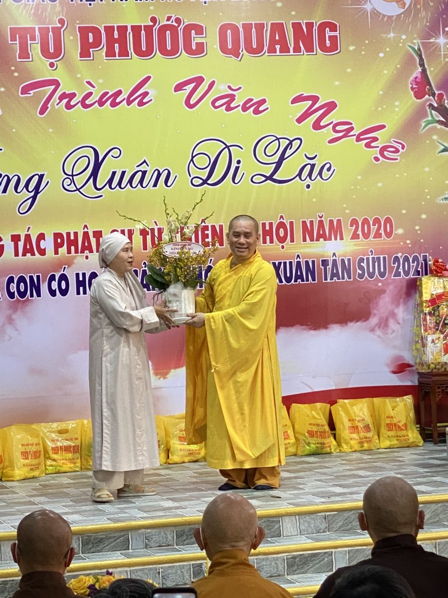 Theo báo cáo tổng kết Công tác từ thiện của Thiền tự Phước Quang năm 2020 đã trao 6.168 phần cùng với 30 suất quà học bổng, xây dựng 4 căn nhà tình thương, 14 xe lăn, 145 máy lọc nước lớn nhỏ, 30 thẻ bảo hiểm y tế, 3 giếng khoan, hơn 26,5 tấn gạo để tặng cho bà con trong đợt dịch COVID-19 vừa qua. Tổng giá trị thành tiền của các phần quà là. 4.196.600.000 đồng (bốn tỷ một trăm chín mươi sáu triệu sáu trăm nghìn đồng).