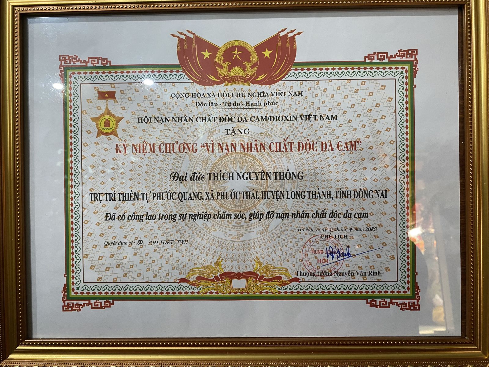 Trong buổi lễ, Đại Đức Thích Nguyên Thông vinh dự nhận được Kỷ niệm chương vì Nạn nhân chất độc da cam của Hội Nạn nhân chất độc da cam/Dioxin Việt Nam trao tặng.