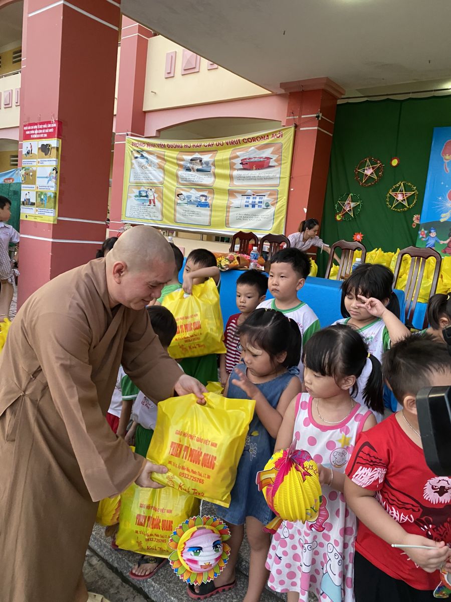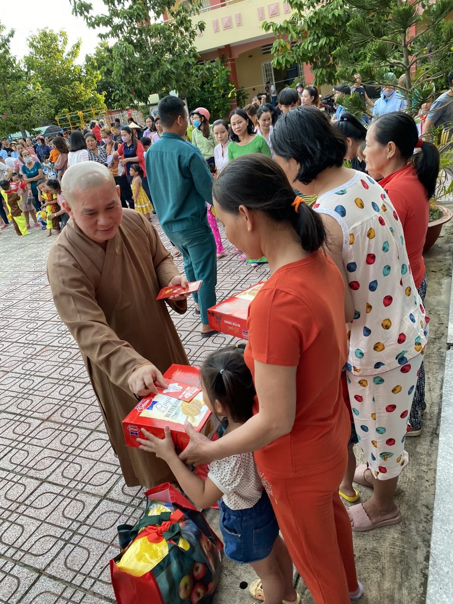 Ngay sau đó, Đại Đức Thích Nguyên Thông đã tiếp tục trao tăng 300 phần quà đến các em nhỏ có hoàn cảnh khó khăn đang học tại Trường Mầm non xã Long An. Đồng thời, Đại Đức cũng gửi tặng 20 phần quà cho các bậc phụ huynh là công nhân, hiện đang thuê trọ và làm việc tại xã Long An.