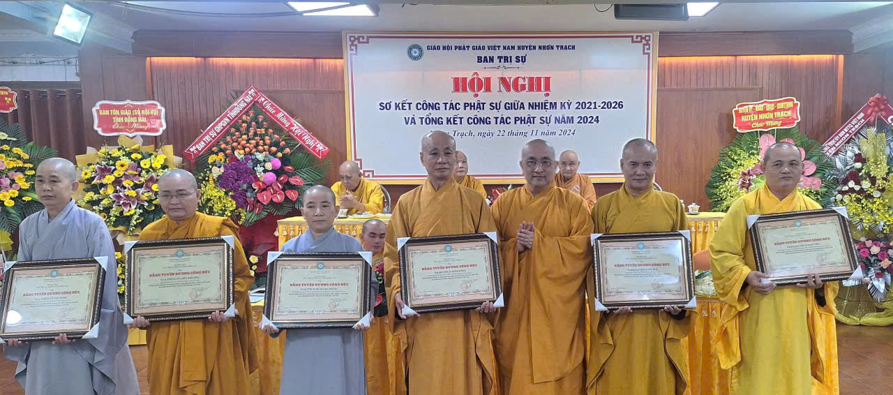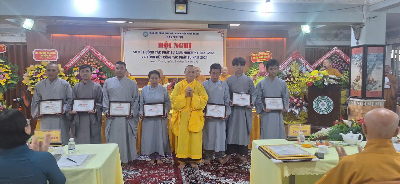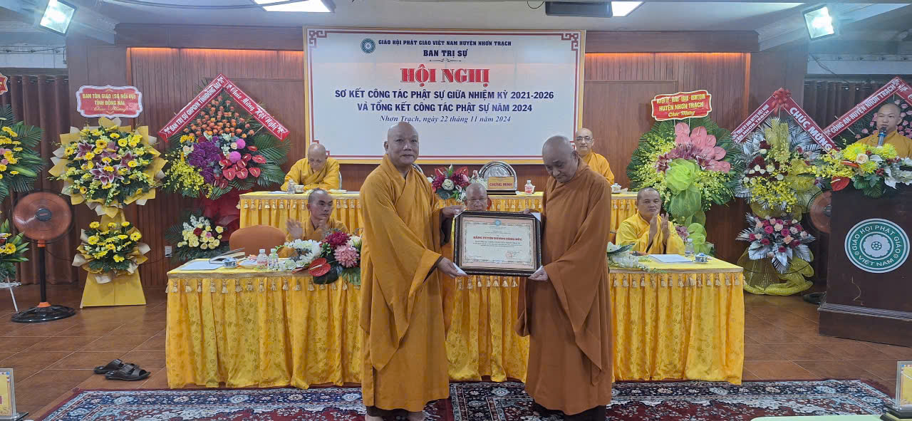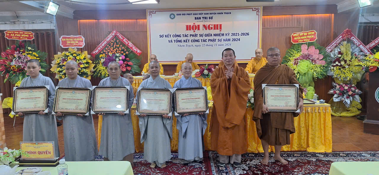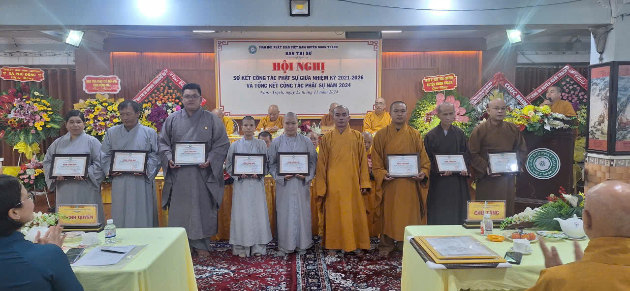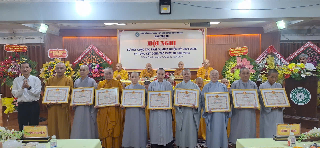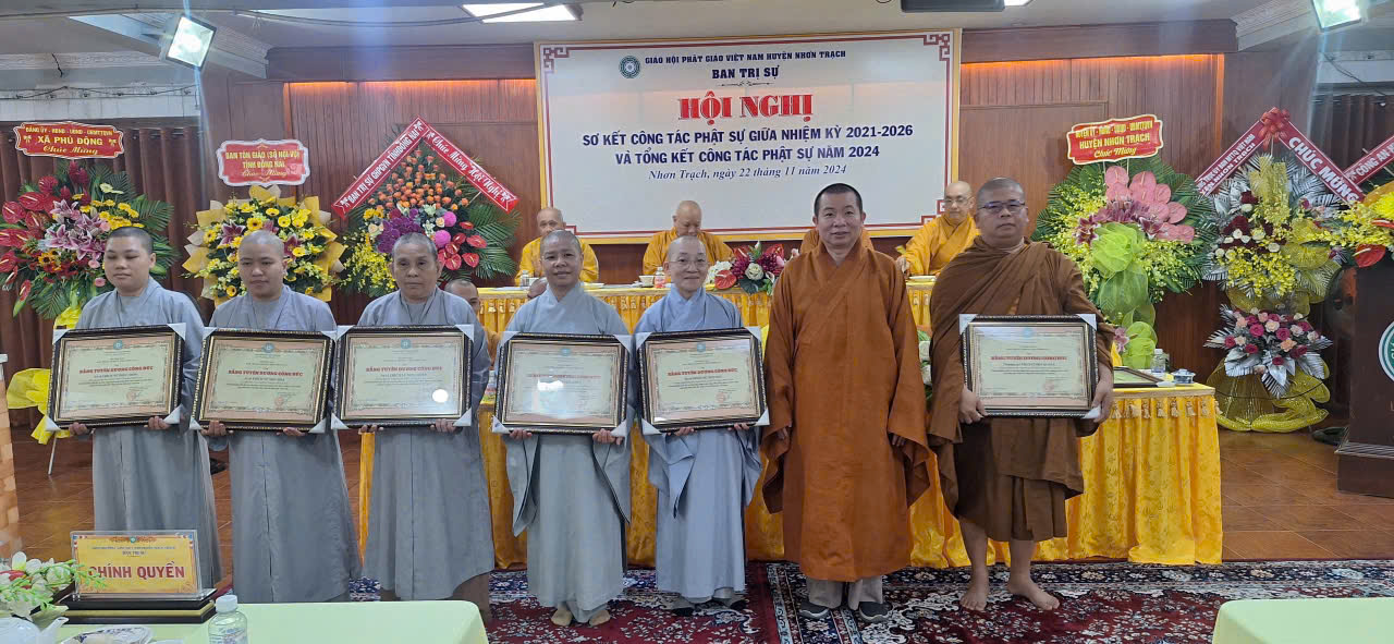 Cũng trong hội nghị, BTS GHPGVN tỉnh Đồng Nai, BTS GHPGVN huyện Nhơn Trạch và UBND huyện Nhơn Trạch đã trao tặng bằng tuyên dương công đức và giấy khen cho những cá nhân, tập thể đã đạt thành tích xuất sắc trong công tác Phật sự nơi huyện nhà.