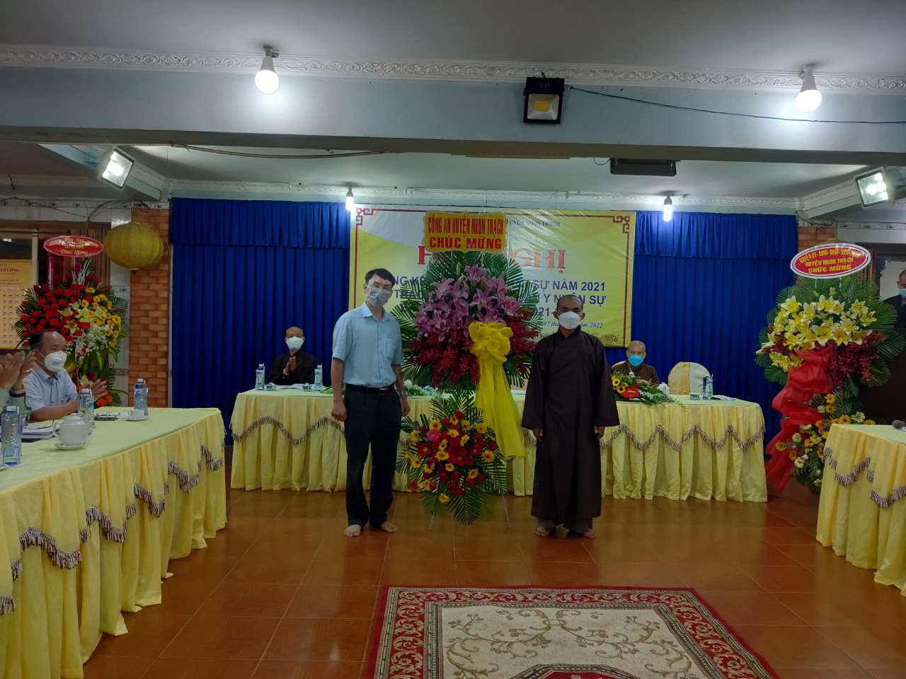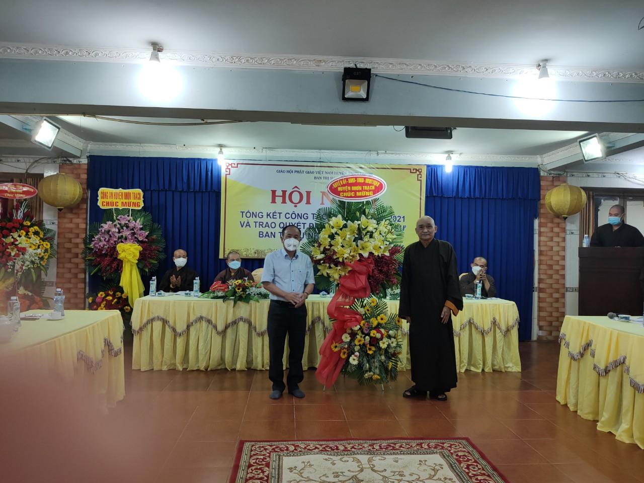 Để ghi nhận những thành tích mà Ban Trị sự Phật giáo huyện đã đạt được trong năm 2021. Huyện ủy – HĐND – UBND - UBMTTQ huyện Nhơn Trạch, Đảng ủy- HĐND- UBND – UBMTTQ xã Phú Đông đã trao những lẵng hoa tươi thắm chúc mừng Hội nghị thành công tốt đẹp.