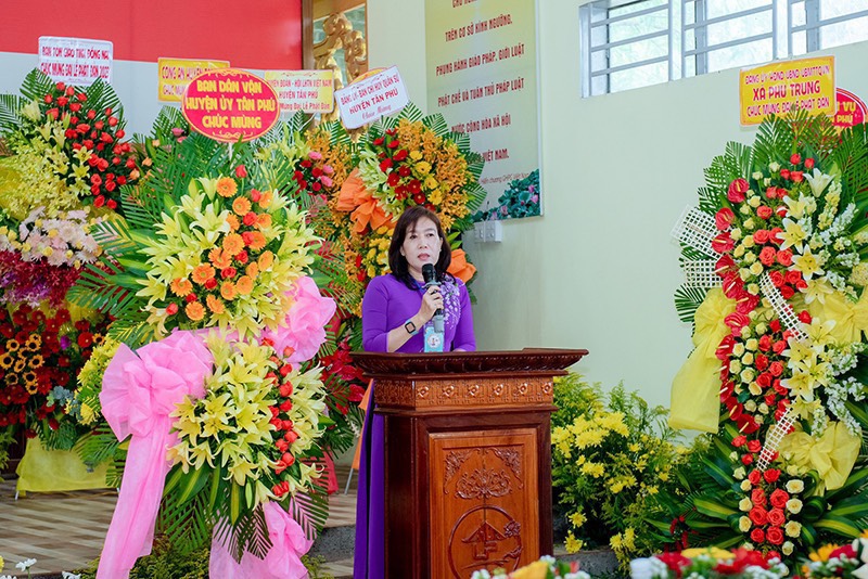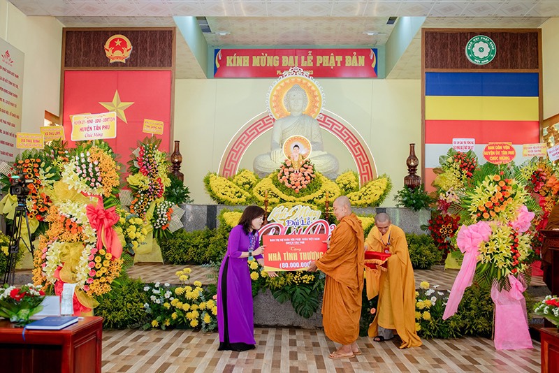 Nhân dịp này, đại diện Ban trị sự huyện Tân Phú đã trao tặng một căn nhà tình thương trị giá 80 triệu đồng cho 01 hộ nghèo khó khăn trong huyện do bà Phạm Thị Lý – Chủ tịch UBMTTQ huyện Tân Phú đón nhận, và 20 suất học bổng cho các em hiếu học trong gia đình Phật tử và trong địa bàn xã, mỗi suất trị giá 1 triệu đồng. Đây là hoạt động ươm mầm trí tuệ thể hiện tinh thần Đạo Phật là Đạo Từ bi và Trí tuệ.