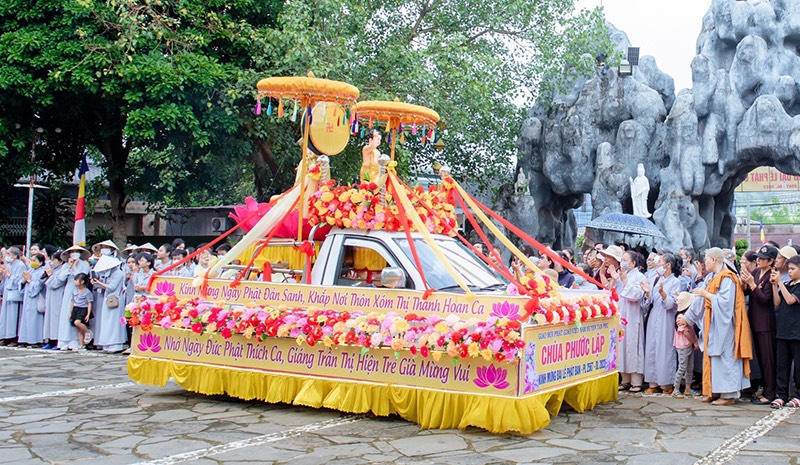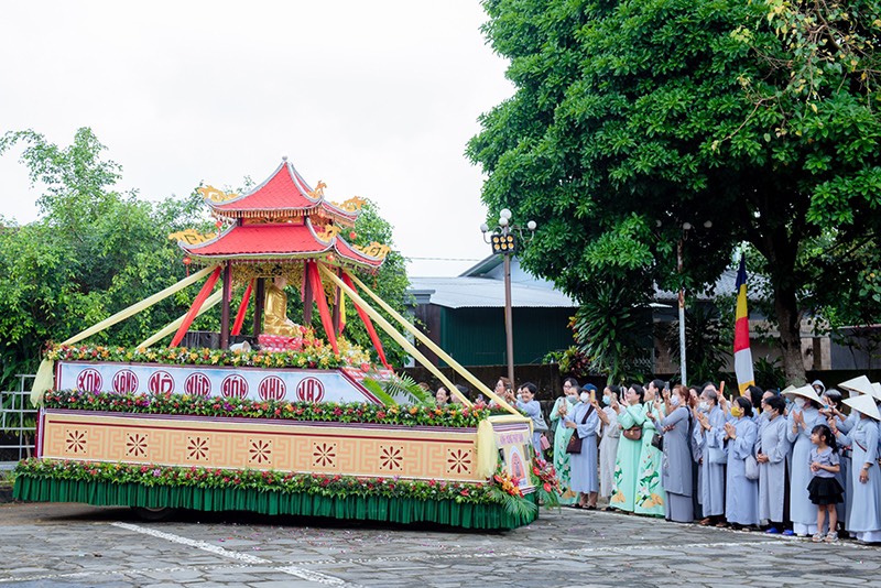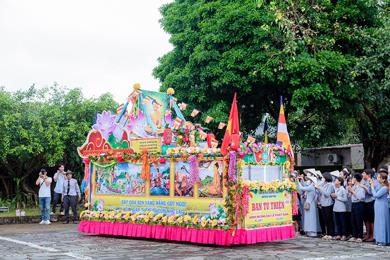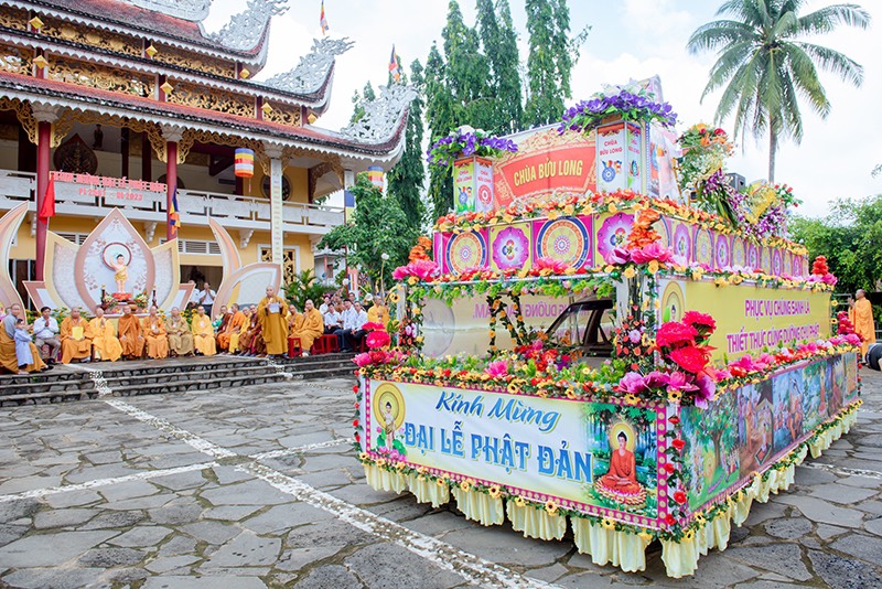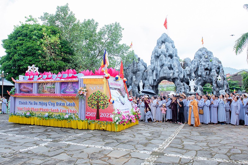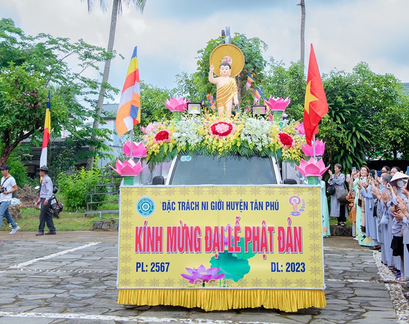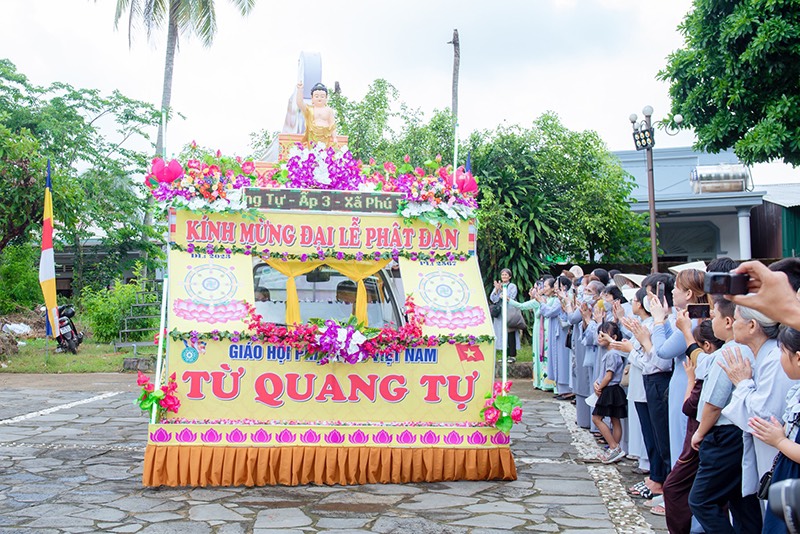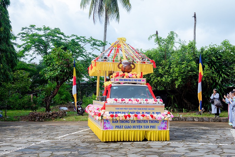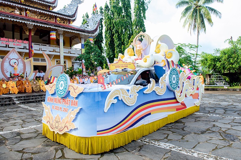 Sáng sớm, trước khi diễn ra đại lễ, toàn thể Đạo tràng đã hân hoan chào đón màn quang lâm diễu hành xe hoa của các cơ sở tự viện trong huyện được thiết trí trang nghiêm, đầy màu sắc trong khuôn viên chùa Linh Phú. Đây là màn trình diễn chuẩn bị cho lễ diễu hành xe hoa trên địa bàn huyện diễn ra vào tối ngày 11/04 năm Quý Mão nhằm tái hiện sự ra đời của Đấng từ phụ, báo Phật ân đức của bậc Giác ngộ vì đại sự nhân duyên mà ra đời.