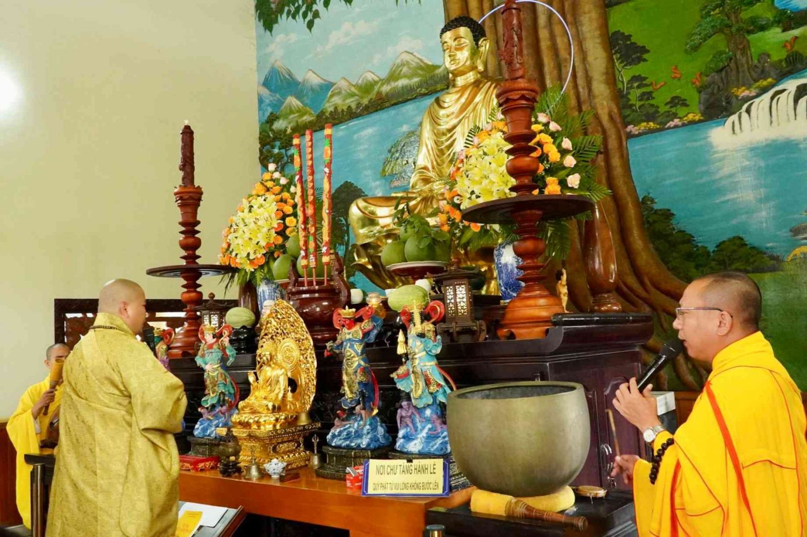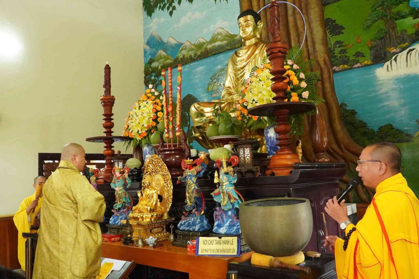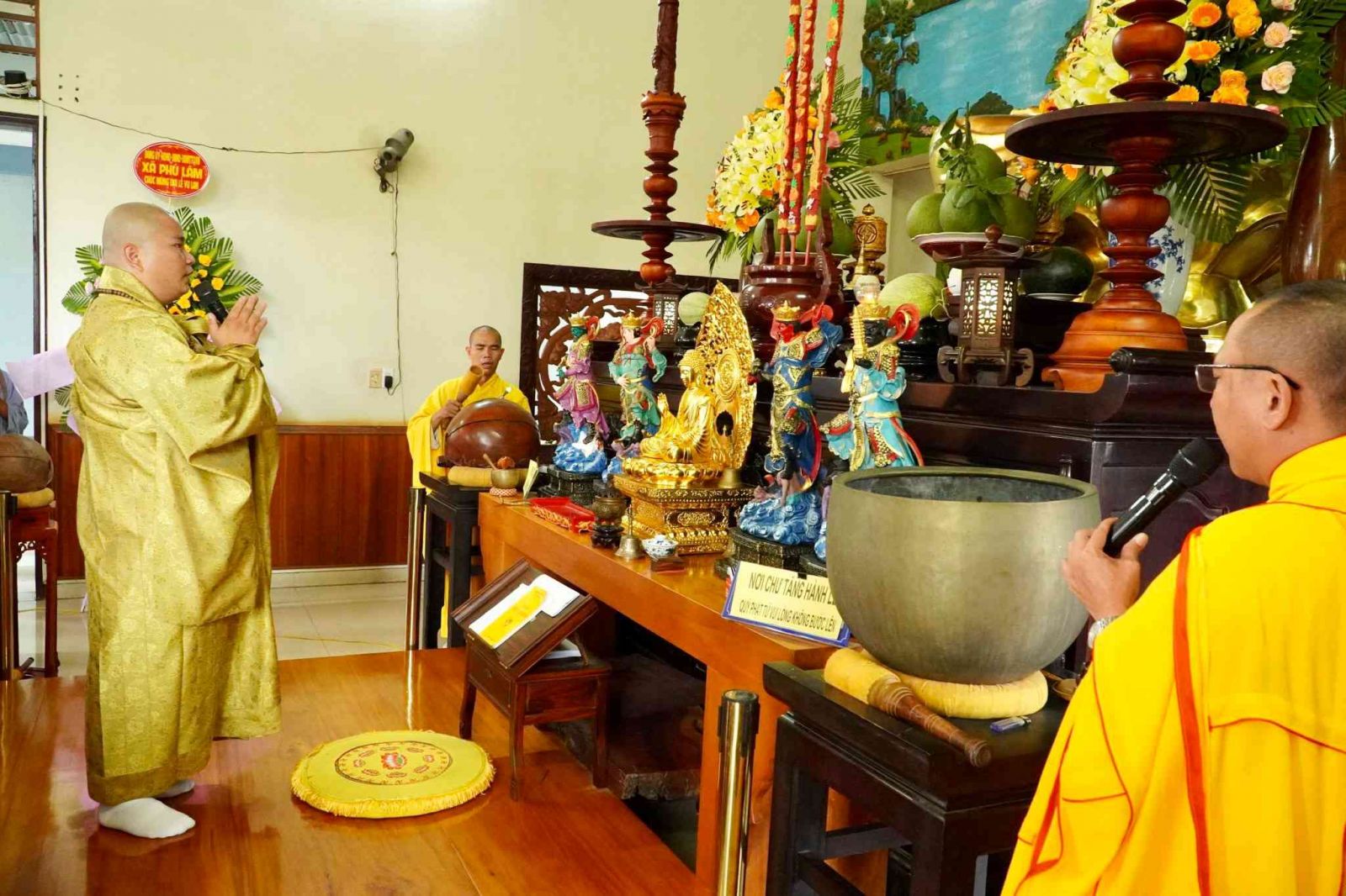 Sau buổi thuyết giảng ĐĐ Thích Pháp Vinh - Trưởng Ban TTTT GHPGVN huyện Tân Phú - Trưởng ban tổ chức cùng chư tôn đức Tăng và Phật tử trang nghiêm cử hành nghi lễ Ngọ cúng, tụng sám Vu Lan đồng cầu nguyện cho ông bà cha mẹ hiện tiền được phúc thọ tăng long, ông bà cha mẹ quá vãng được siêu sanh miền Cực Lạc.