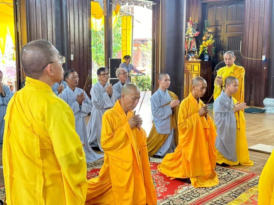 Mở đầu buổi lễ, ĐĐ. Thích Nguyên Trung - Trưởng ban Nghi lễ GHPGVN huyện Tân Phú, Trụ trì chùa Vĩnh Giác, Trưởng BTC đại lễ đã cung thỉnh chư Tôn Hòa thượng quang lâm đàn tràng niêm hương cầu nguyện, khai khởi đàn tràng tại ngôi Đại hùng bảo điện chùa Vĩnh Giác.