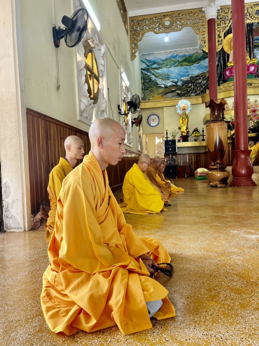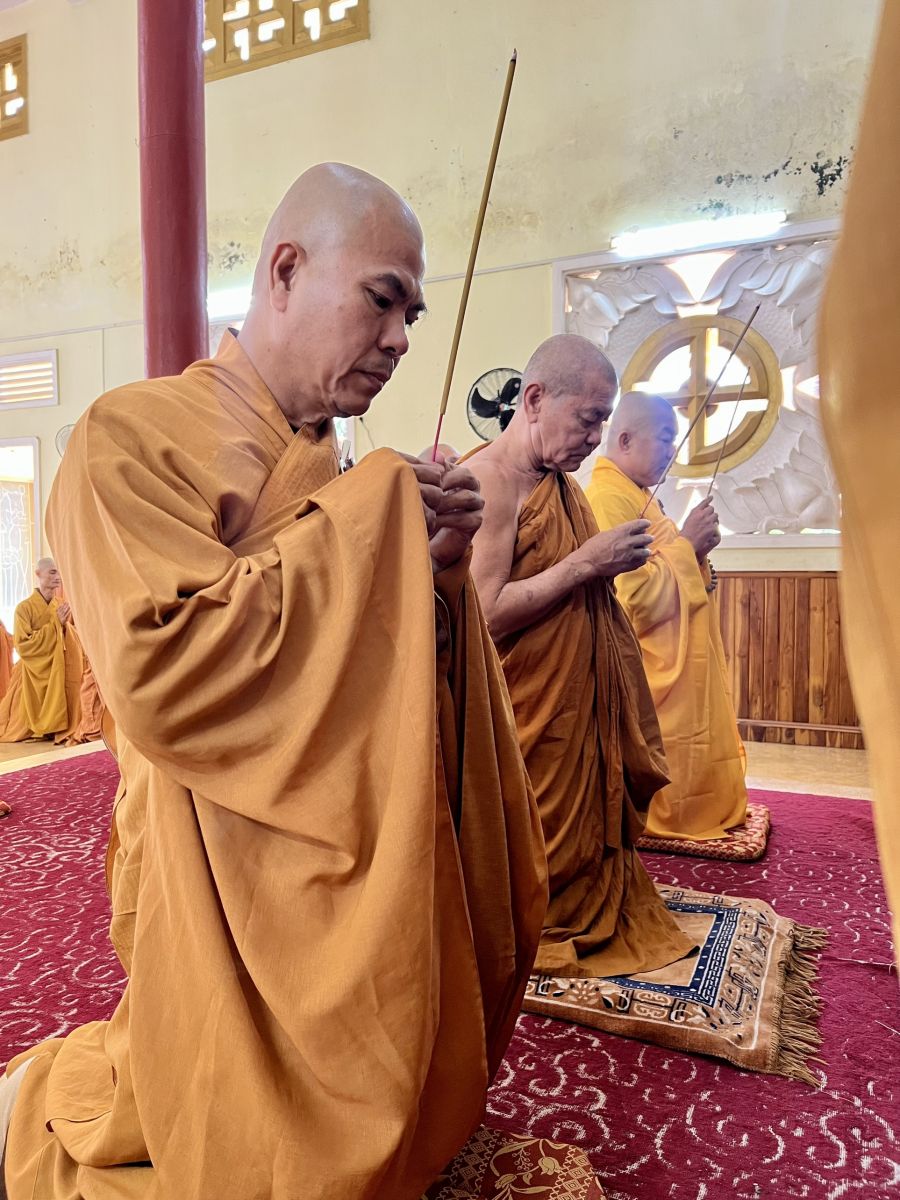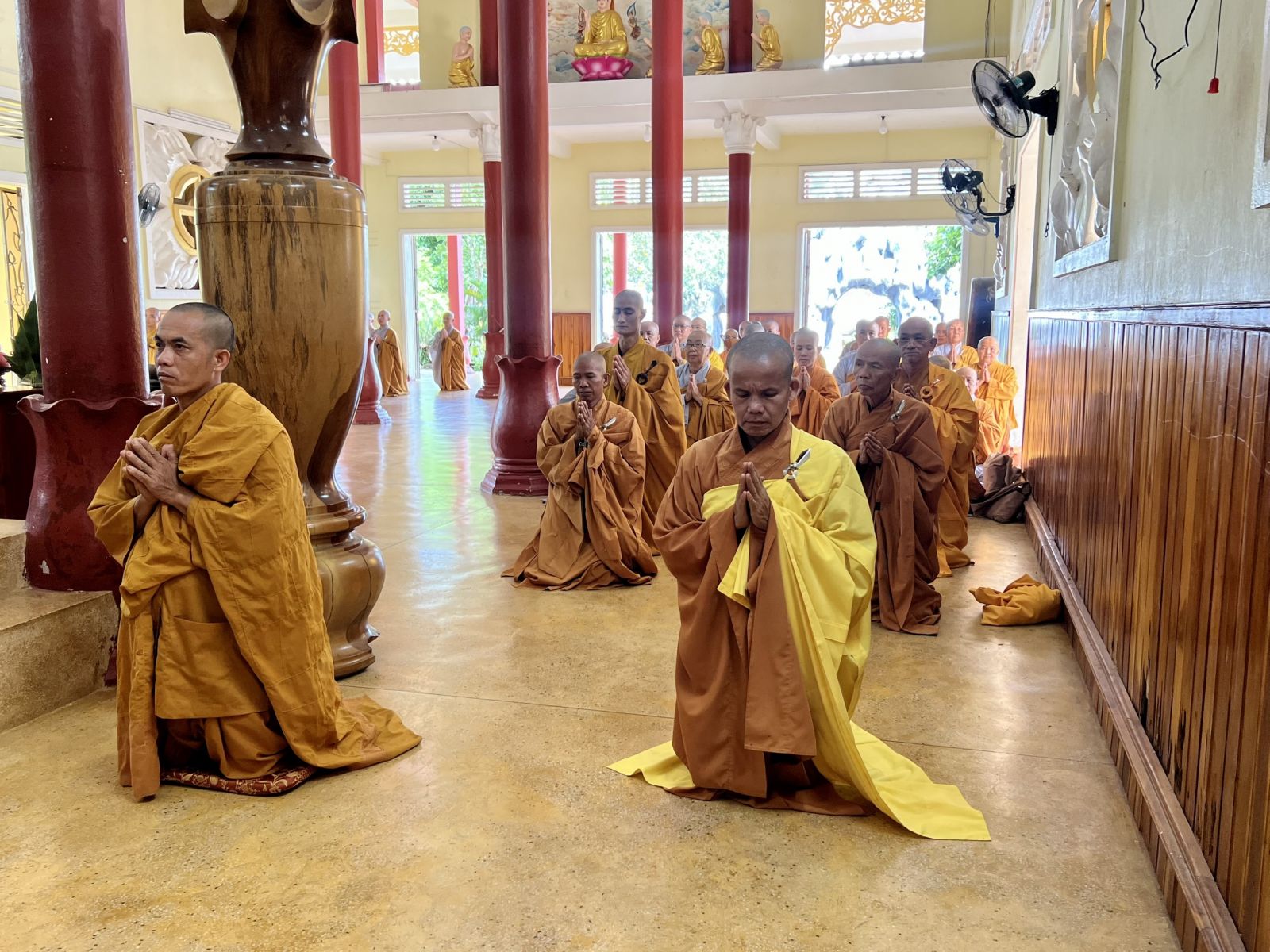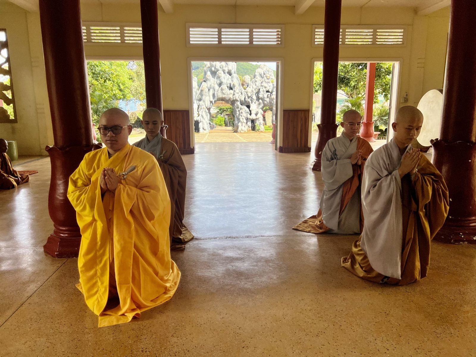Tại tổ đường, chư Tôn đức đảnh lễ lịch đại Tổ sư. Hoà thượng Thích Pháp Cần - Trưởng BTS GHPGVN huyện Tân Phú, Thiền chủ kiêm Hoá chủ Hạ trường cùng đại chúng vân tập chánh điện, niêm hương bạch Phật, đảnh lễ Tam bảo, tụng Đại bi chú và phát lồ sám hối theo pháp.