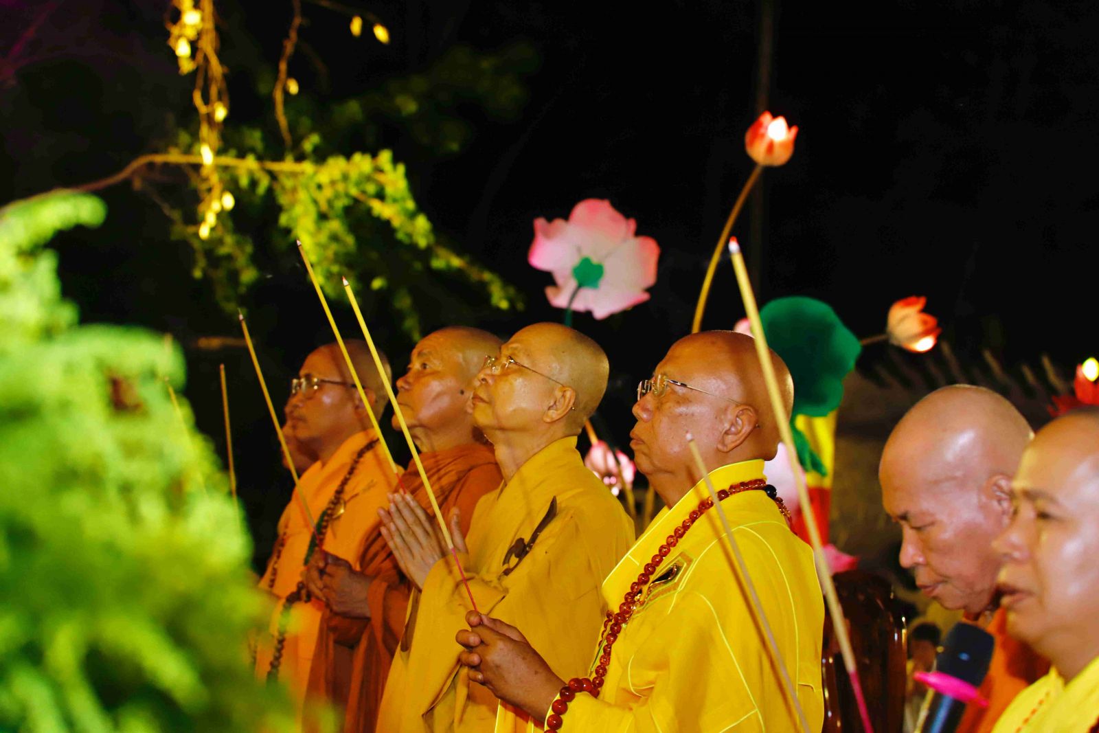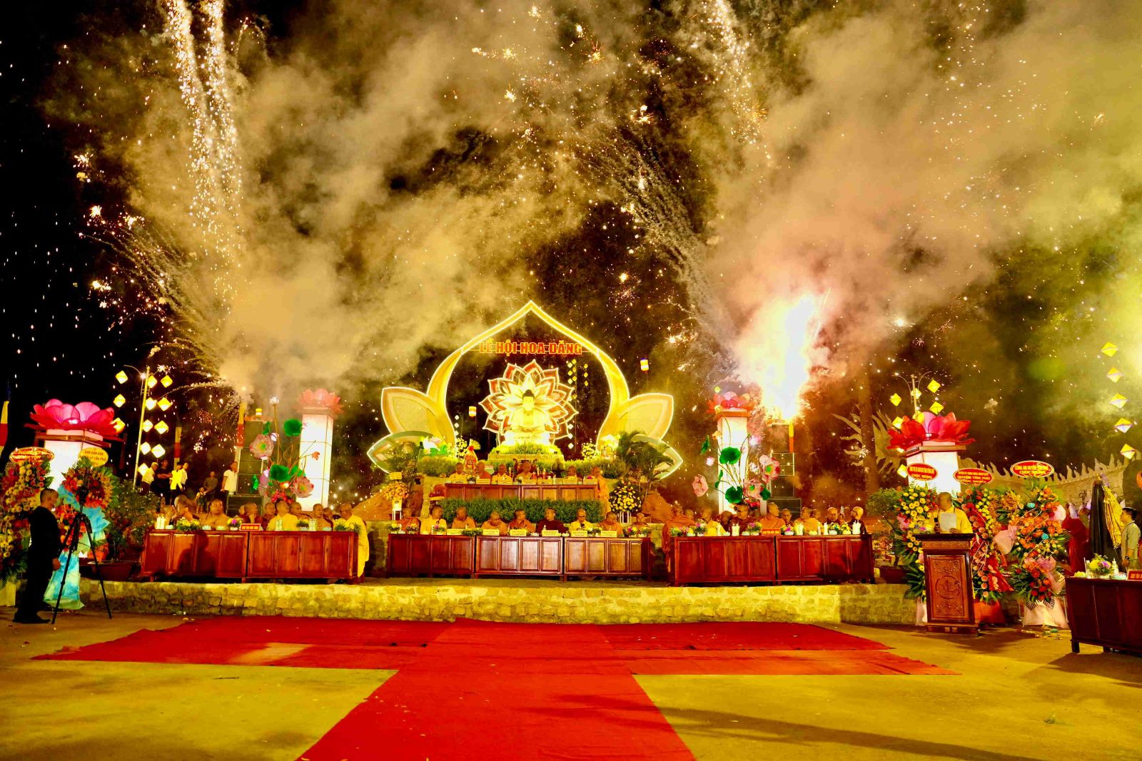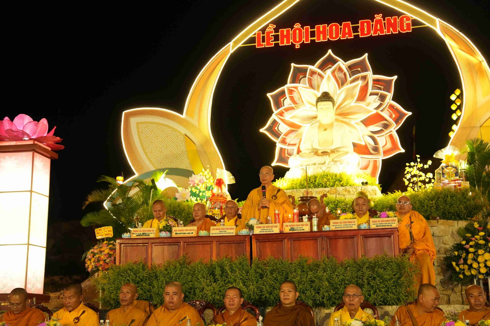 Tại buổi lễ, HT. Thích Pháp Cần đã phát biểu khai mạc chương trình đêm lễ hội hoa đăng, Thành kính niệm ơn chư Tôn túc Hòa thượng, Thượng tọa, Ni trưởng, Ni sư, Đại đức Tăng Ni và toàn thể Phật tử đã đáp lại lời mời về tham dự chương trình đêm lễ hội hoa đăng ý nghĩa này, đêm nay tại bầu trời Tân Phú trên đỉnh đồi thấp thoáng hay dưới triền xanh khoan nhặt, câu Phật hiệu linh thiêng thấm vào từng hàng cây kẻ lá, từng lối sỏi thân quen, tạo nên nếp duyên đầy Đạo vị. Nến đã thắp, hương đã giăng, tín nguyện chuyên cần, tâm thành đã sẵn, xin thay mặt Ban tổ chức, tôi xin trân trọng tuyên bố khai mạc lễ hội hoa đăng “Thắp sáng đêm A-di-đà”