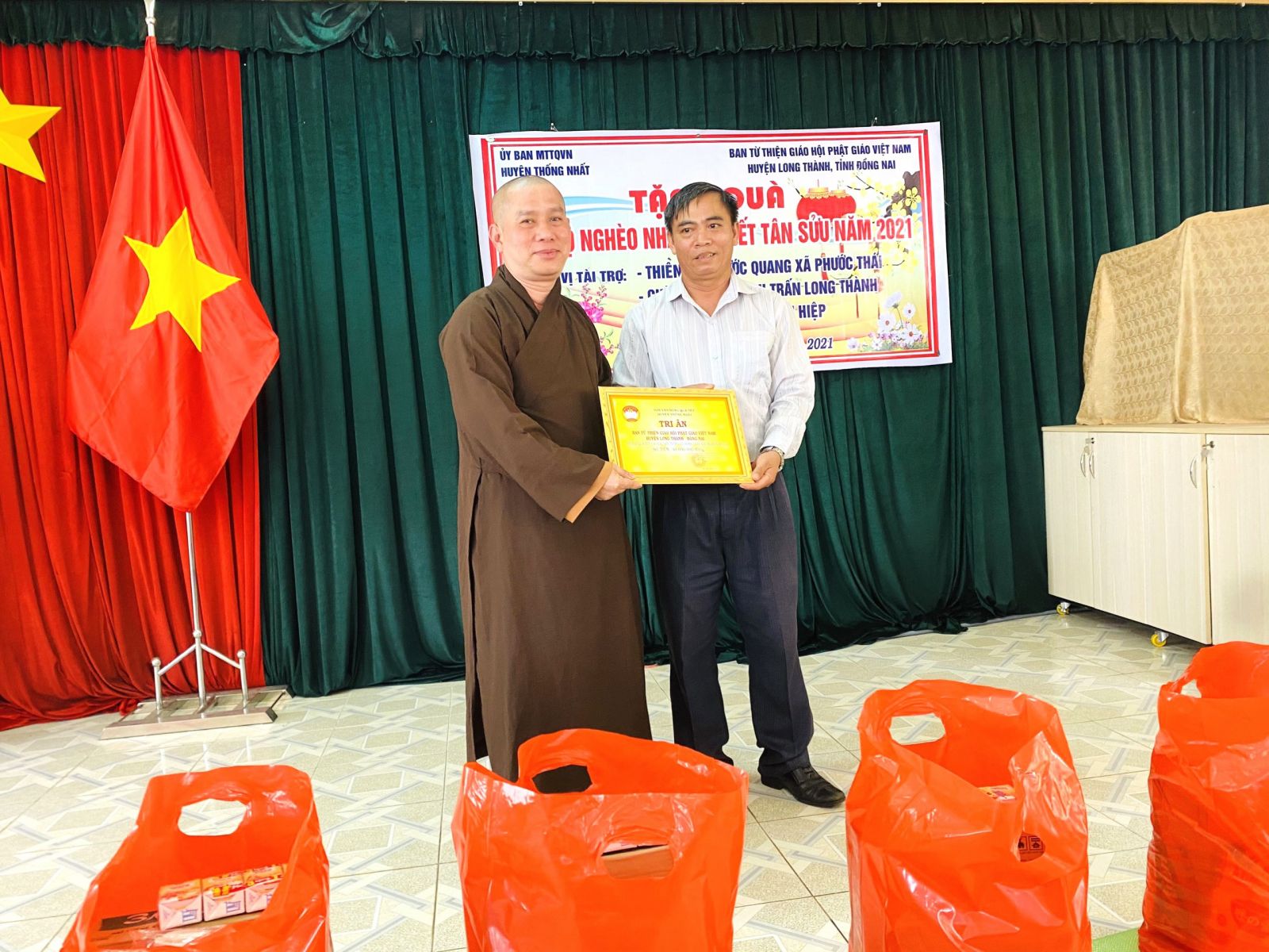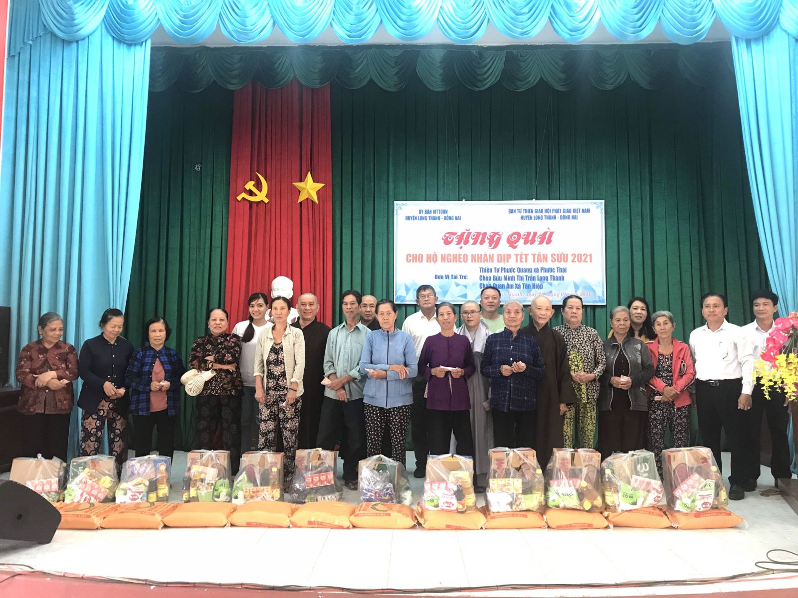 Nhân dịp Tết đến Xuân về, trong không khí chuẩn bị đón năm mới Tân Sửu 2021, đoàn từ thiện đã đến thăm và tặng 200 phần quà cho các hộ gia đình khó khăn. Mỗi phần quà bao gồm: 10kg gạo, 1 thùng mì, 1 lít dầu ăn, 1kg đường ăn, 1 hộp sữa đặc, 1 chai nước tương, 1 bịch bột ngọt, 1 bịch bột nêm, 1 lốc sữa tươi, 1 cái mền, 1 cái áo mới cùng bao thư tiền mặt 100.000 đồng. Tổng giá trị 200 phần quà là trên 100.000.000 đồng, do Thiền tự Phước Quang, chùa Bửu Minh, chùa Quan Âm cùng Đại Đức Thích Trúc Thông Nhuận, Cửa hàng sữa Phước Thái, Công ty Hiệp Tuấn Phát ủng hộ.