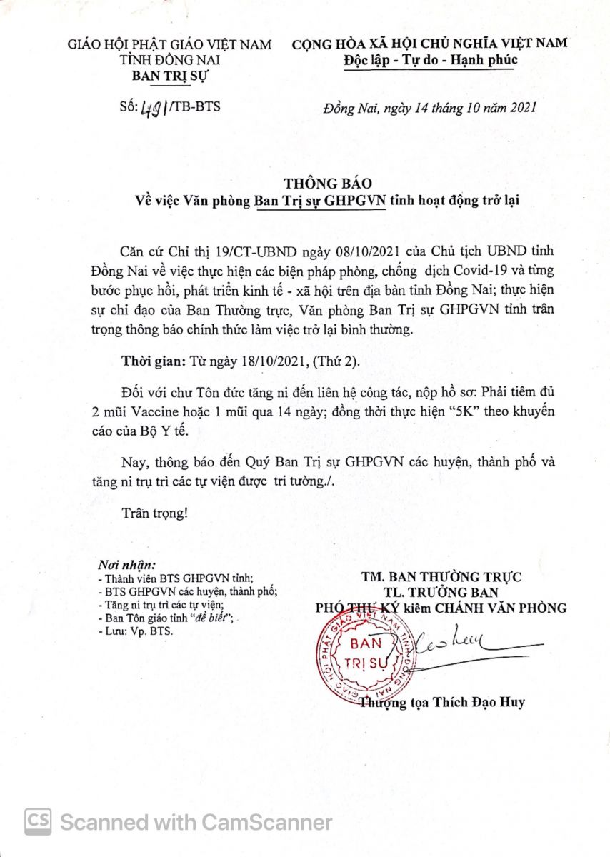 Căn cứ Chỉ thị 19/CT-UBND ngày 08/10/2021 của Chủ tịch UBND tỉnh Đồng Nai về việc thực hiện các biện pháp phòng, chống dịch Covid-19 và từng bước phục hồi, phát triển kinh tế - xã hội trên địa bàn tỉnh Đồng Nai; thực hiện sự chỉ đạo của Ban Thường trực, Văn phòng Ban trị sự GHPGVN tỉnh trân trọng thông báo chính thức làm việc trở lại bình thường.