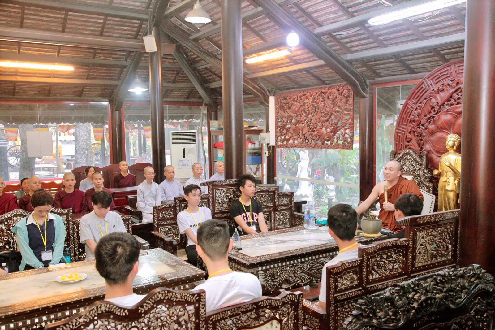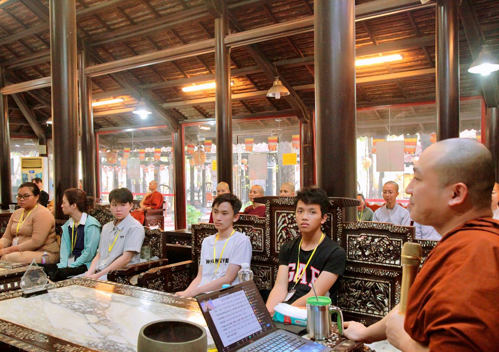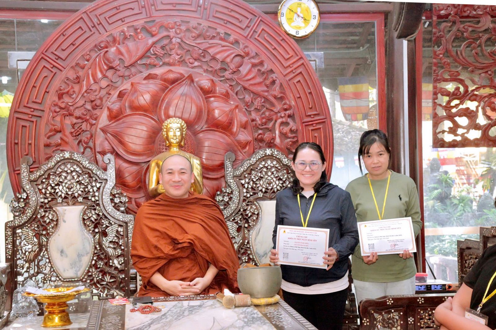 Tại khóa tu Một Ngày Bình Yên, theo sự điều phối của Hòa thượng trụ trì, đại đức Thích Phước Trí hướng dẫn khóa sinh tụng kinh Pháp cú phẩm: Già, Thế gian và Phật Đà, và chia sẻ đề tài: Tri Ân và Báo Ân Cha Mẹ.