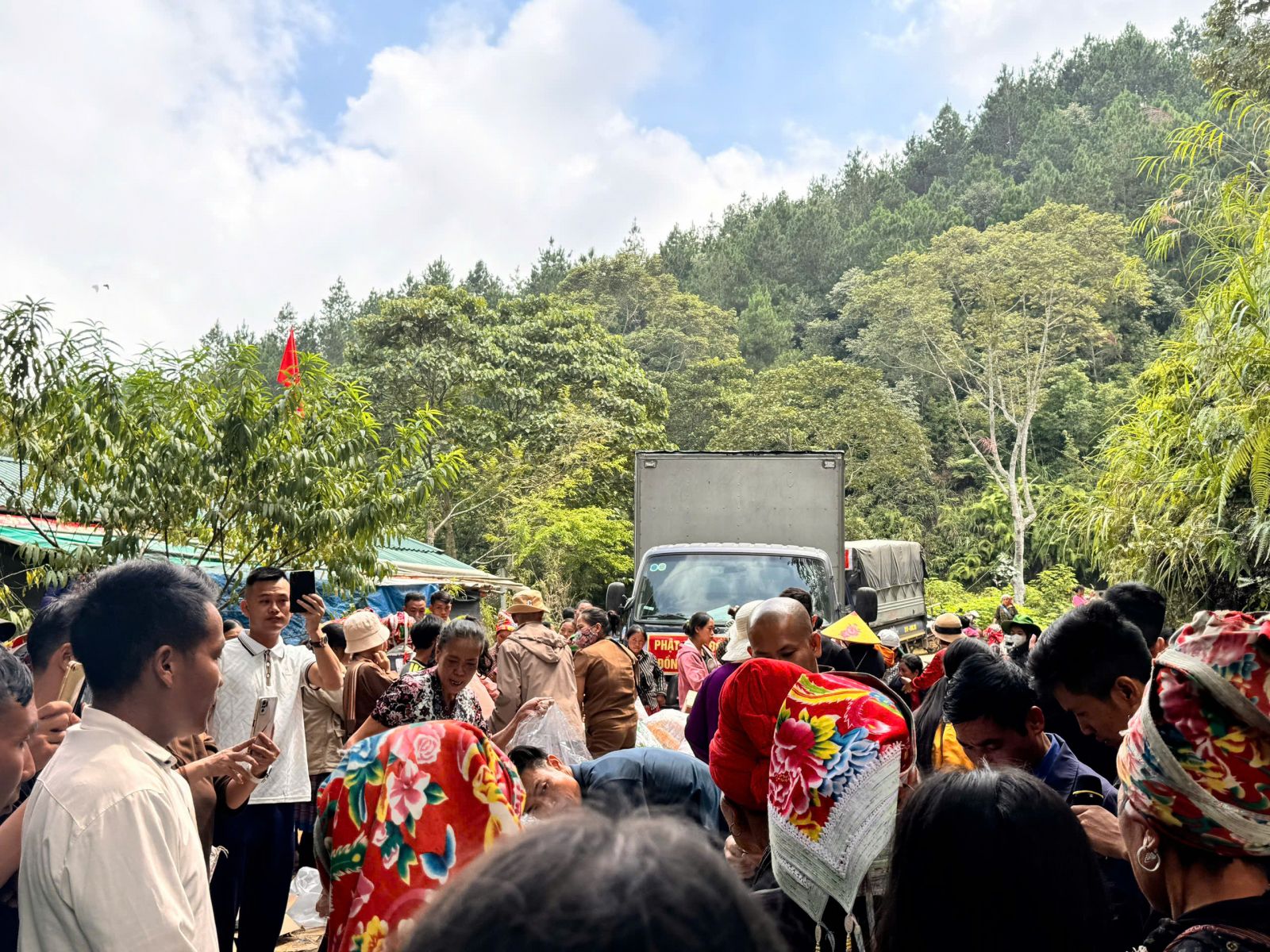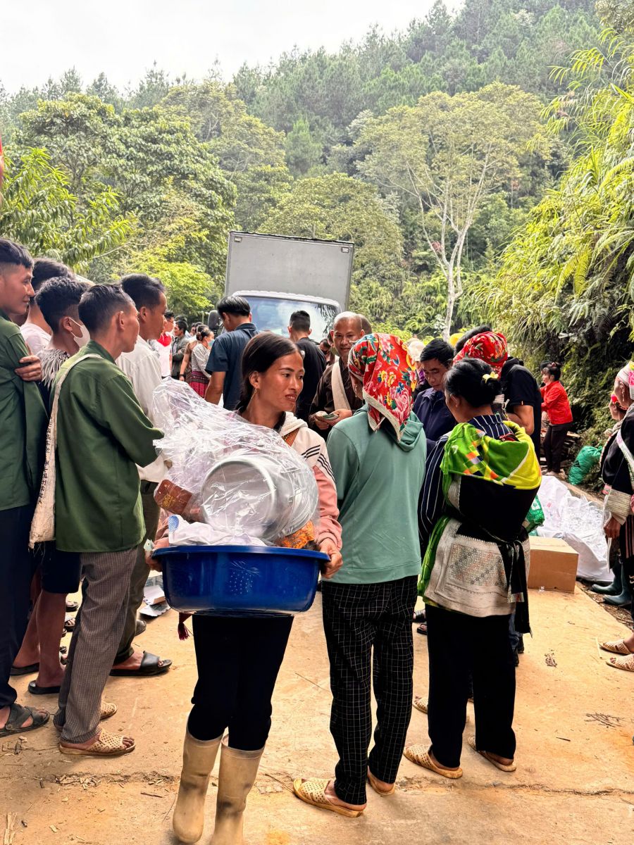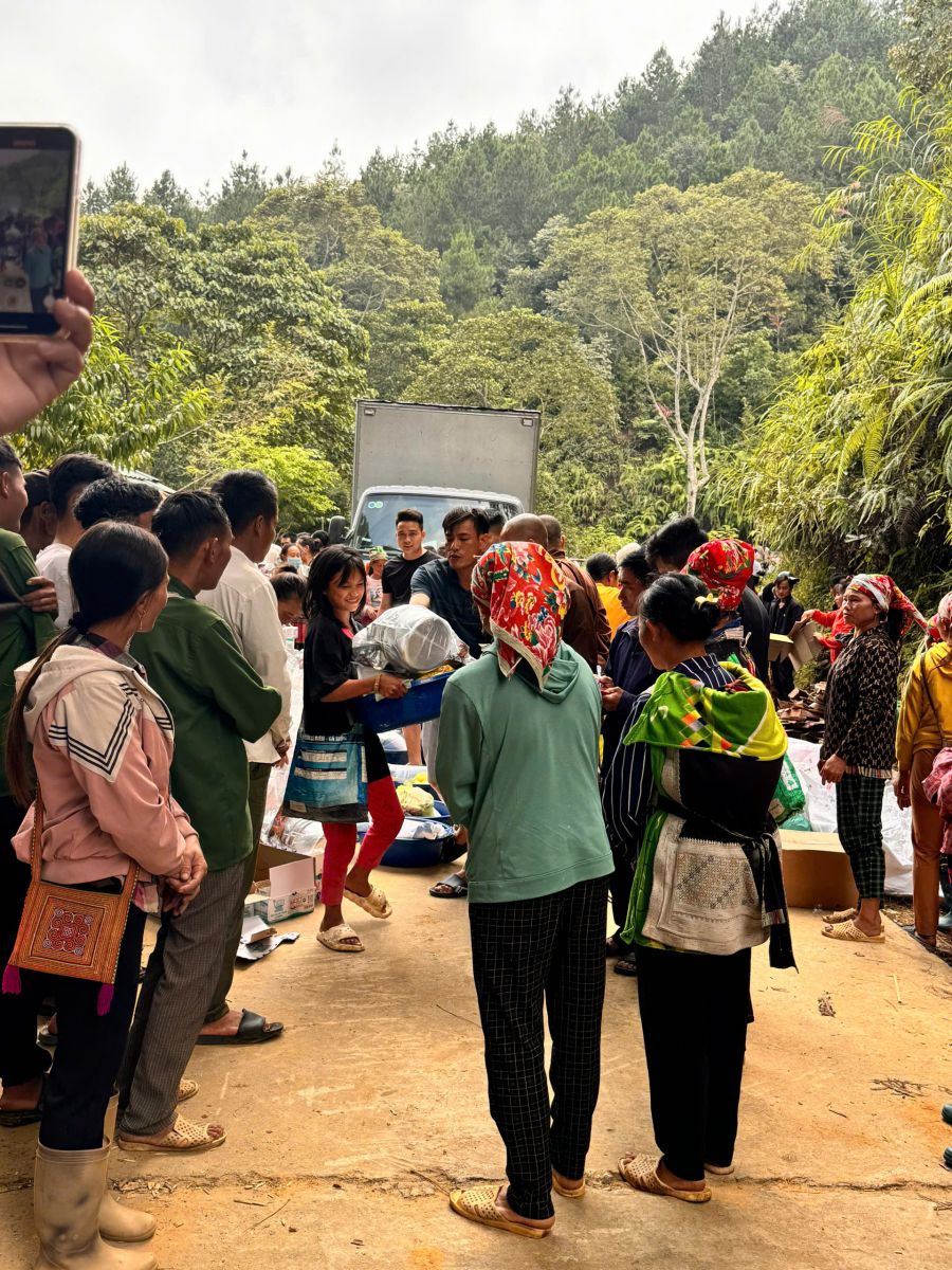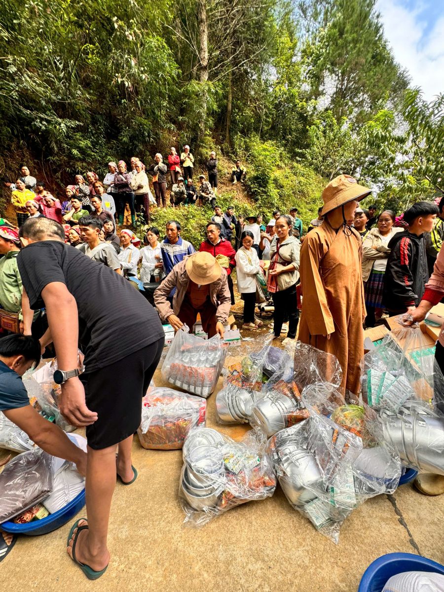 Điểm 1: Xã Y Tý, huyện Bát Xát, Lào Cai, phát 300 phần quà , trong đó mỗi phần gồm 5 cái nồi, thau giặt, 10kg gạo, mền, áo quần, gia vị …500 ngàn đồng tiền mặt,